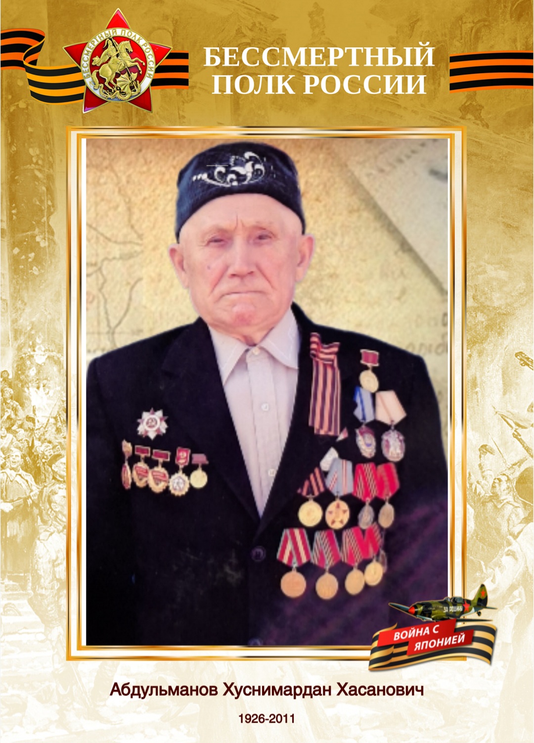 Абдульманов Хуснимардан Хасанович был призван на фронт в 1943 году. С 10.10.1943 года по 3.09.1945 года был на войне с Японией в составе - 352 стрелковый полк ПТР (Противо Танковой Роты). В августе 1946 году - 379 стрелковый полк 5 отд.стрел.- наводчик ПТР. В октябре 1947 году - 112 отд.стрел.полк - стрелок. В 1948 году - 613отд.стрел. зенитной артелерии - радист. В феврале 1949 году в/ч 32032 - старший радиотелеграфист РАФ. 14 января 1950 году вернулся на родину живой и здоровый.