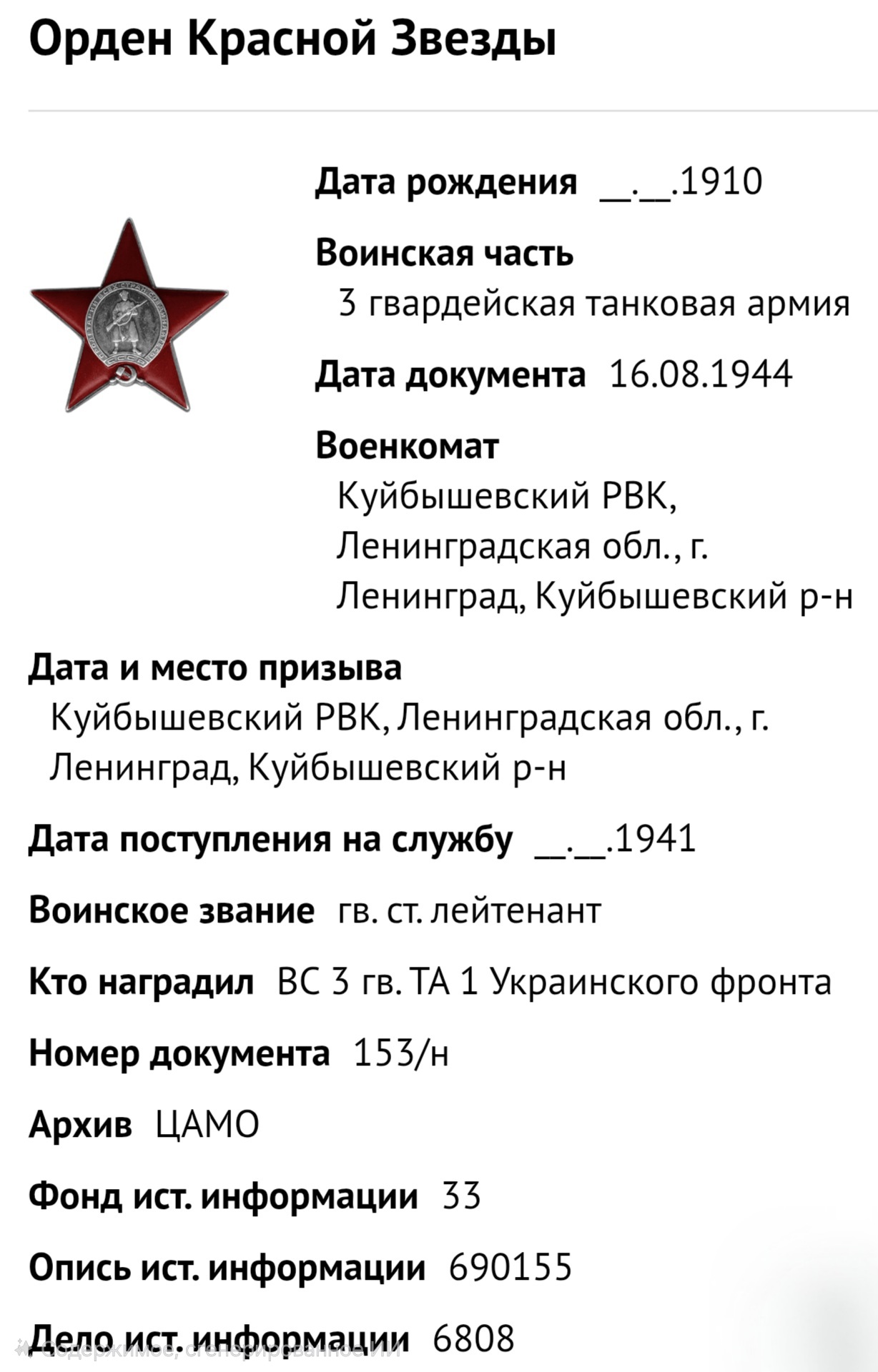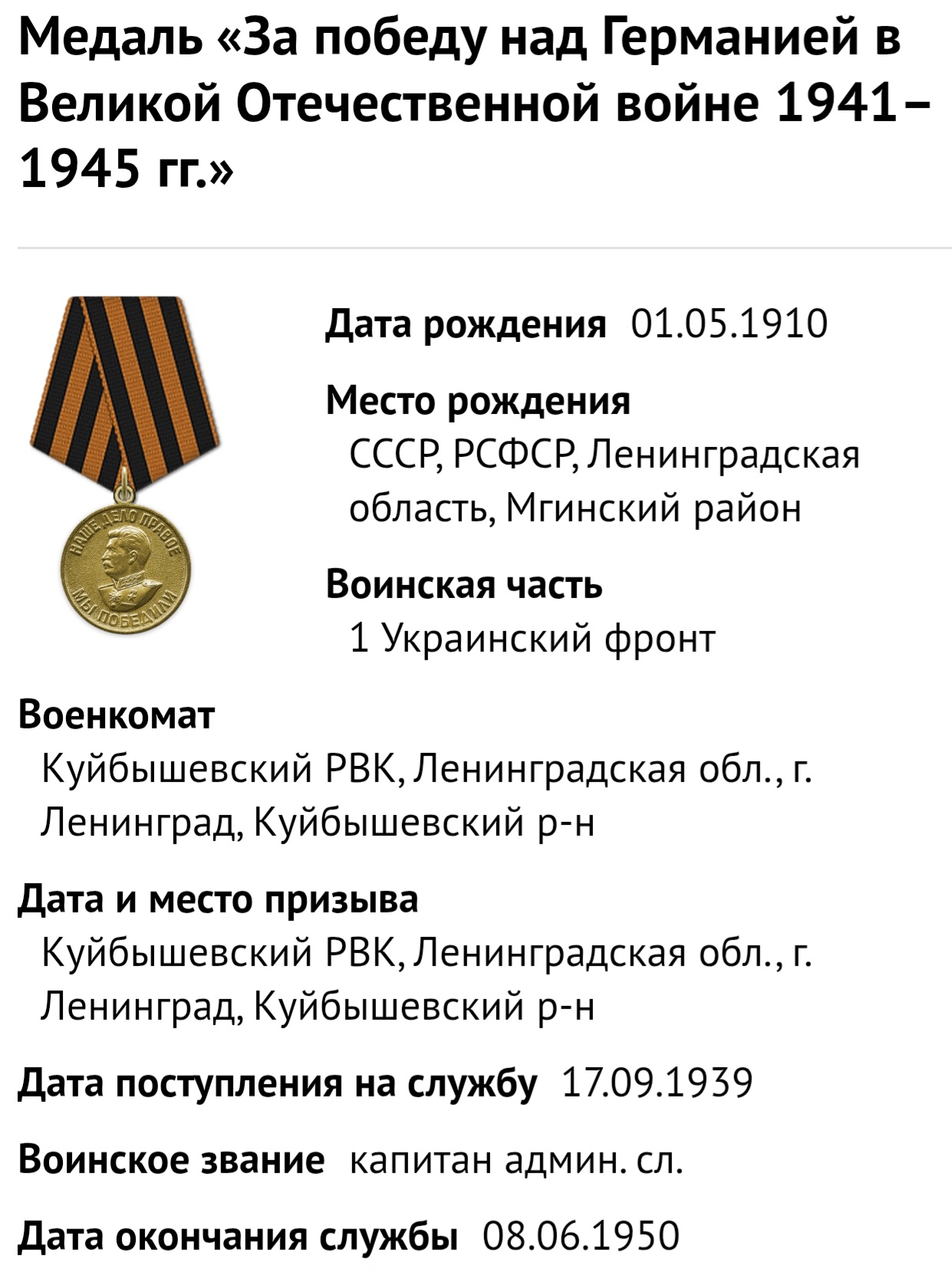 Место рождения: деревня Иваново, Лезьевский сельский совет, Мгинский район, город Санкт-Петербург
