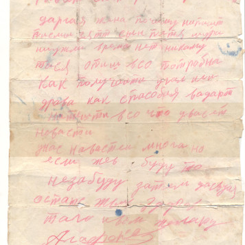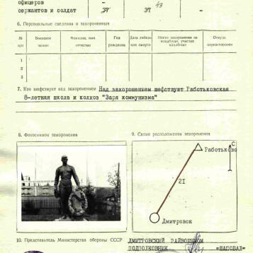 Агафонов Иван Андреевич родился в 1902 году в селе Сумы Сузунского района Новосибирской области. В семье было 5 детей, когда 6 октября 1941г. призвали на фронт. Известно только, что мой дед Иван Андреевич участвовал в боях за Москву и Курской битве, погиб 24.08.1943г. Был похоронен в братской могиле с. Березовка Сосковского района Новосибирской области и по предварительным данным в 1992г. проведено перезахоронение в братскую могилу с. Работьково Дмитровского района Орловской области.