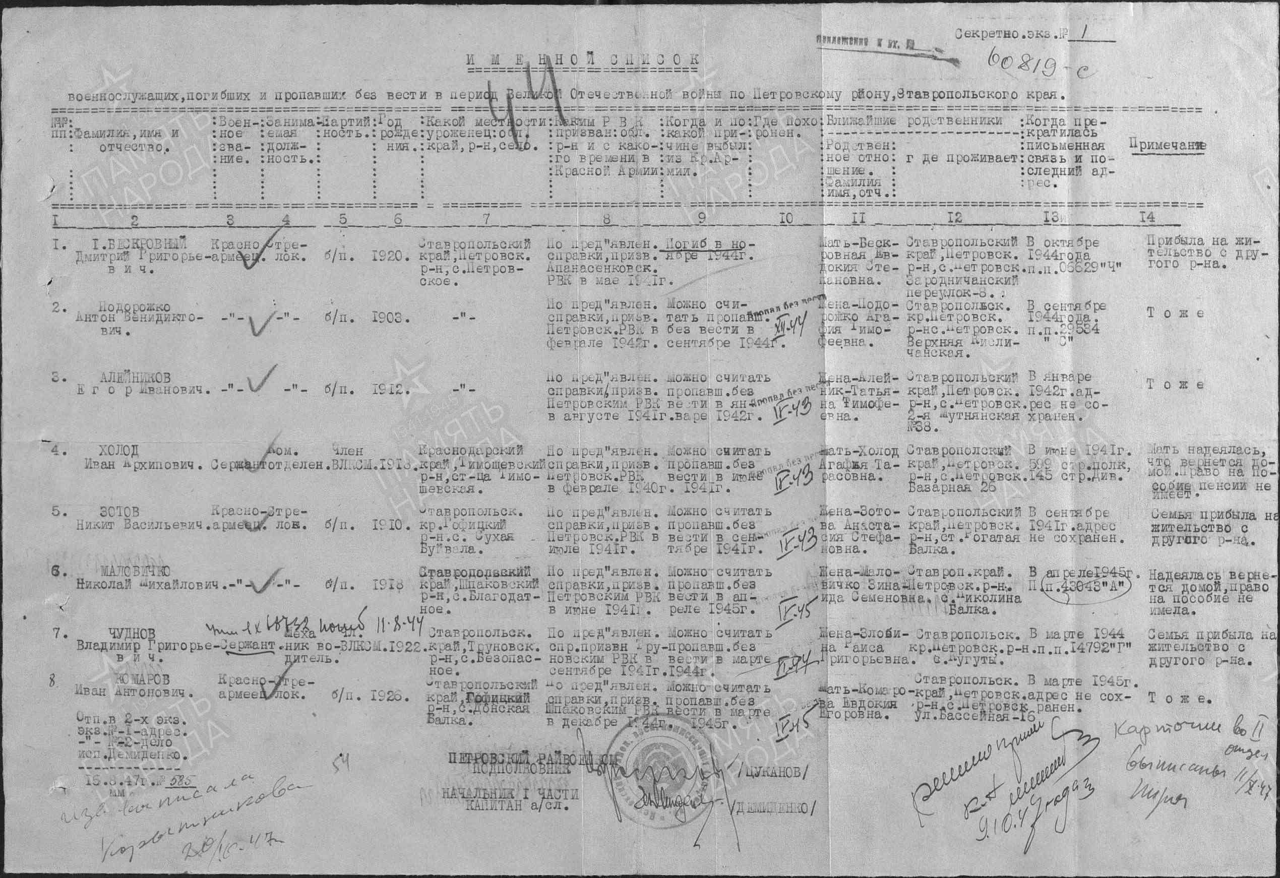 Алейников Егор Иванович был призван в ряды Красной армии в августе 1941 г. в звании красноармейца Петровским РВК Петровского района Ставропольского края. В январе 1942 г. пропал без вести. В апреле 1943 г. официально признан пропавшим без вести.