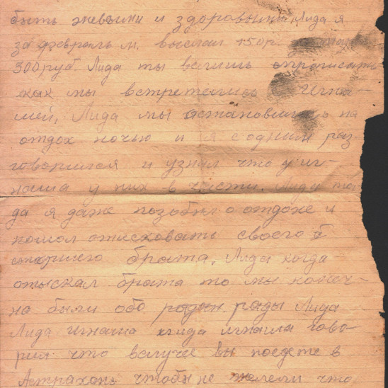 До войны Игнат и Лидия часто переписывались, если им приходилось уезжать работать в другой город. И во время войны Игнат регулярно писал письма своим родным в тыл, а когда в июле 1942 года призвали и его младшего брата Константина, то и ему. Писал обо всём: о самочувствии,