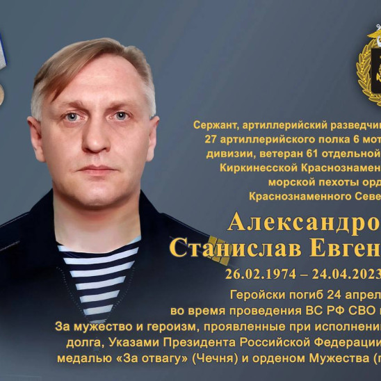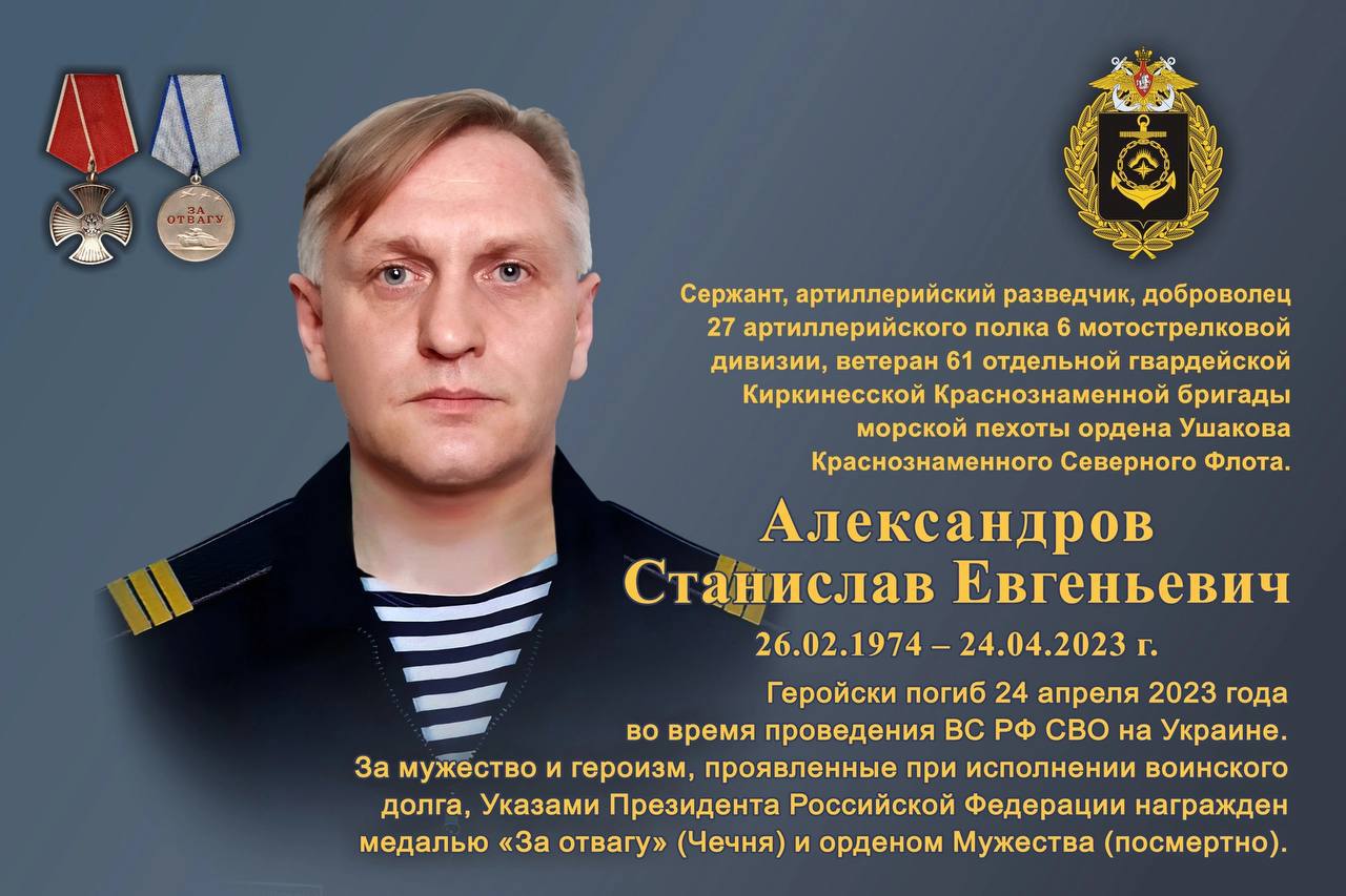 Александров Станислав Евгеньевич родился 26 февраля 1974 года в городе Ленинграде. Занимался прыжками с парашютом, водолазным спортом. С июня 1992 по декабрь 1993 служил в 61-ой бригаде Морской Пехоты «Спутник»(в/ч 70134). После нес службу в органах внутренних дел. С ноября 1999 по март 2000 принимал участие в боевых действиях на территории Чеченской республики, впоследствии был награжден медалью «За отвагу«. В сентябре 2022 года добровольно стал участником специальной военной операции, 24.04.2023 погиб в селе Подгорное. Награжден орденом Мужества посмертно. Позывной «Бродяга».