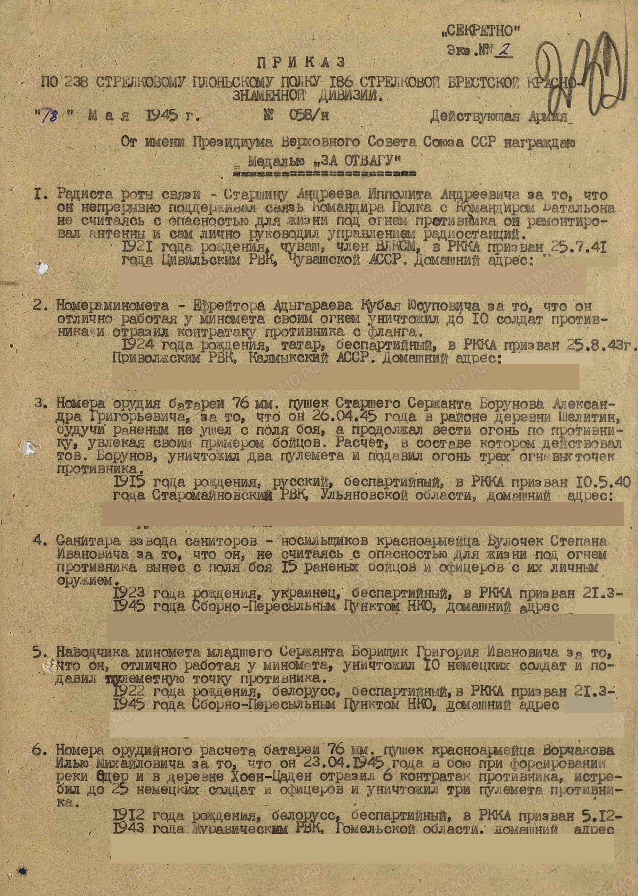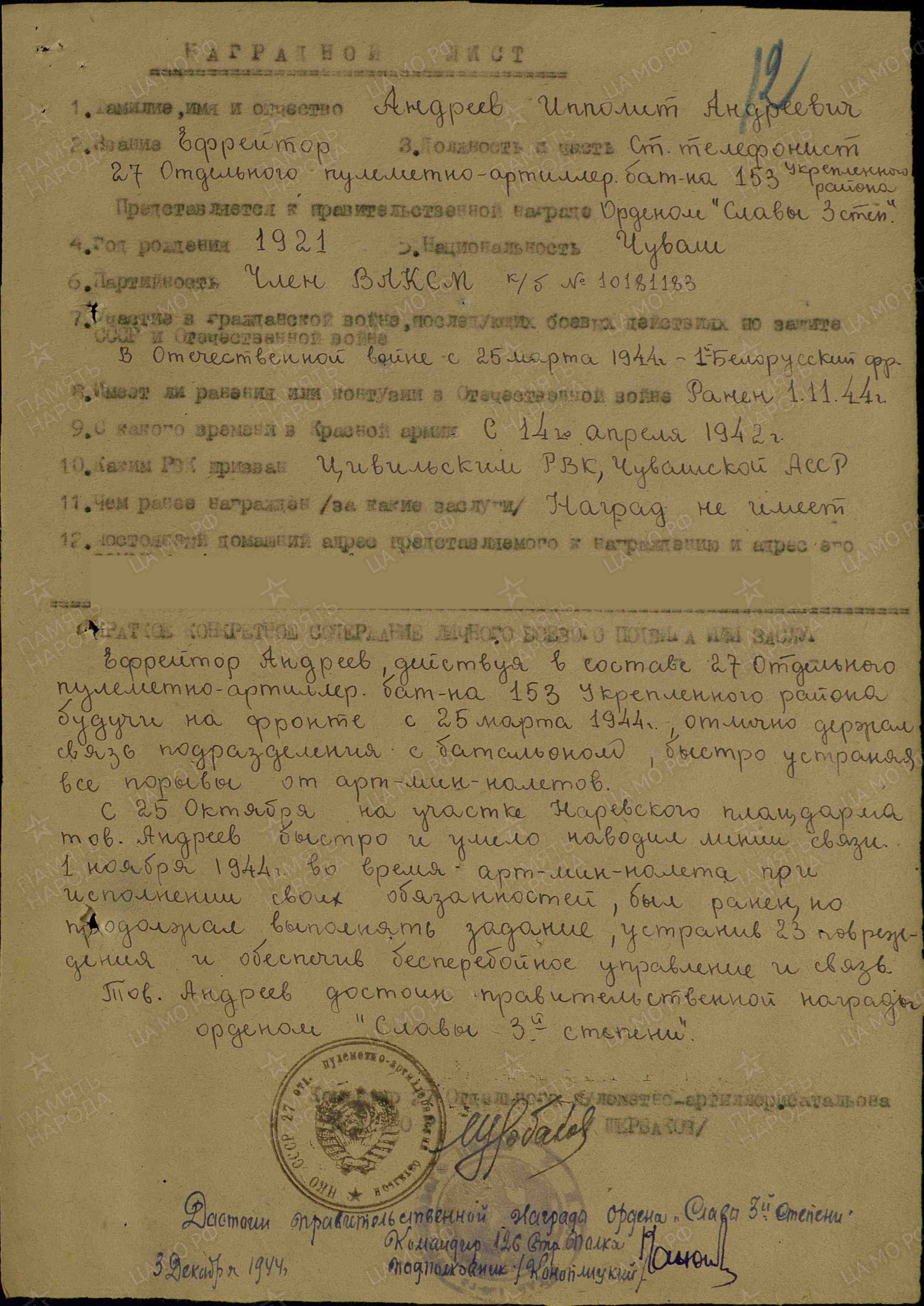 Орден Отечественной войны I степени Орден Славы III степени (2) Медаль «За отвагу» (2) (2) Медаль «За победу над Германией в Великой Отечественной войне 1941–1945 гг.»