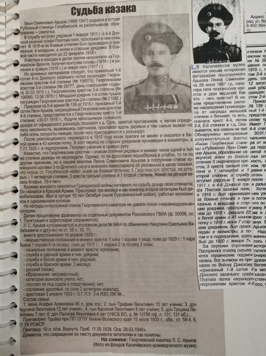 Леон Семенович Арьков (1889-1947) родился в хуторе Рубежный станицы Голубинской, из раскольников, образование самоучка. В службу вступил рядовым 1 января 1911 г. в 4-й Донской казачий графа Платова полк, прослужил в нем семь лет. В 1916-м за боевые отличия был произведен в приказные, в младшие, а затем и старшие урядники. В бое вой части находился до 22 февраля 1918 г. Участвуя в походах и делах против неприятеля на Германском фронте, получил контузии головы (1914 г.) и ранения в правую (1916 г.) и левую ноги (1917 г.) Из архивных материалов следует, что приказный 1-й сотни 4-го Донского казачьего полка награжден Георгиевским крестом 4-й степени (№ 199579), Георгиевским крестом 3-й степени (№ 29777, день совершения подвига 30.03.1915 г.), Георгиевским крестом 3-й степени (№ 106966, 12.08.1915 г.). Младший урядник 1-й сотни Арьков награжден Георгиевским крестом 2-й степени (№ 21580.) Приказом по 5-й армии №№ 139 от 1915 г. приказный 1-й сотни Леон Арьков, награждённый Георгиевским крестом 4-й степени, представляется к Георгиевскому кресту 3-й степени: «30.01.1915 г., будучи начальником головного дозора от офицерского разъезда, подошел к д. Суль, занятой противником, и, желая определить численность, вызвавшись охотником, проскакал вдоль деревни и тем самым вызвал на себя огонь полуроты немцев, после чего присоединился к разъезду». После революционного переворота в 1917 году казак присяги не менял и оказался в Бепой армии в 43 конном полку. В этот период из старших урядников произведен в вахмистры, а 7.01.1920 г. в подхорунжие. Получил ранение в правую руку. Известно, что Георгиевским крестом знаком отличия рядовых и нижних чинов одной и той же степени дважды не награждали. Однако, то ли фронтовая неразбериха в штабах, то ли по другим причинам, но о нашем земляке Леоне Семеновиче Арькове в послужном списке командного состава 2-го Донского округа военного комиссариата об уволенных в запас сказано, что «казак ст. Голубинской имеет знаки за боевые отличия: 5 Георгиевских крестов, из которых - 1 четвертой степени, 3 креста третьей степени и 1 второй степени. Женат на дочери казака Агафье, 33-х лет». Кружево военного лихолетья Гражданской войны наложило на судьбу донца свой отпечаток. Он оказался в Красной Армии. Прослужил три месяца и как инвалид второй категории был де мобилизован. Жил в хуторе 10 лет Октября (ныне Суровикинский район), работал колхозни ком в одноименном колхозе. Но награды и послужной список Георгиевского кавалера не давали покоя «неравнодушным» соседям. Далее процитируем фрагменты из отдельных документов Российского ГВИА (Ф. 50058, оп. 1. Пунктуация и орфография сохраняются). Л.С. Арьков «упоминается в уголовном деле № 9464 по обвинению Никулина Емельяна Васильевича и других) по ст. 58 п. 10, 11; анкета арестованного 14 апреля 1933 г.: - имущественное положение в момент ареста: 1 хата 1 корова 1 овца; тоже до 1929 г.: 1 пара Быхов 1 корова 5 га посеву, тоже до 1917 г.: 1 корова 2 га посеву 2 казы; - социально положение в момент ареста: колхозник - служба в царской армии и чин, урядник, - служба в белой армии и чин: рядовой: - служба в Красной армии: 3 месяца; - русский (казак); - образование: неграм (отный); категория воинского учета: нет; - состоял ли под судом и следствием: нет; - состояние здоровья: со слов 2 категории инвалид - арестован 3 апреля 1933 г. О.Г.П.У. 3-й ИЗО 28К №№.... Состав семьи: 1. жена Агафия Аликсеева 45 л. дом хоз. 2. сын Трафим Леонтивич