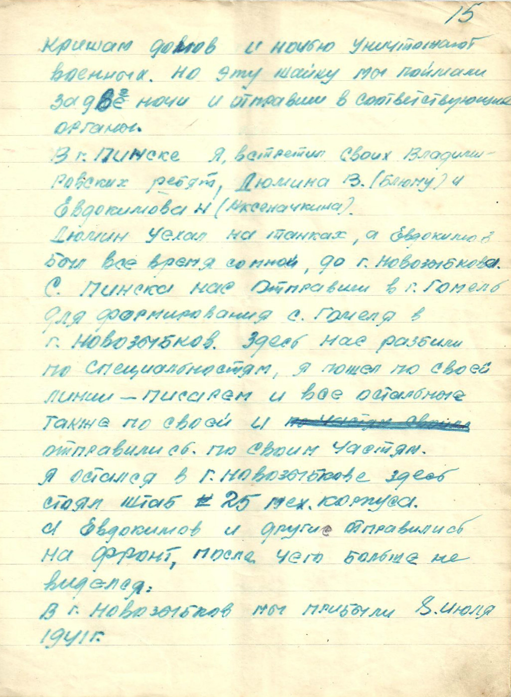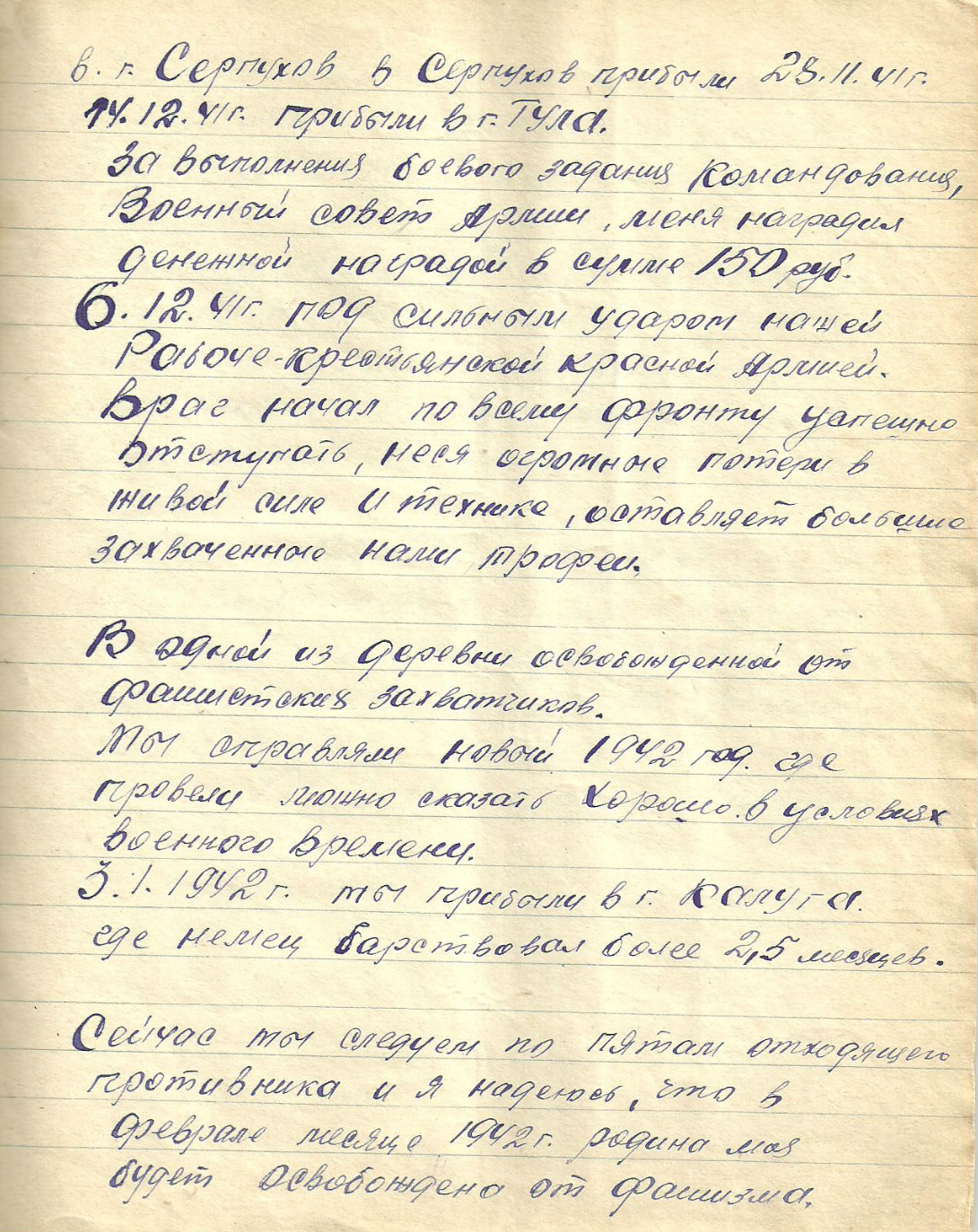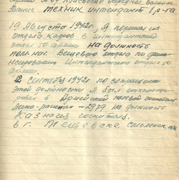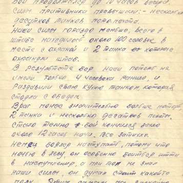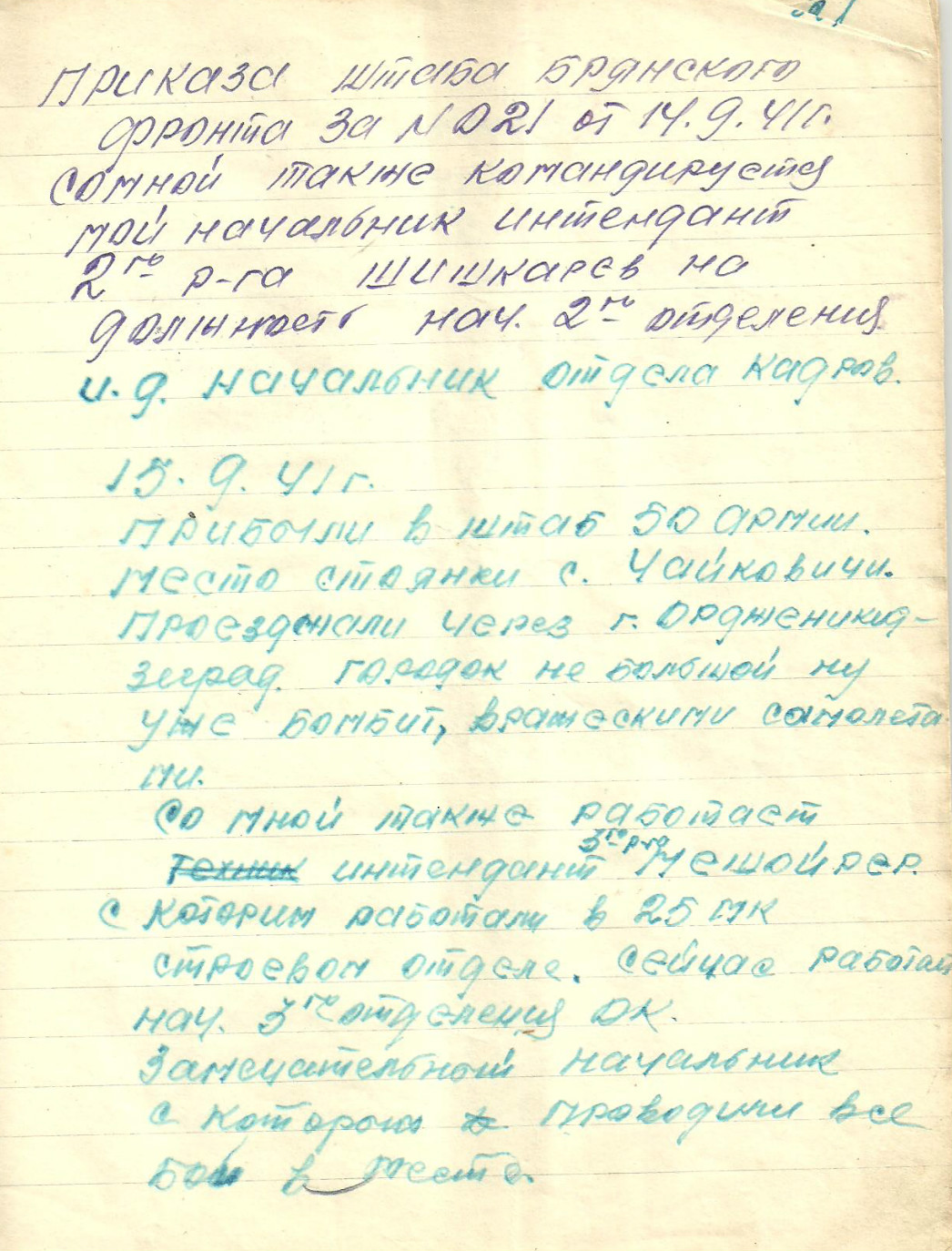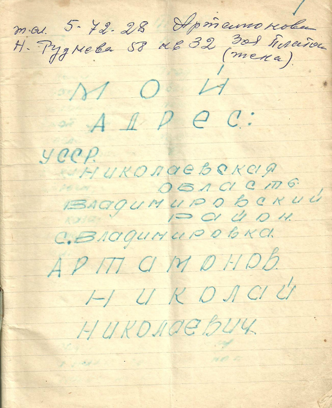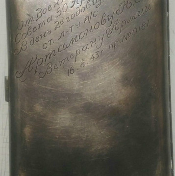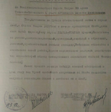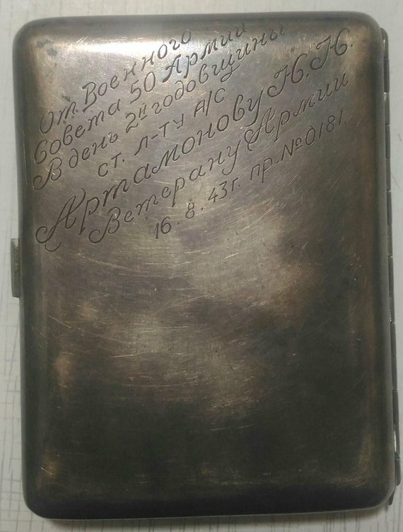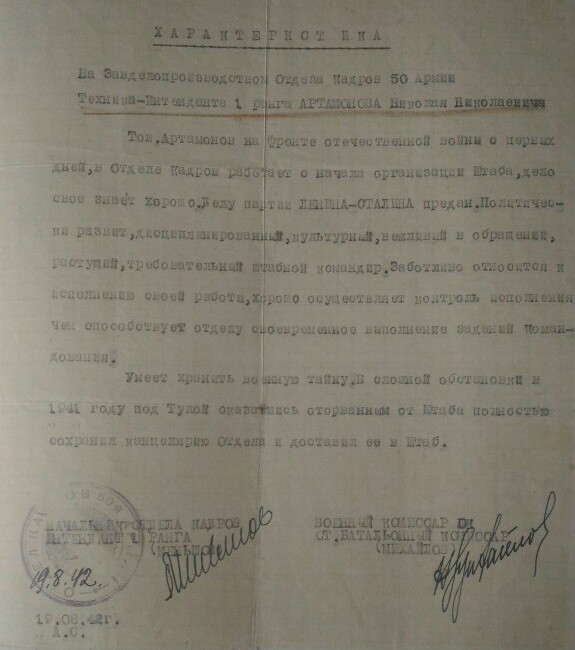 Мой дедушка Артамонов Николай Николаевич родился 07 января 1920 г., в с. Владимировка, Николаевской области УССР. 01 сентября 1940 г. был призван в ряды Советской армии Владимирским РВК. До ВОВ проходил военную службу в 22 легко-танковой бригаде, 4 Армии Белорусского Особого военного округа. Часть эта находилась в г. Брест-Литовск, в 8 км, западнее от города, близ германской границы. Война застала дедушку в первый день, 22 июня 1941г. При неожиданном массированном натиске немецких войск, их бригада не приняла боя – отступила. При отступлении, часть личного состава бригады прибыла в г. Ново-Зыбков, Белорусской ССР. В Ново-Зыбкове формировались новые войсковые части. При подходе немецких войск эти, еще полностью не сформированные части отступали по направлению в г. Могилев. В Могилеве, в начале июля 1941 г. дедушка попал в штаб 25 Мех. корпуса- строевой отдел на должность ст. писаря. Уже в августе 1941г. Этот мех. корпус был расформирован и на базе штаба корпуса и других штабов соединения был сформирован штаб Брянского фронта, где дедушка и проходил службу в отделе кадров фронта. В сентябре 1941г. Был переведен в отдел кадров 50 Армии. За отличное выполнение своих обязанностей мой дедушка был награжден серебряным портсигаром, вот что написано в его характеристике: «…умеет хранить военную тайну. В сложной обстановке в 1941 году под Тулой оказавшись оторванным от Штаба полностью сохранил канцелярию Отдела и доставил ее в штаб…» А в 1944 г. за своевременное выполнение своих функциональных обязанностей мой дедушка был награжден Орденом «Красной звезды». Описание подвига: "Старший лейтенант а/с АРТАМОНОВ в Отделе кадров 50 армии работает с момента организации армии. За 3 года работы в отделе вырос от писаря до помощника начальника 2 отделения.На всем протяжении своей работы проделывает исключительную работу с своевременным выполнением заданий Командования. Быстро и не допуская ошибок отрабатывает наградной материал для доклада Военному Совету армии. В самых трудных условиях ежедневного движения в пути за наступающими частями тов. Артамонов сумел обеспечить вывоз медалей приказов о награждении и немедленно доводит их до сведения командиров частей.Неоднократно Артамонову давались сложные поручения по доставке орденов и медалей частям и соединениям, с этой задачей тов. Артамонов всегда справляется хорошо.08.07.1944 юго-восточнее Минска в районе д. Добренева противник пытаясь выйти из окружения группой около 300 чел. напали на штаб армии, завязался короткий бой по уничтожению этой группы. Тов.Артамонов спокойно и мужественно выполнял все поручения начальника, ему было поручено вывезти автомашину с документами в безопасное место. Презирая опасность для жизни под ружейно-автоматным огнем противника тов. Артамонов погрузил ордена и имущество на машину и вывел машину в безопасное место".