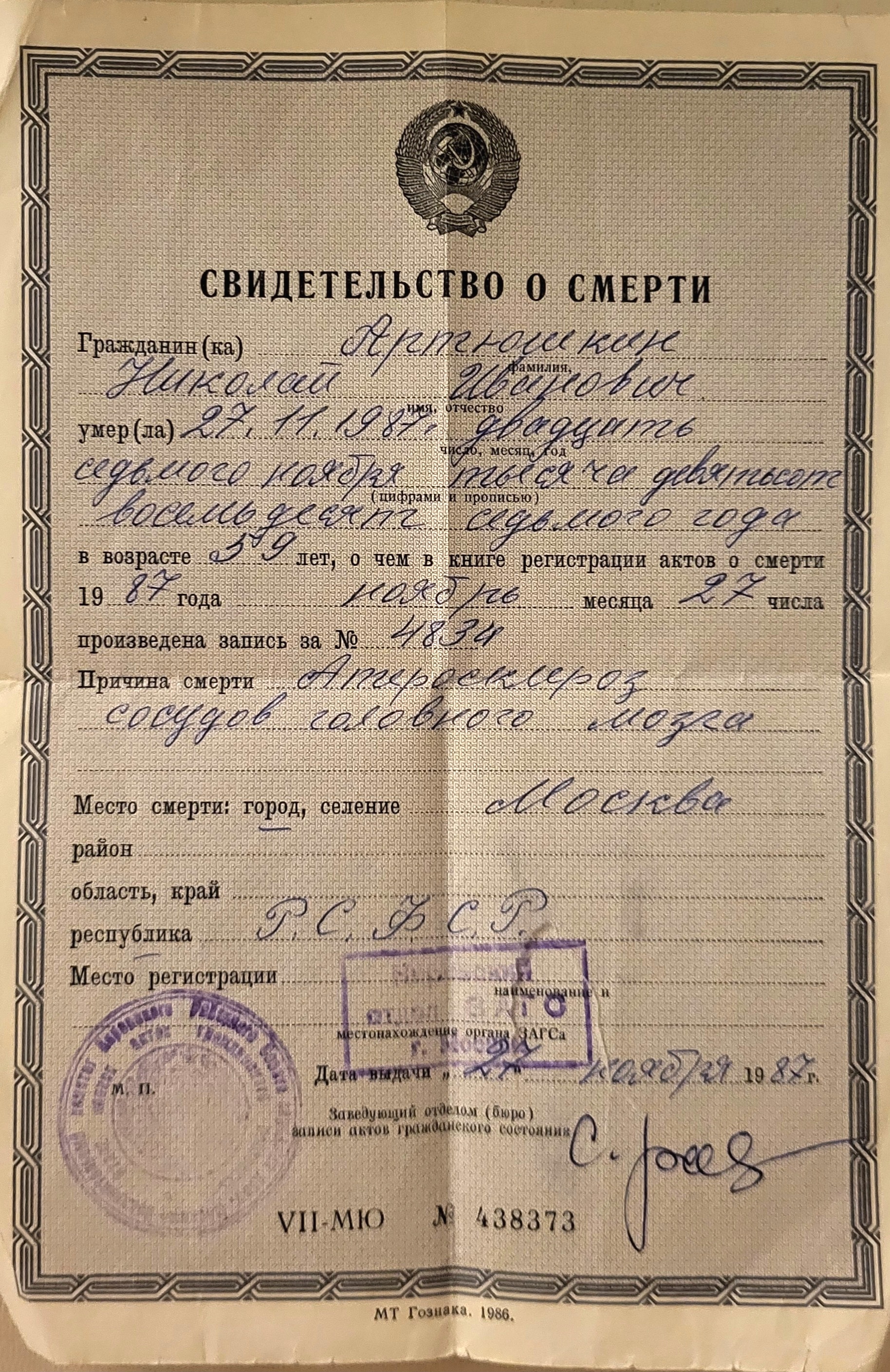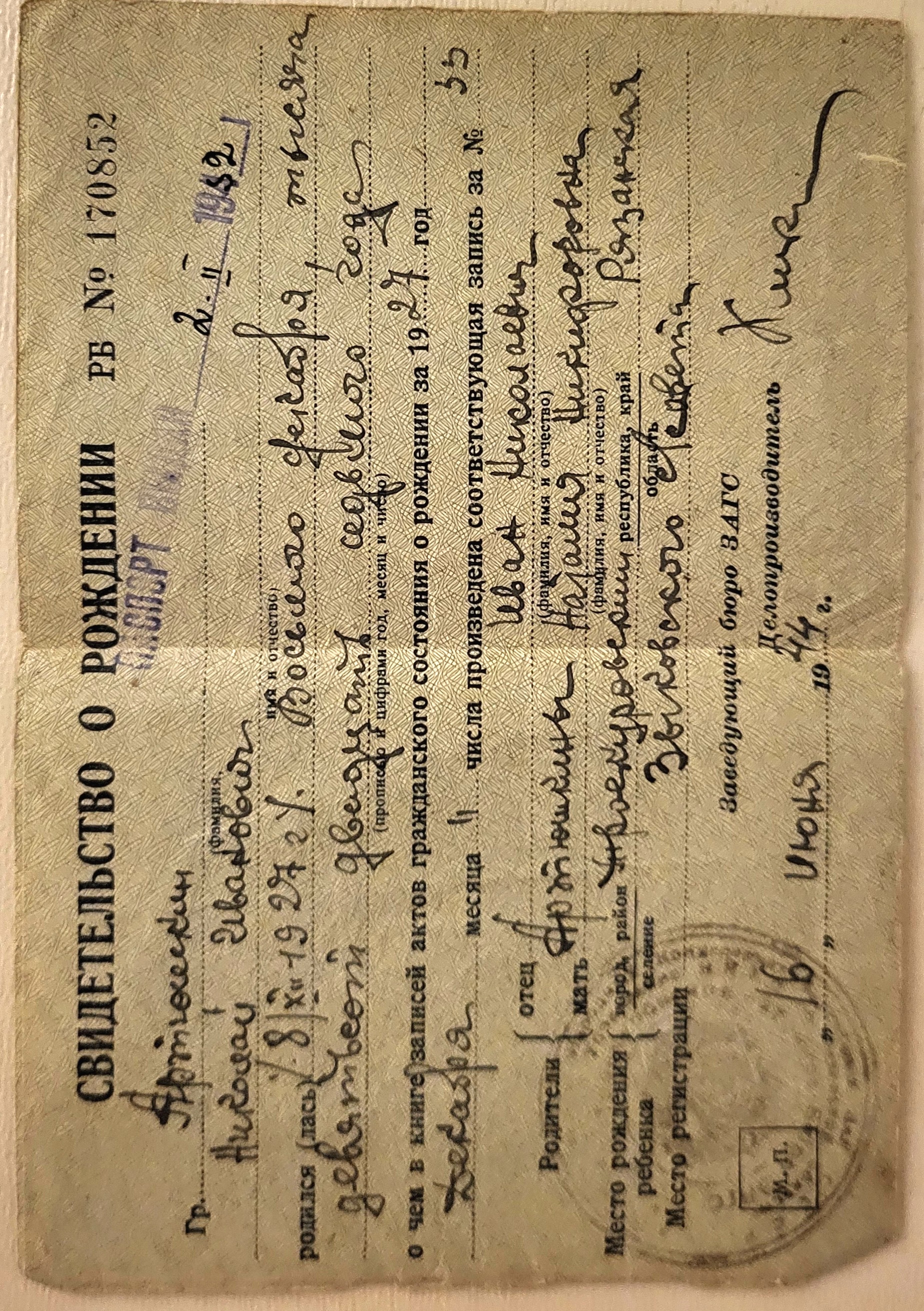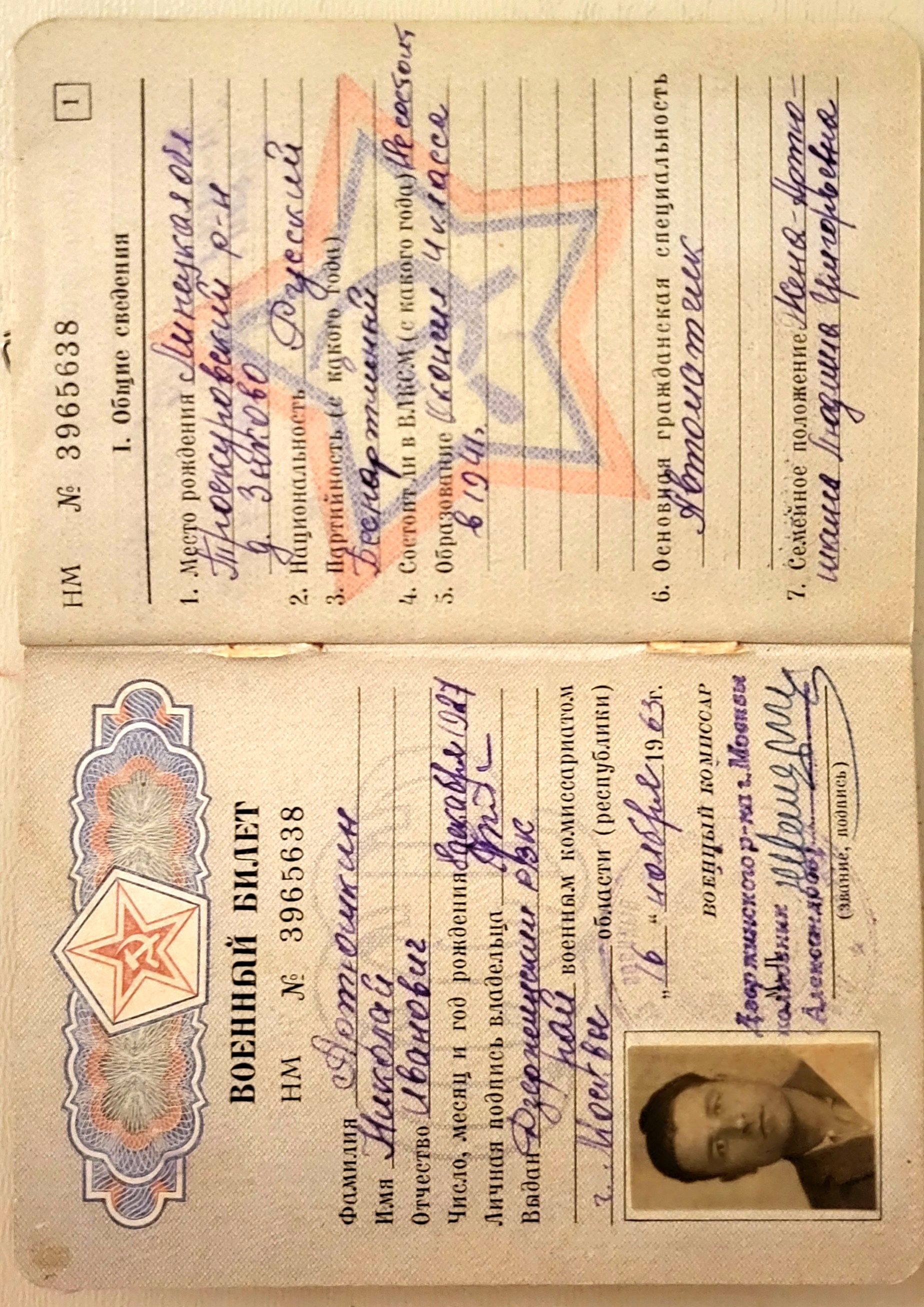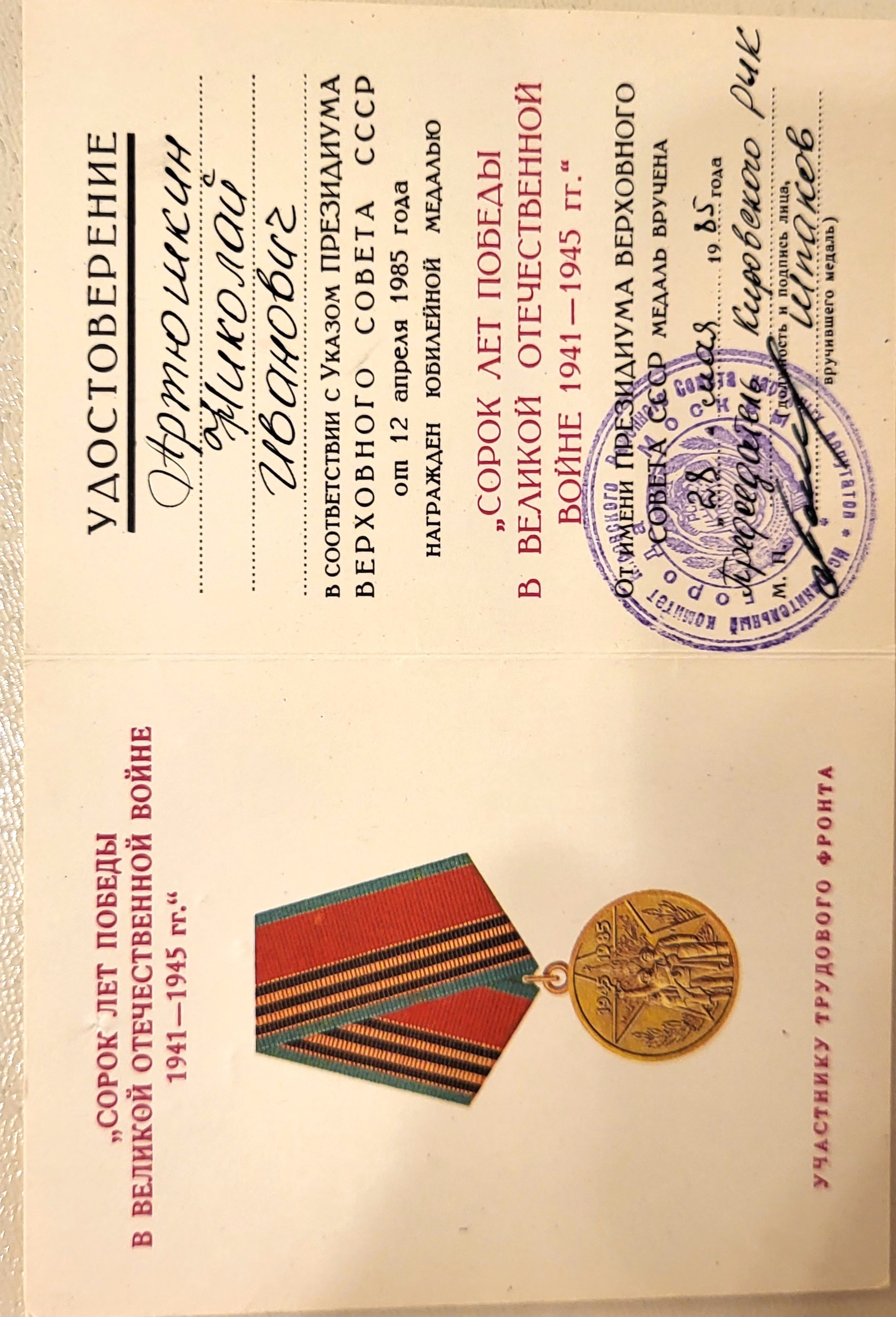 Русский, беспартийный, окончил 4 класса в 1941 г. Гражданская специальность - автоматчик. В 1944 г. призван в ВМФ курсантом на крейсер Красный Крым" Черноморского флота. В 1951 г. уволен из ВМФ в должности командир отделения строевых надводных кораблей 42904. Награжден медалью "За Победу над Германией". После службы работал в РКК Энергия в должности автоматчик-наладчик. Супруга Артюшкина Людмила Григорьевна 28.07.1927 г.р. Сын, Артюшкин Сергей Николаевич 21.10.1965 г.р.