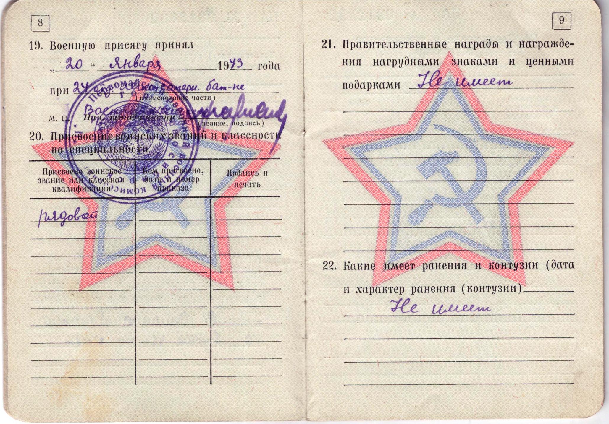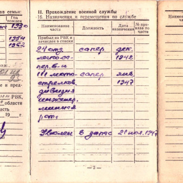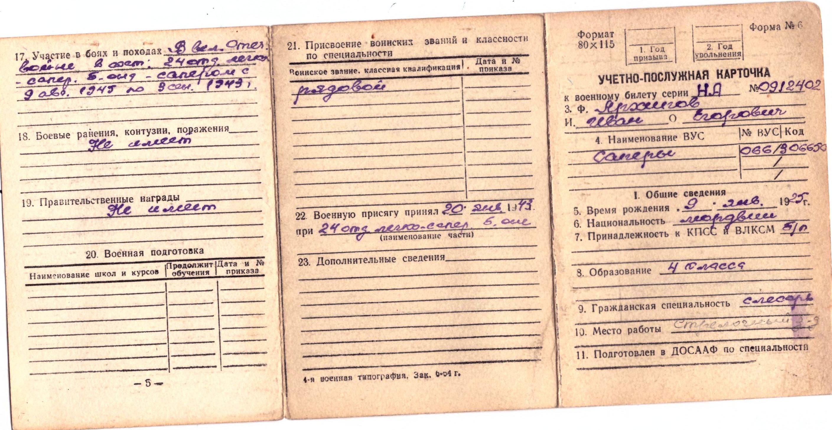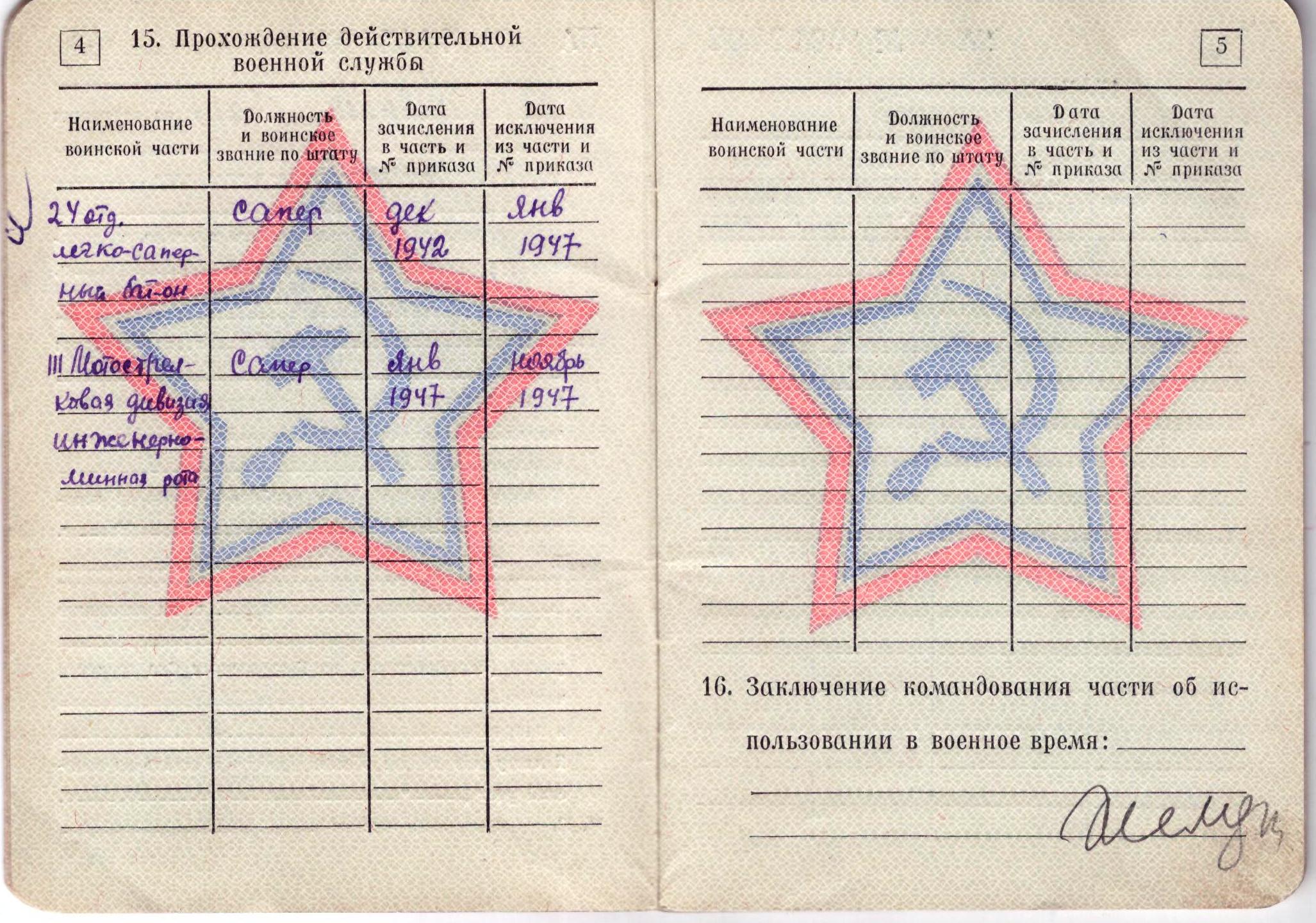 Воевал в составе 24 отд.легко-саперного батальона сапером (декабрь 1942-январь 1947 гг.). Участвовал в войне с Японией с августа 1945 по сентябрь 1945 гг., III Мотострелковой дивизии инженерно-линейной роты сапером (январь 1947-ноябрь 1947 гг).