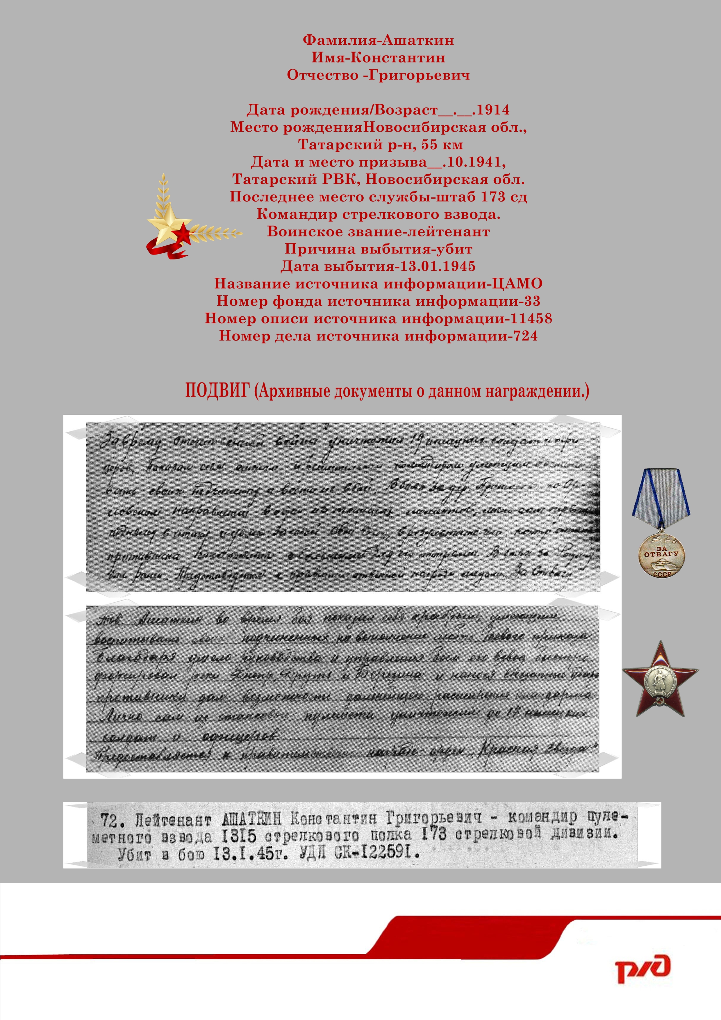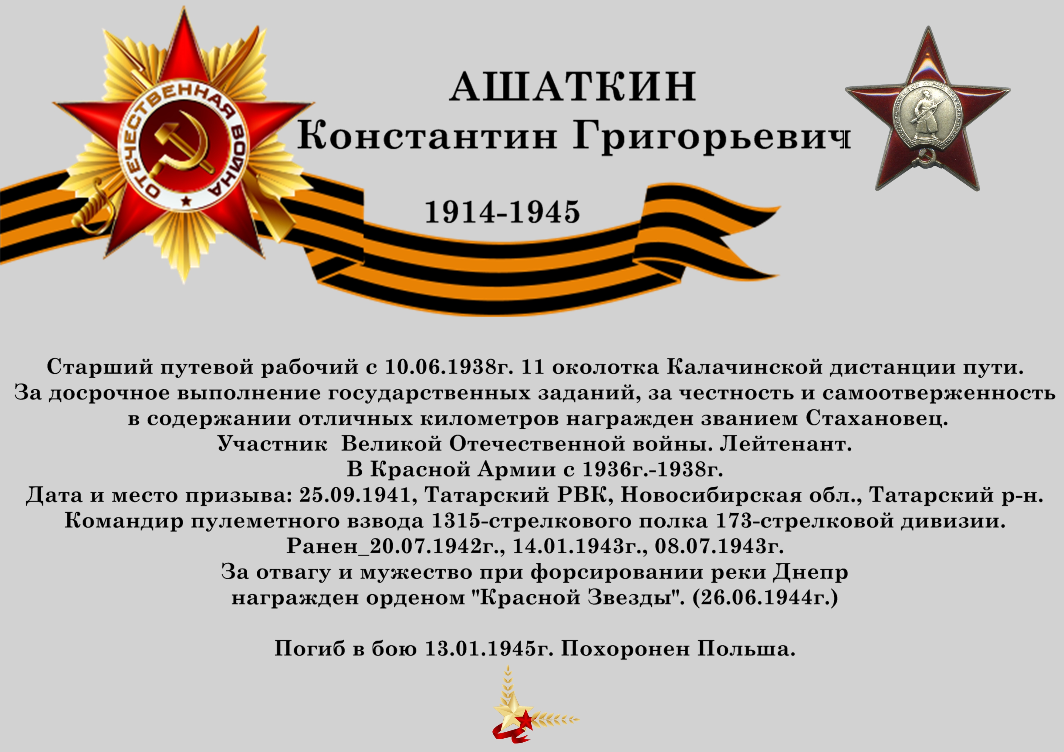 АШАТКИН КОНСТАНТИН ГРИГОРЬЕВИЧ - Старший путевой рабочий Калачинской дистанции пути с 1935г. В 1939г. награжден за хорошую работу отрезом на костюм-7м. За
