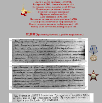 Великой Отечественной войны. Дата и место призыва__.10.1941, Татарский РВК, Новосибирская обл., Татарский р-н. Командир взвода 1315 стрелкового полка. Ранен 20.07.1942г. 14.01.1943г. 08.07.1943г. При форсировании реки Днепр уничтожил 17 офицеров и солдат противника. За смелость и мужество награжден Орденом Красной Звезды 22.06.1944г.. Орденом Отечественной войны II степени 12.07.1944г.