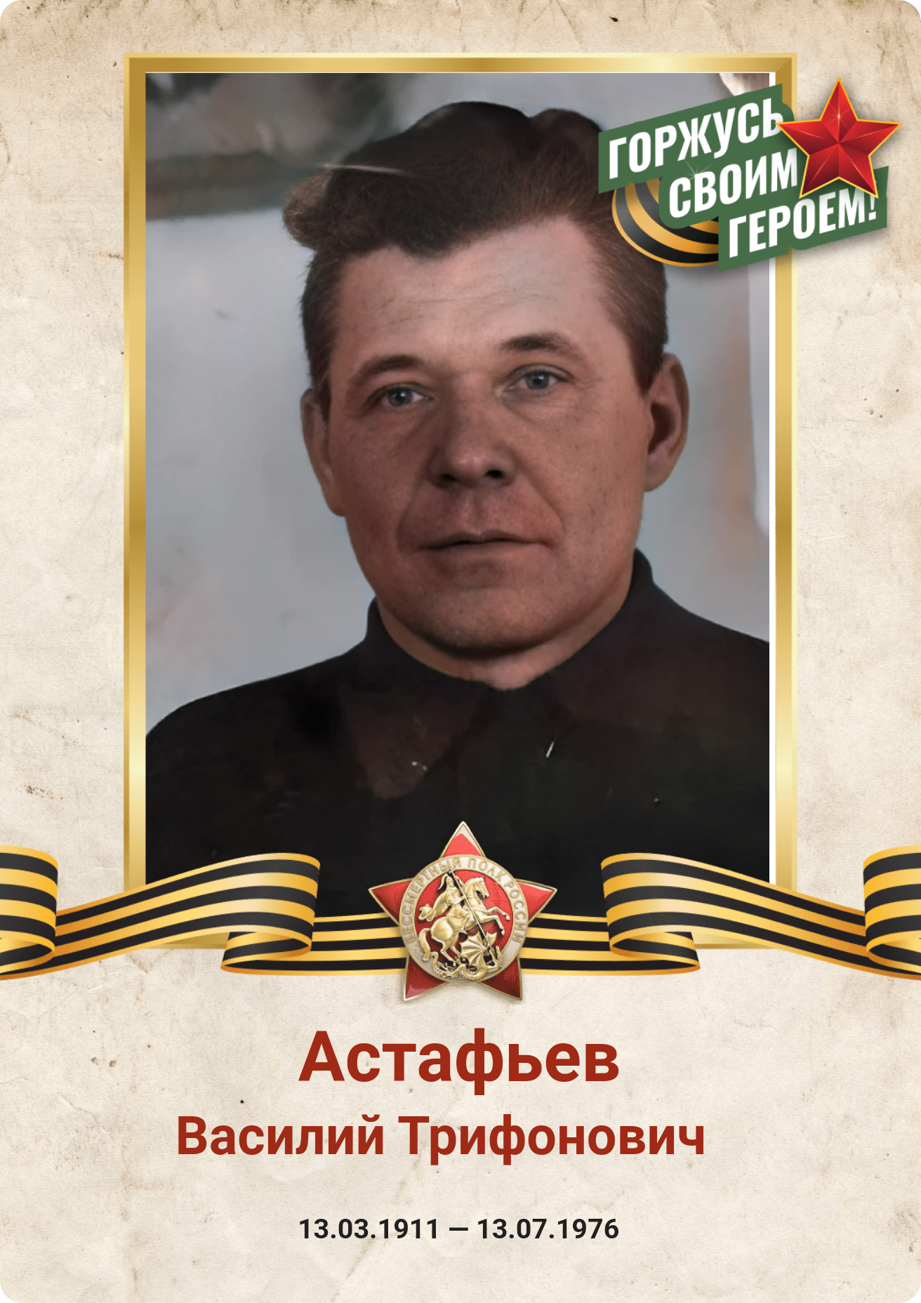 Василий Трифонович был призван в июле 1942 года, воевал за освобождение Варшавы, Праги, дошёл до самого Берлина и имеет множество боевых заслуг. Дома его ждала жена и маленькая дочка. После войны вернулся в родную деревню, что находится в Кузбассе, в Тисульском районе. Родилось у Василия Трифоновича ещё четверо детей. Трудился долгие годы в совхозе. Был очень порядочным, справедливым и честным человеком.