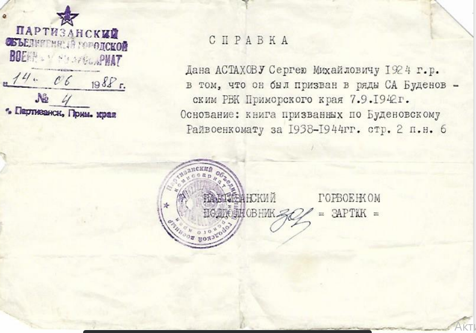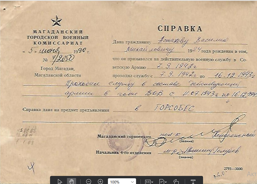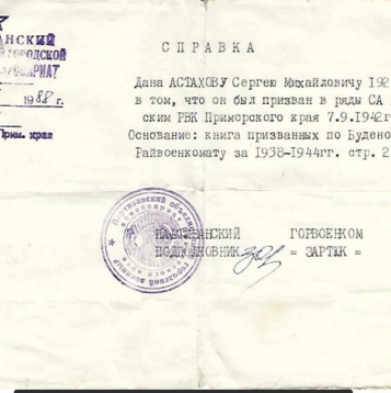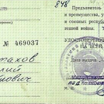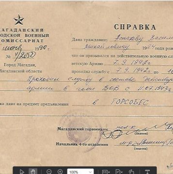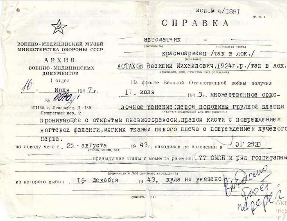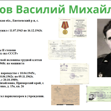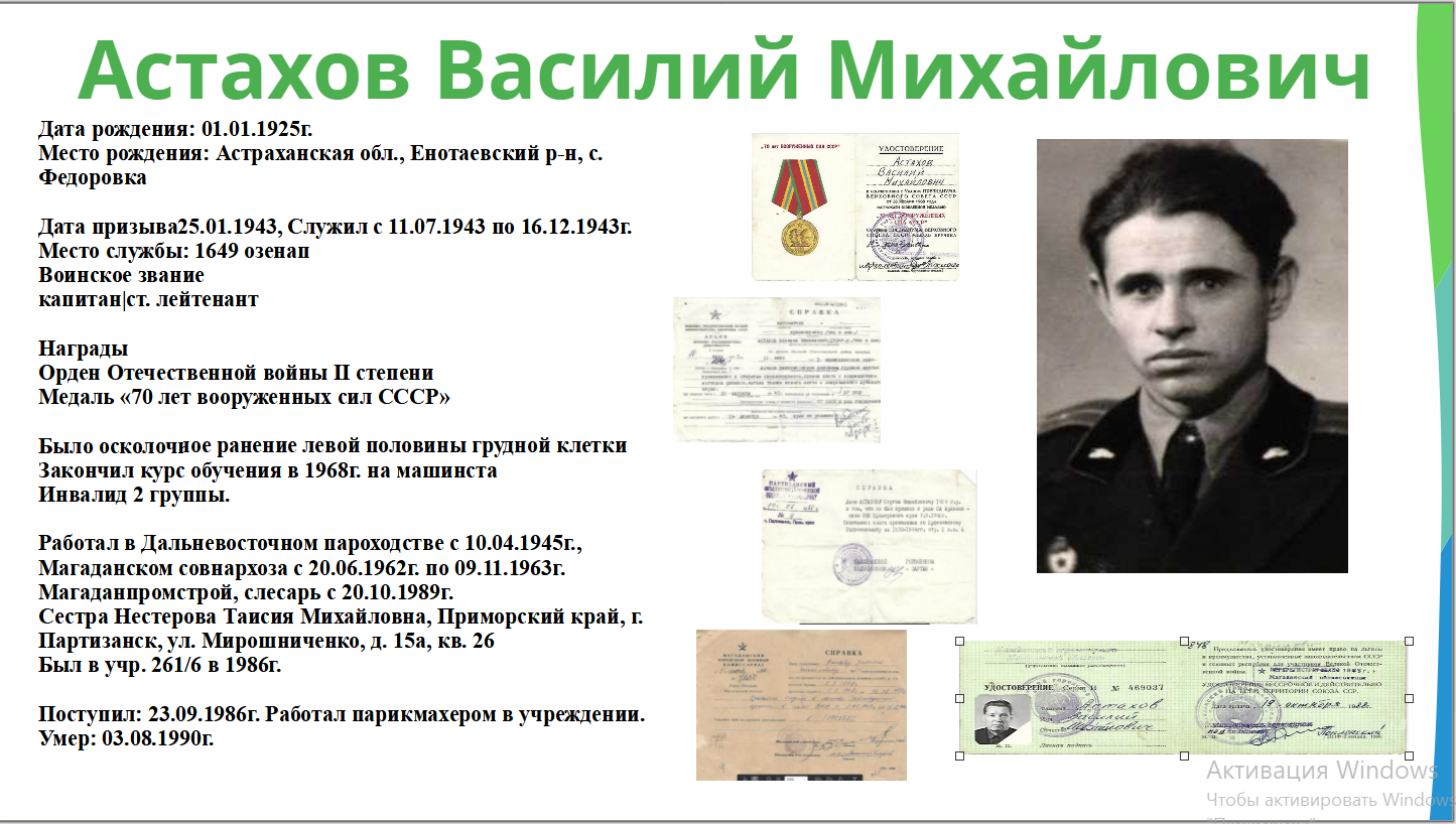 Дата призыва25.01.1943, Служил с 11.07.1943 по 16.12.1943г. Место службы: 1649 озенап Воинское звание капитан|ст. лейтенант Награды Медаль «70 лет вооруженных сил СССР» Было осколочное ранение левой половины грудной клетки Закончил курс обучения в 1968г. на машиниста Инвалид 2 группы. Работал в Дальневосточном пароходстве с 10.04.1945г., Магаданском совнархоза с 20.06.1962г. по 09.11.1963г. Магаданпромстрой, слесарь с 20.10.1989г. Сестра Нестерова Таисия Михайловна, Приморский край, г. Партизанск, ул. Мирошниченко, д. 15а, кв. 26 Был в учр. 261/6 в 1986г. Поступил: 23.09.1986г. Работал парикмахером. Умер: 03.08.1990г.