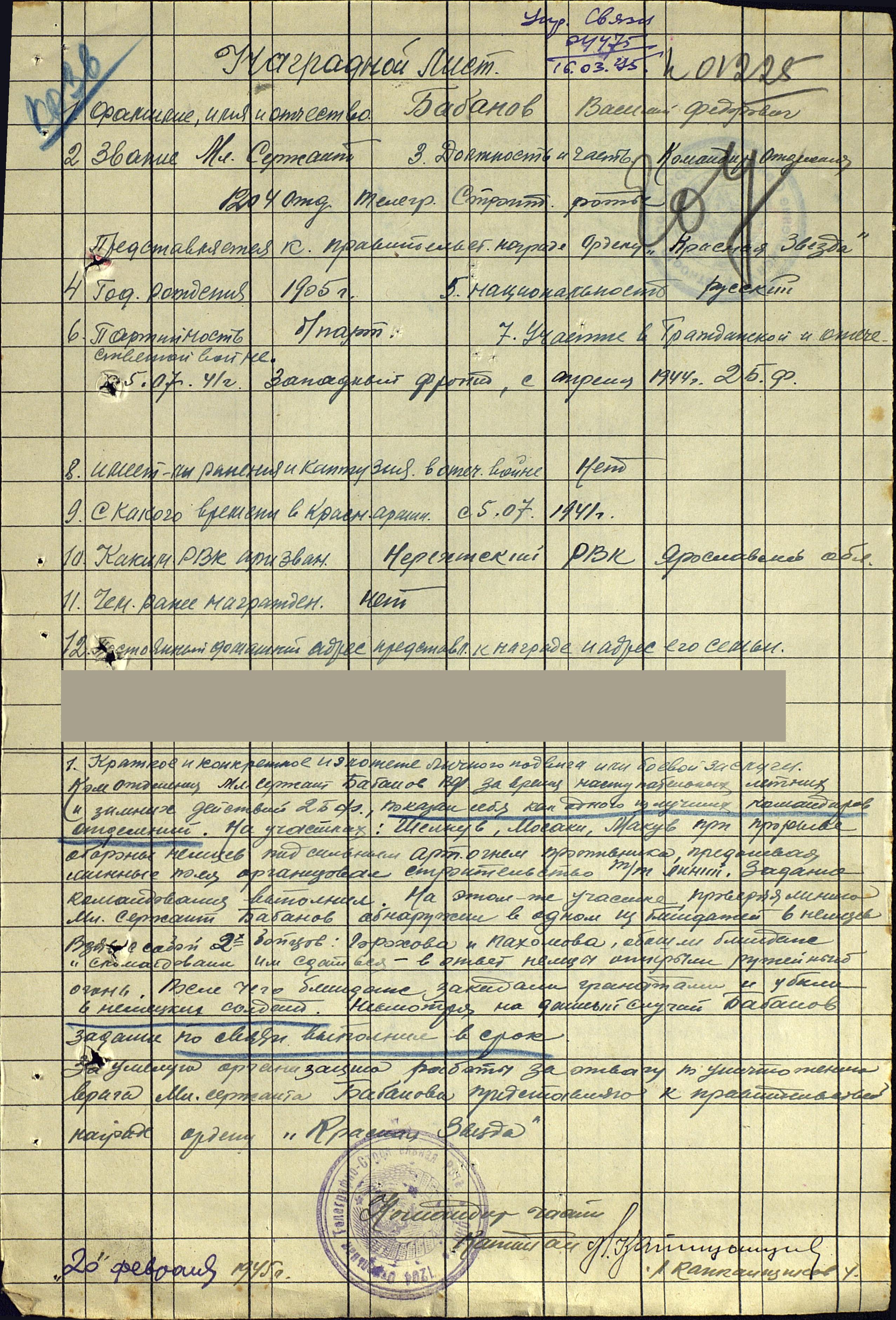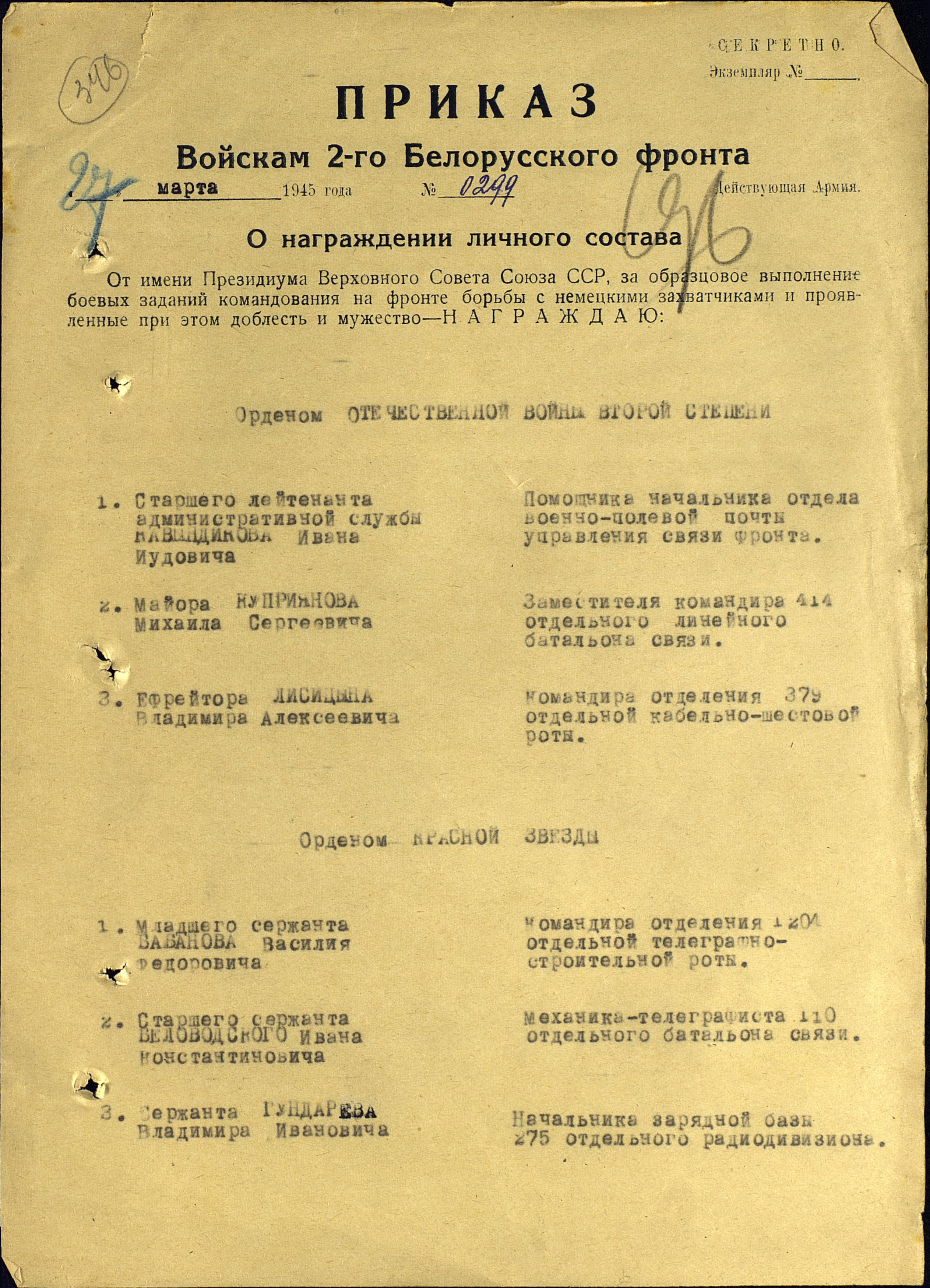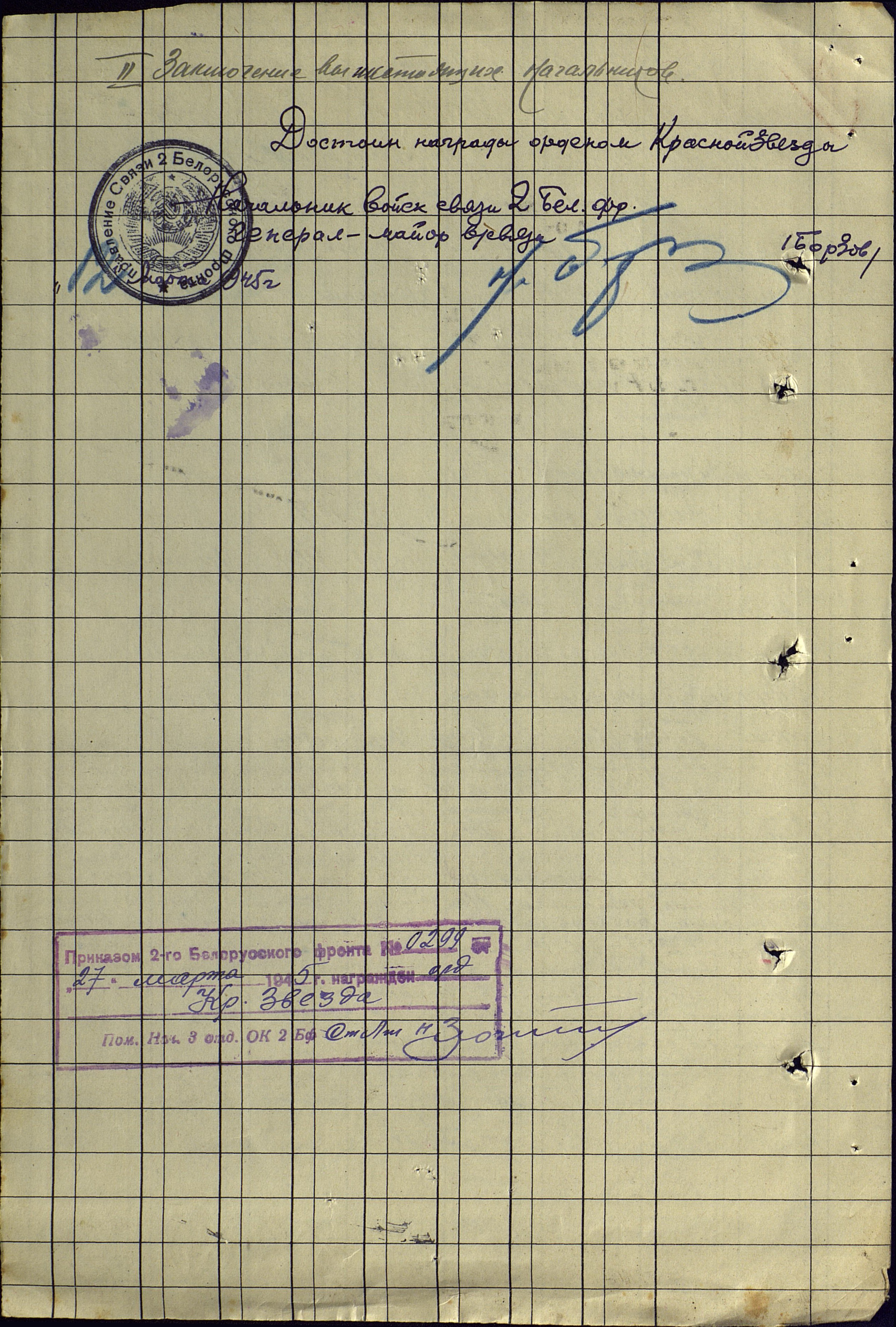 на Западный Фронт. Воевал в войсках связи. Младший сержант- Командир отделения 1204 отдельной телеграфно-строительной роты. С апреля 1944 г. воевал на 2-м Белорусском Фронте.Демобилизован 01.08.1945 г.