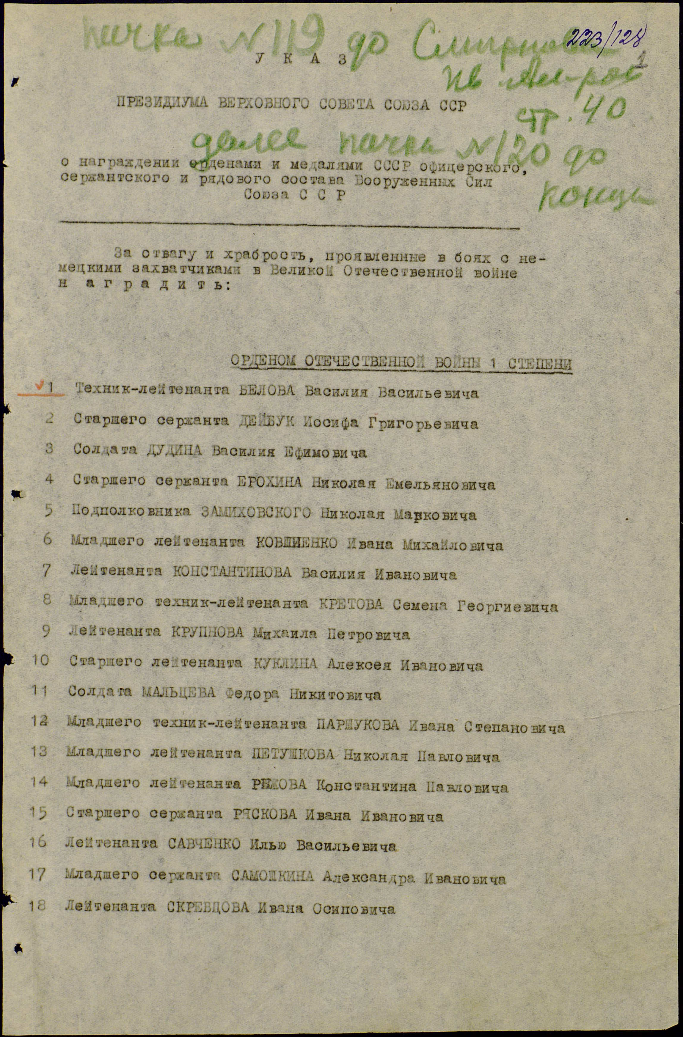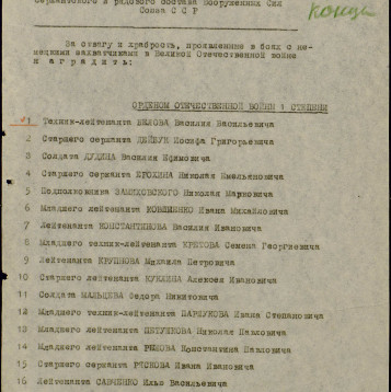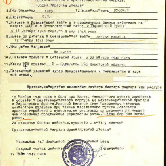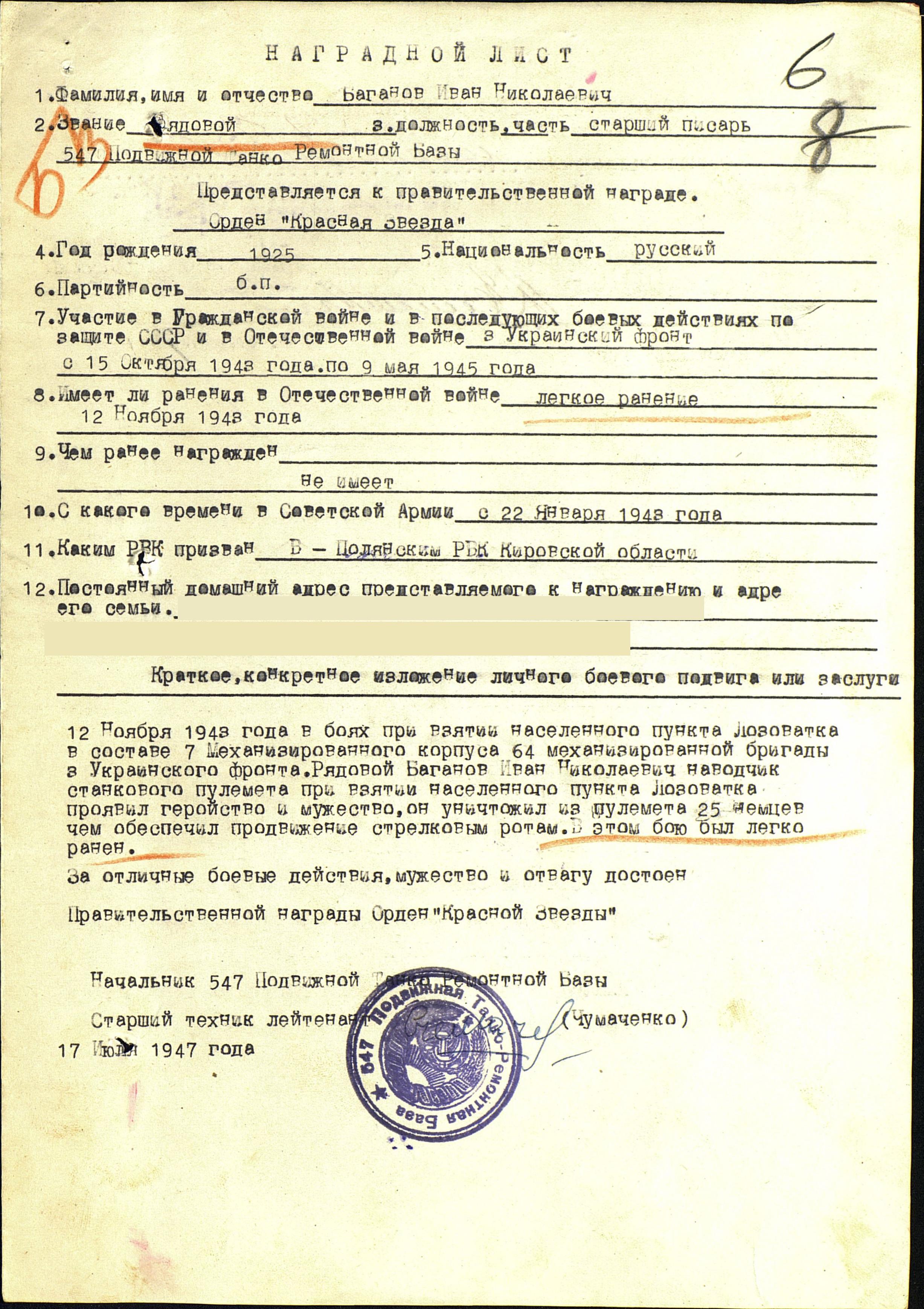 Звание: красноармеец в РККА с 22.01.1943 года. Место призыва: Вятско-Полянский РВК, Кировская обл., Вятско-Полянский р-н Место службы: 7 мехд Дата подвига: 12.11.1943 № записи: 80477989
