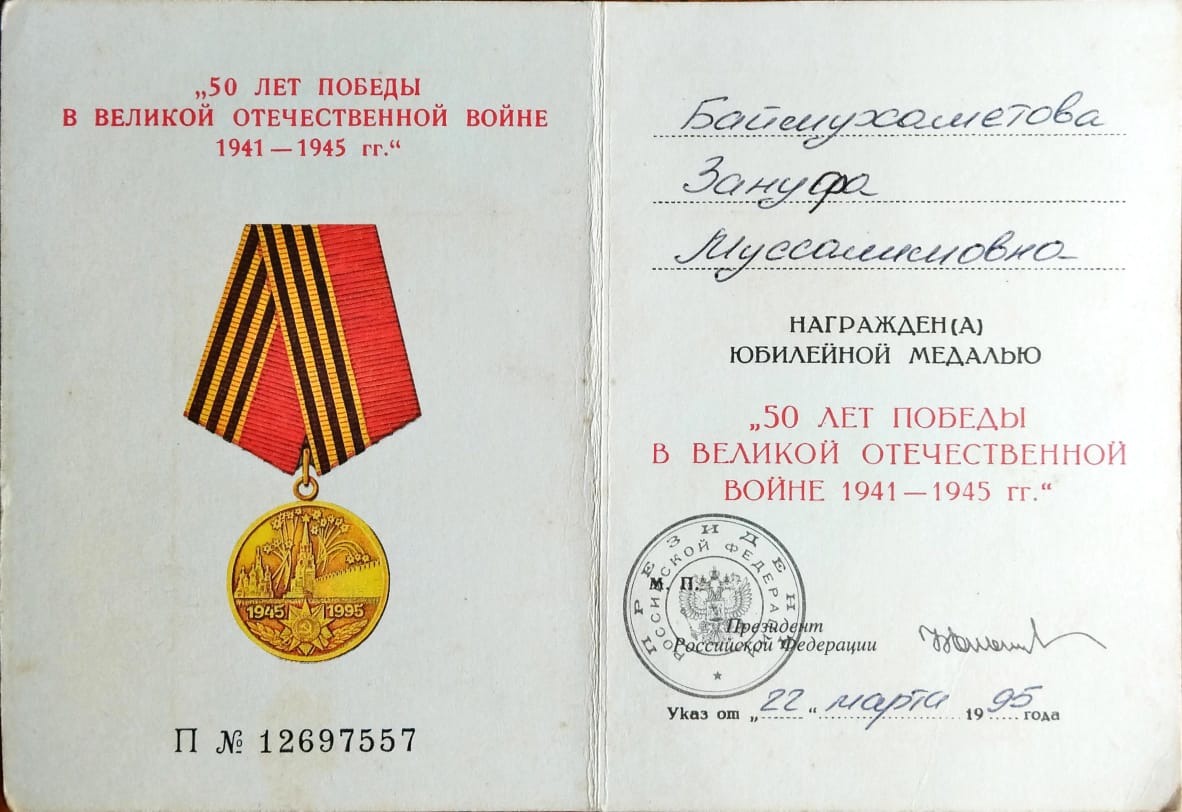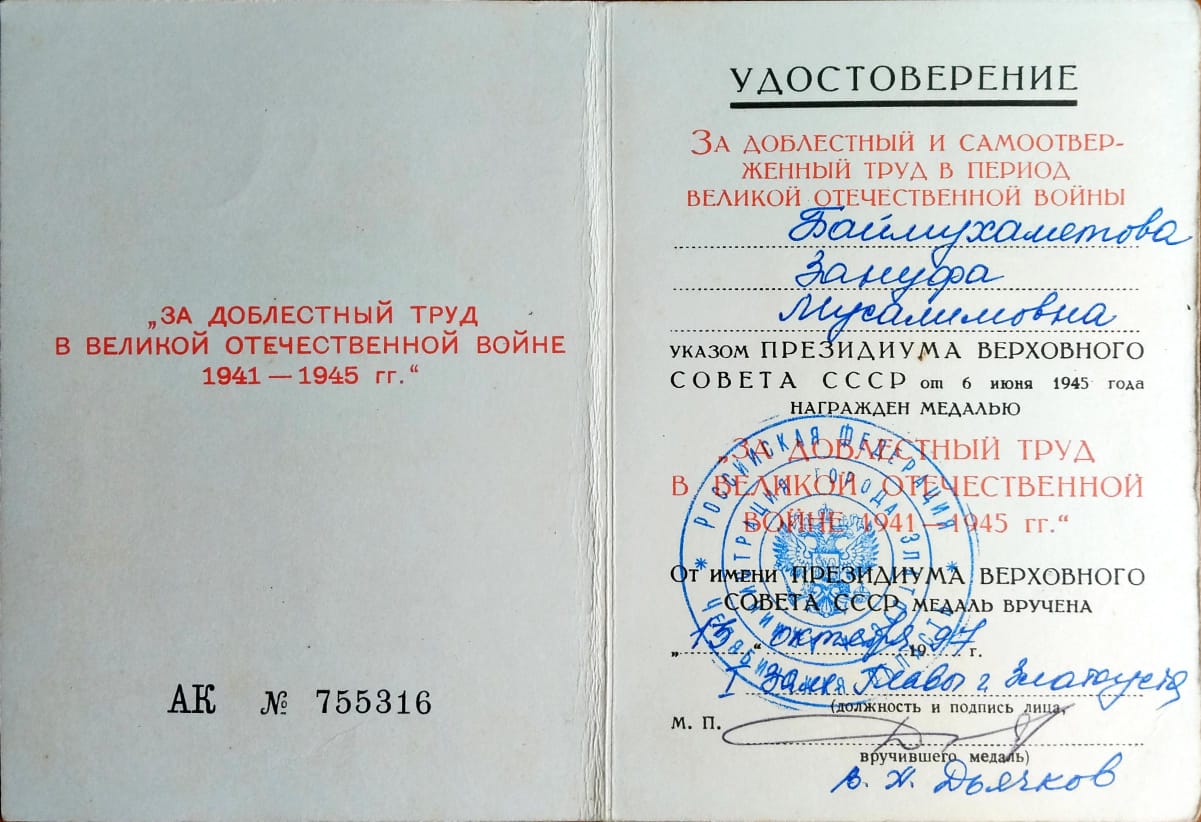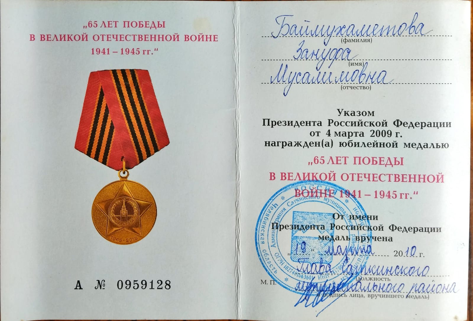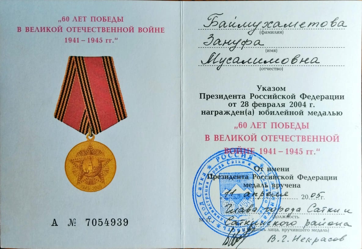 Баймухаметова Зануфа Мусалимовна родилась в семье бедных крестьян 25 августа 1927 года в маленьком домике на окраине деревни Таймеево Салаватского района Башкирской АССР. Детей в семье было семеро. Зануфа Мусалимовна - самая старшая. Детство было тяжелое, голодное. Но, не смотря на все трудности, в 1934 году она пошла в школу. В 1941 году окончила седьмой класс. Началась война. Отца сразу же забрали на фронт. А маме семерых детей не прокормить. Вот тогда и пришлось Зануфе Мусалимовне в свои 14 лет пойти на работу. Ведь она в семье старшая. Забота о младших братьях и сестренках, любовь к ним придавали ей силы. Маленькая, хрупкая девочка выходила наравне с взрослыми в поле на уборку урожая, нанималась в работники: пилила дрова, возила из леса на лошадях, умела запрягать лошадей. Голодное, холодное военное детство не породило злость и ненависть в ее юной душе, а напротив забота о людях, любовь к близким все крепла. В 1948 году Зануфа Мусалимовна вышла замуж и переехала вместе с мужем, Рауфом Хужиевичем, в деревню Саргамыш. Работала дояркой на ферме. На работу уходила рано утром, возвращалась поздно вечером. Между дойками успевала покос убирать. 1 мая 1949 года родился сын-первенец Дулкын. Родила его Зануфа Мусалимовна прямо на ферме во время дойки. В то тяжелое время не приходилось сидеть дома с детьми. На следующее утро, оставив сына с мамой, снова пошла на работу. Муж тоже работал с утра до вечера столяром. Семья была дружная. Вечером, вернувшись с работы, уставшие, вместе убирались по хозяйству. Позже в этой замечательной трудовой семье родилось еще четыре дочери: Клара - 1950 г.р., Айсылу - 1952 г.р., Айгуль - 1954 г.р., Алмира- 1958г.р. В 1959 году Зануфа Мусалимовна награждена медалью Материнства 2 степени. Воспитанием детей занимались вместе с мужем. Муж очень любил читать и привил любовь к чтению детям. В доме было много книг. Муж приносил с работы детские книжки, «Весёлые картинки», дети ждали с нетерпением вечера. Глаза у всех радостно блестели, от души смеялись задорным смехом, ласково хлопали друг друга по плечу, когда муж рассказывал детям весёлые истории. Вечерами читали по очереди детские книжки, а Зануфа Мусалимовна, тем временем, шила на заказ и вязала шали на продажу, чтобы заработать хоть немного денег. Зарплата была маленькой, денег не хватало. Приходилось садить много картофеля, дети помогали на огороде. Осенью сдавали урожай в совхоз, на вырученные деньги покупали детям одежду и обувь. Сладости дети видели только по большим праздникам, купить было не на что. В бедной, но дружной семье Баймухаметовых царили любовь, уважение, взаимопонимание, стремление к поставленной цели, лучшей жизни, к учебе. В 1988 году Зануфа Мусалимовна с мужем переехали в г. Златоуст, поближе к детям. В 1993 году заболел муж. Война и голодное детство дали о себе знать. Врачи поставили диагноз: рак желудка. Это был приговор. В тот же год Рауф Хужиевич умер. Зануфа Мусалимовна осталась одна в своем доме. Но дети не забывали её. Вместе с восьмью внуками и восьмью правнуками навещали Зануфу Мусалимовну, помогали ей. Часто собирались большой дружной семьей в уютном родительском доме. Когда Зануфе Мусалимовне исполнилось семьдесят три года, дочь Айгуль предложила ей переехать в посёлок Бердяуш, поближе к себе. Так с 2000 года Зануфа Мусалимовна живет в Бердяуше в частном доме в центре поселка. Вдов