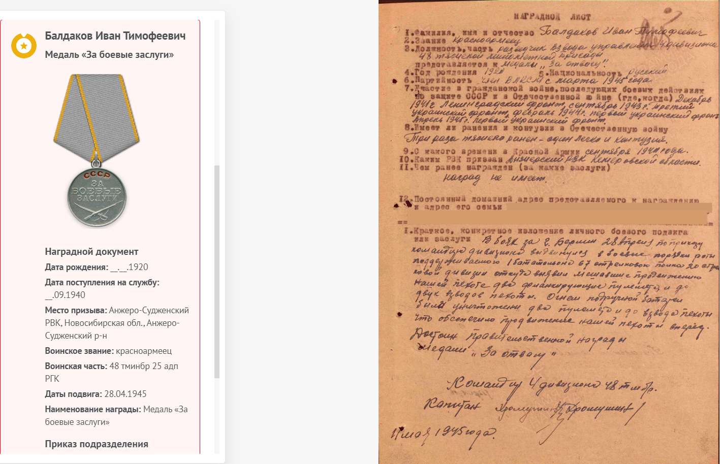 О героическом подвиге дедушки я узнала лишь спустя годы, когда изучала архивные документы. В наградном листе от 4 мая 1945 года описано, что 28 апреля 1945 года, в боях за Берлин, выйдя на передовую, дедушка огнём подручной батареи уничтожил вражеских пулемётчиков, что обеспечило продвижение советской пехоты вперёд. За этот подвиг он был удостоен государственной награды — медали «За боевые заслуги», а также ордена Отечественной войны II степени. Эта дата стала символом его личной победы и огромного вклада в общую Победу, которая досталась такой страшной ценой.