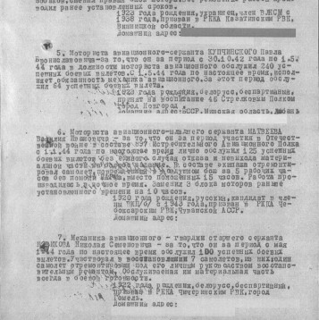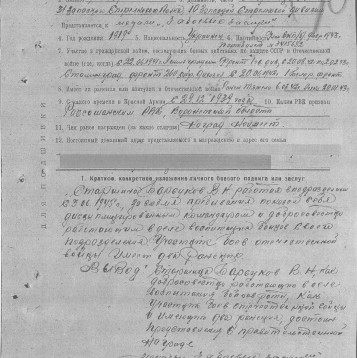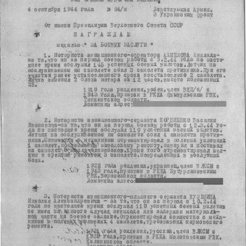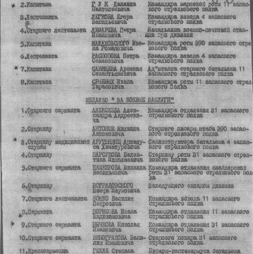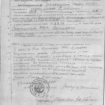 Сан-инструктор 314 отдельной Мот. Стрелковой Развед-роты 260 Стрелковой Дивизии. Проявил отвагу и мужество. Над ураганным огнем противника лично вынес с поля боя с их личным оружием, оказав первую медицинскую помощь, 23 бойца и командира. За проявленную отвагу и мужество заслуживает быть представленным к награде "Медаль За Отвагу"