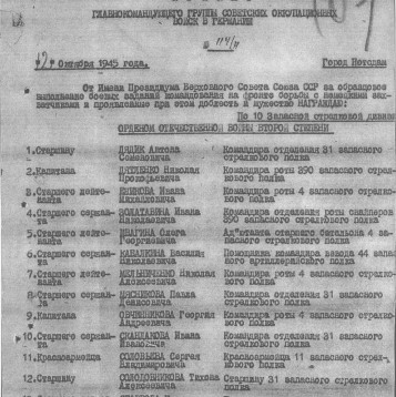 Старшина Барсуков В.Н работая в подразделении с 03.06.1945 г. за время пребывания показал себя дисциплинированным командиром и добросовестно работающим в деле воспитания бойцов своего подразделения. Имеет два ранения.