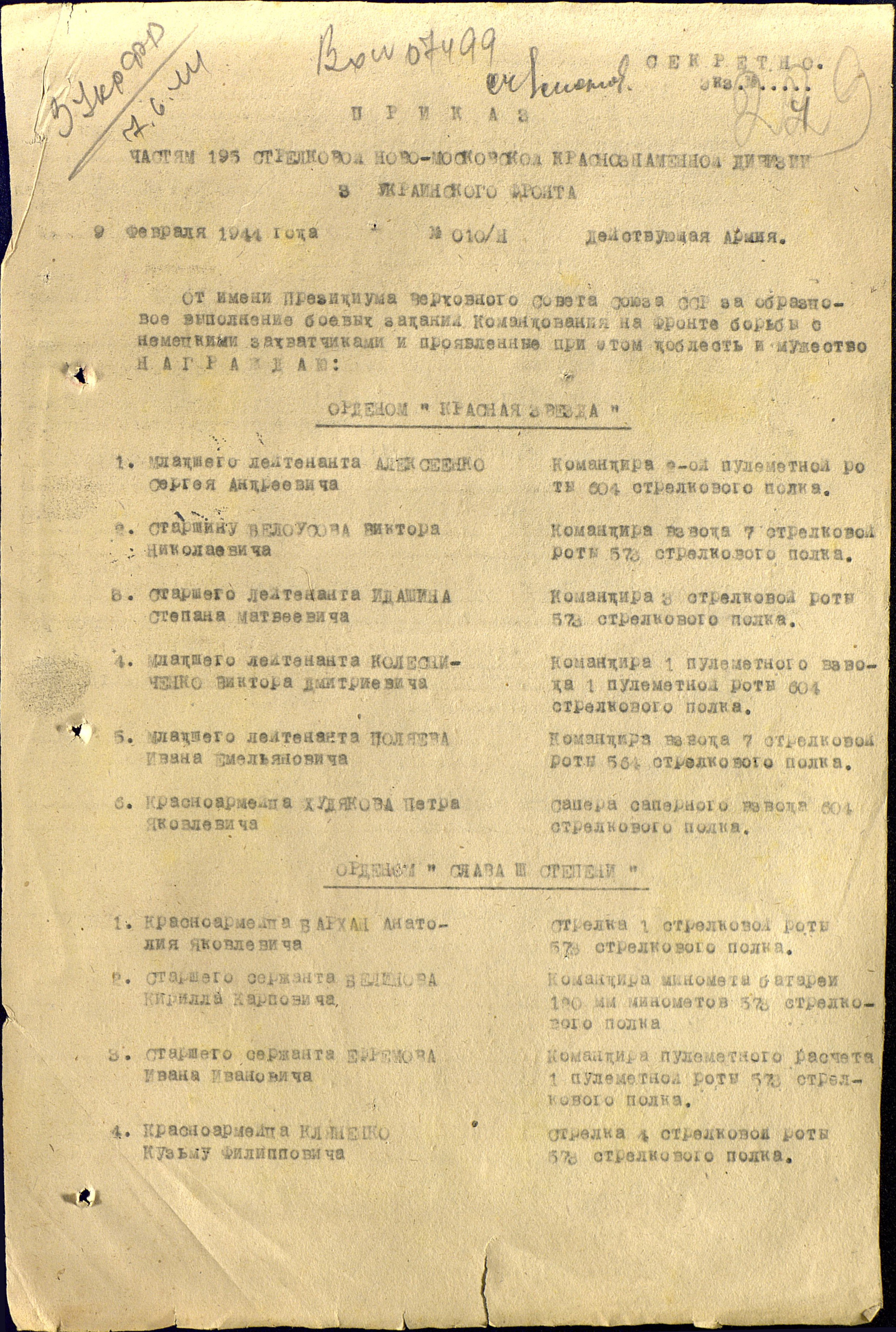 фронта за №010/н: «от имени Президента Верховного Совета Союза ССР за
