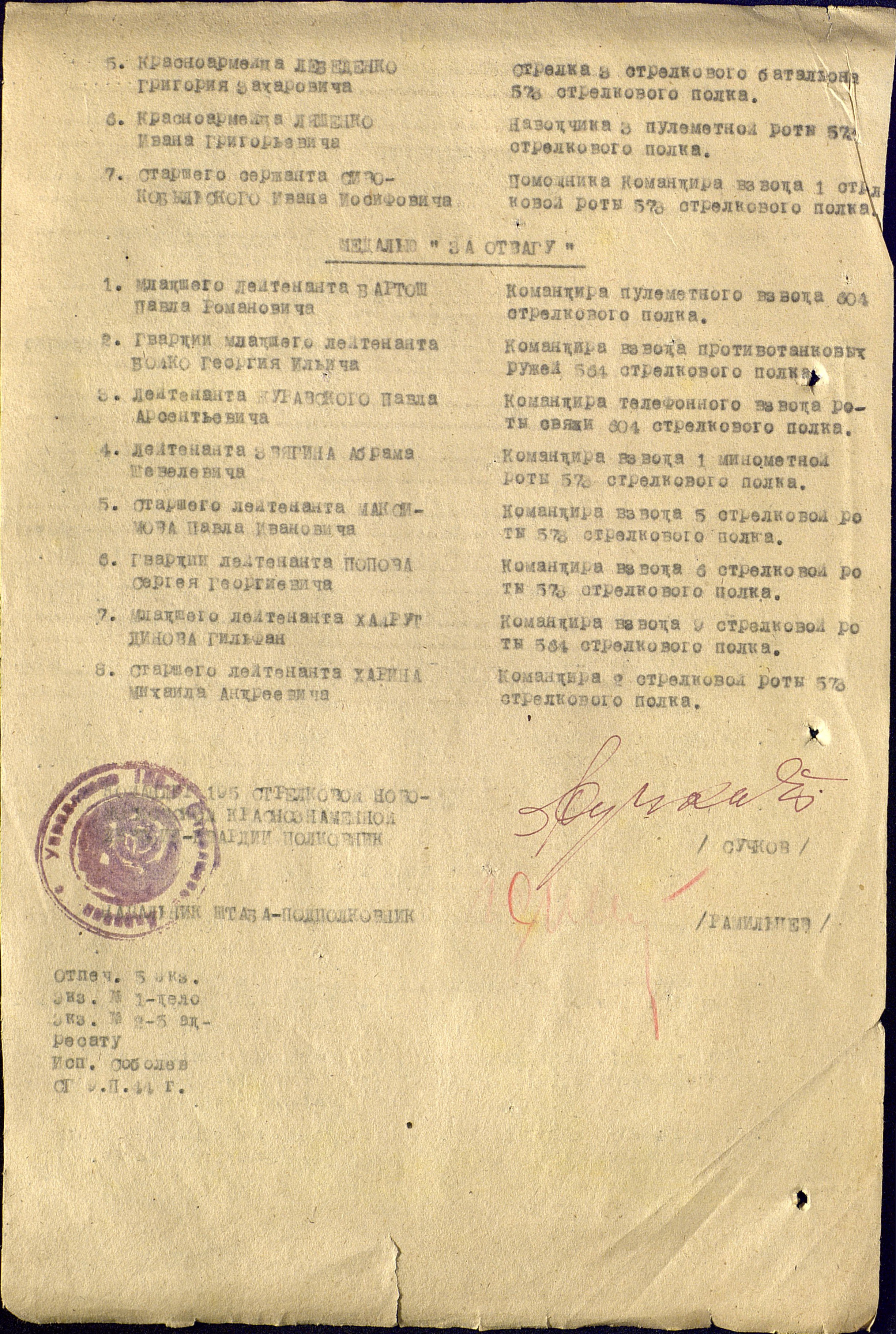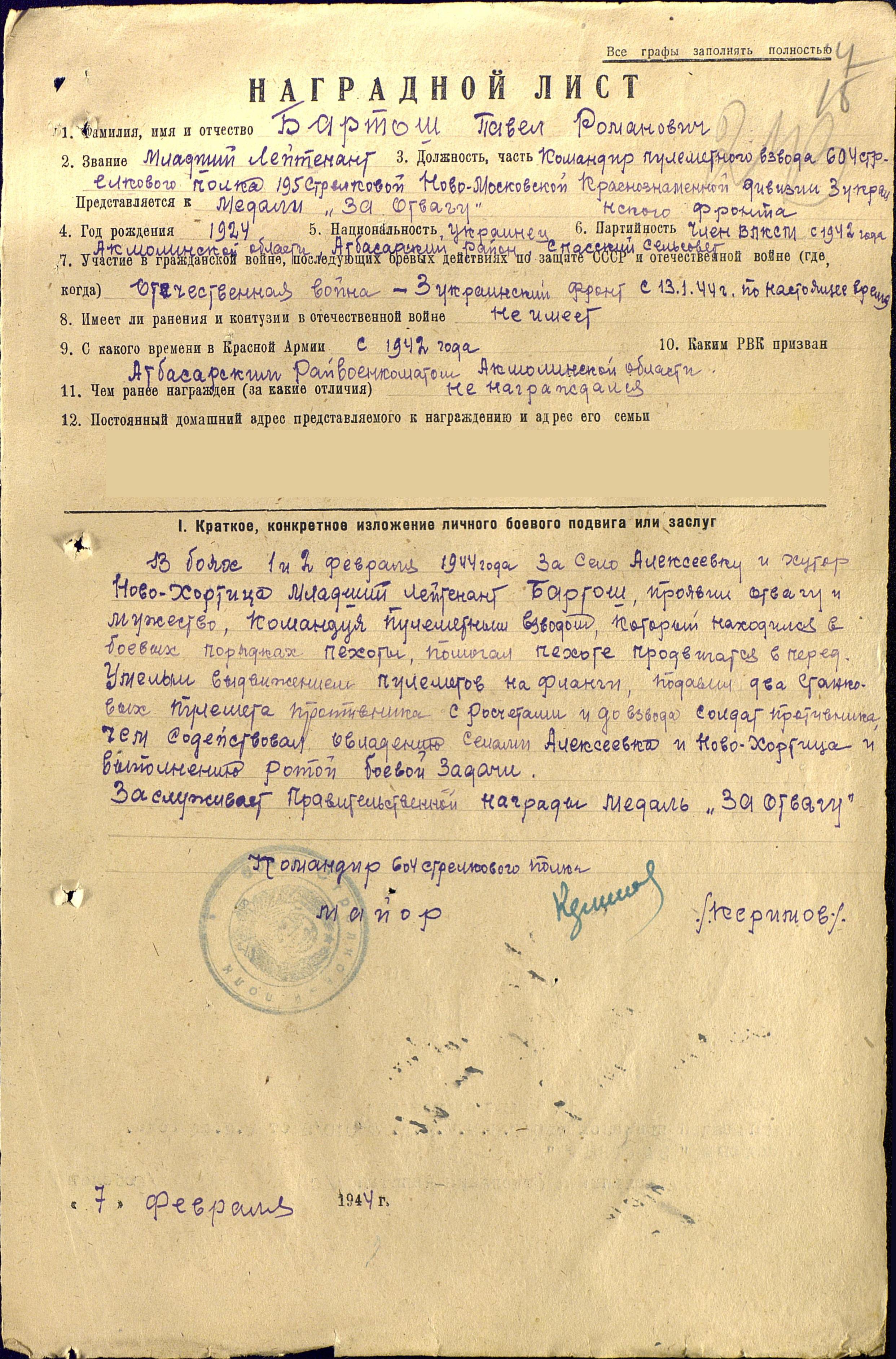 отвагу» младшего лейтенанта Бартош Павла Романовича, командира пулеметного взвода