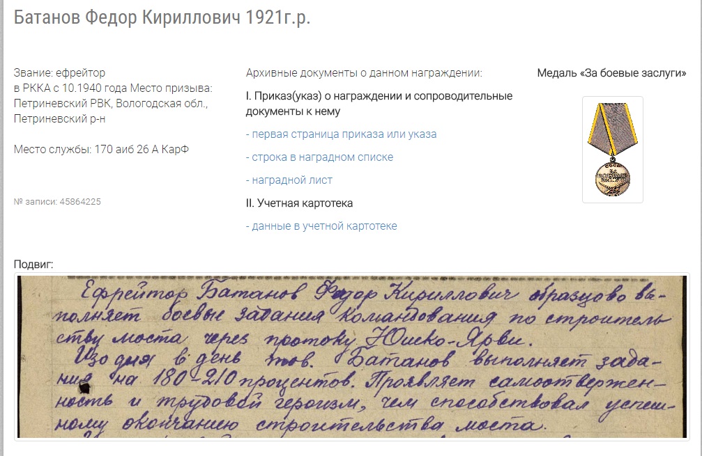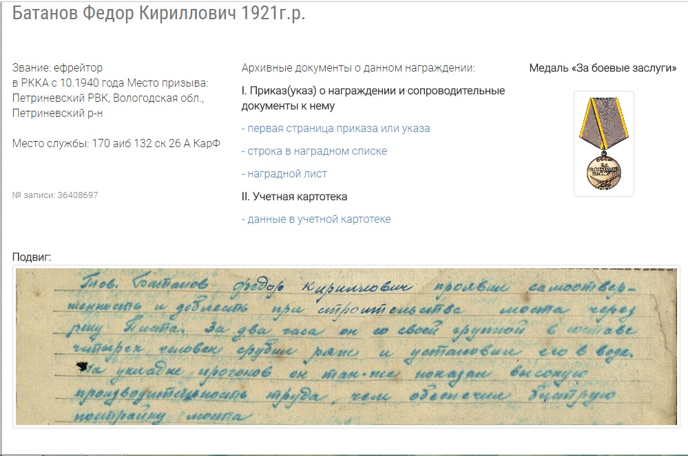 Мой дедушка, Батанов Федор Кириллович, родился 16 июня 1921 года в деревне Галинское Череповецкого района Вологодской области. Осенью 1940 г. был призван на службу в армию. Отслужив меньше года, с началом войны был направлен на фронт. Будучи в звании ефрейтора (воинская часть 170 А.И.Б) 23 сентября 1944 года в Карелии был тяжело ранен в ногу осколком снаряда. Нашедший его раненого, одного в поле, боевой товарищ и командир Шульга более 2 километров волоком тащил до ближайшего полевого госпиталя. В итоге этого ранения дед потерял левую ногу. 19 ноября 1944 года был переведен в г. Вологду, в госпиталь на лечение, там же он встретил Великую Победу. 27 июня 1945 года выписан и направлен домой. Потеряв ногу, дед не потерял себя и волю к жизни: женился, воспитал троих детей, вел хозяйство, работал пожарным, занимался домашними ремеслами. Для меня дед всегда был другом, авторитетом, образцом настоящего мужчины. сейчас, когда его уже нет, я очень по нему скучаю