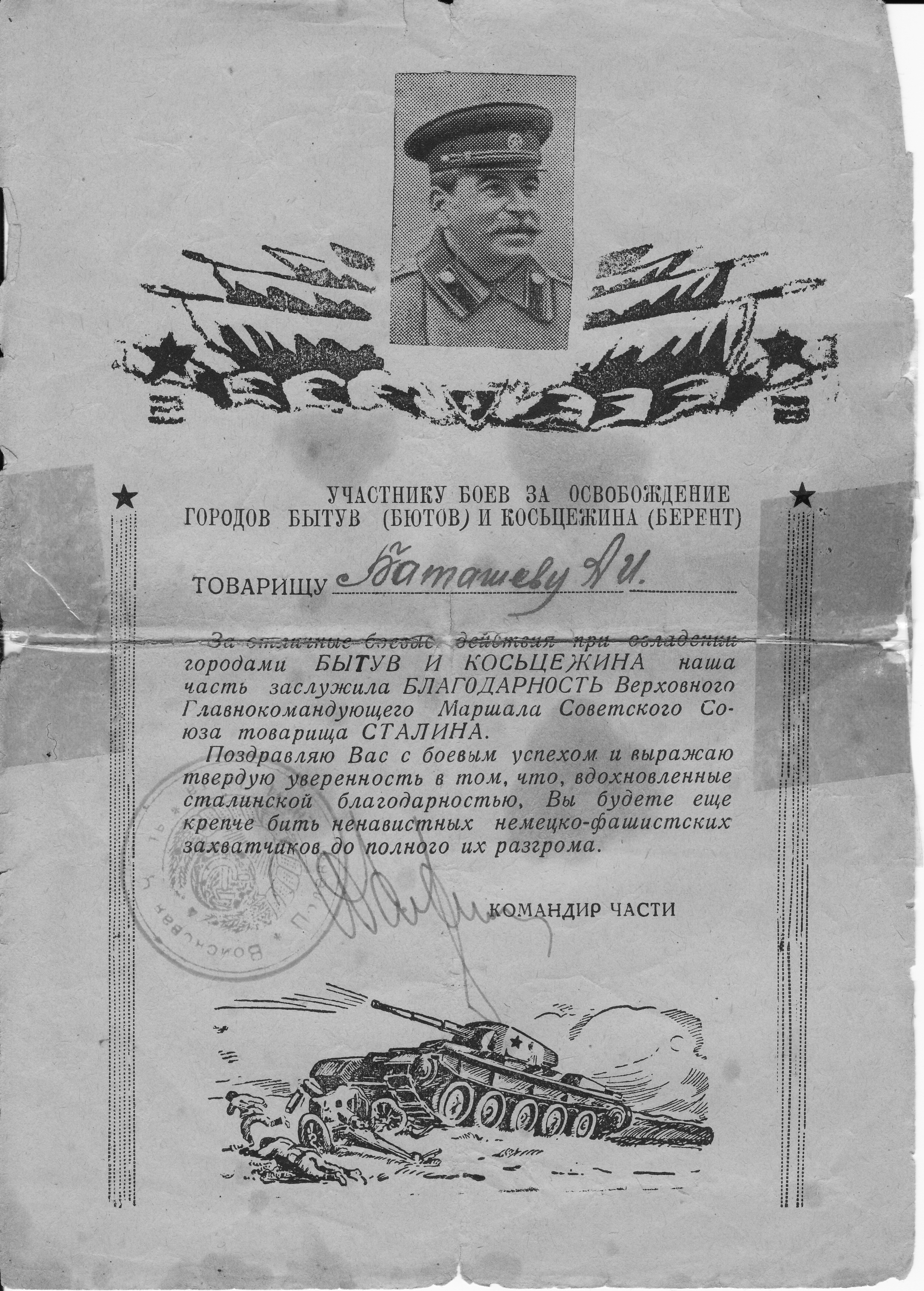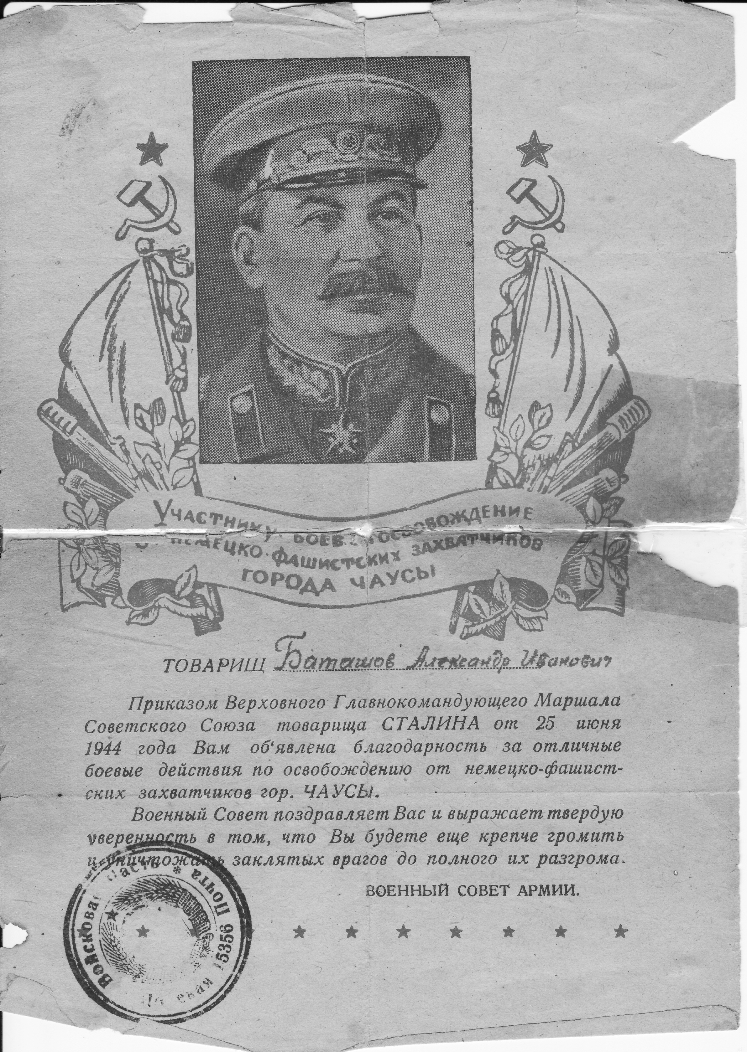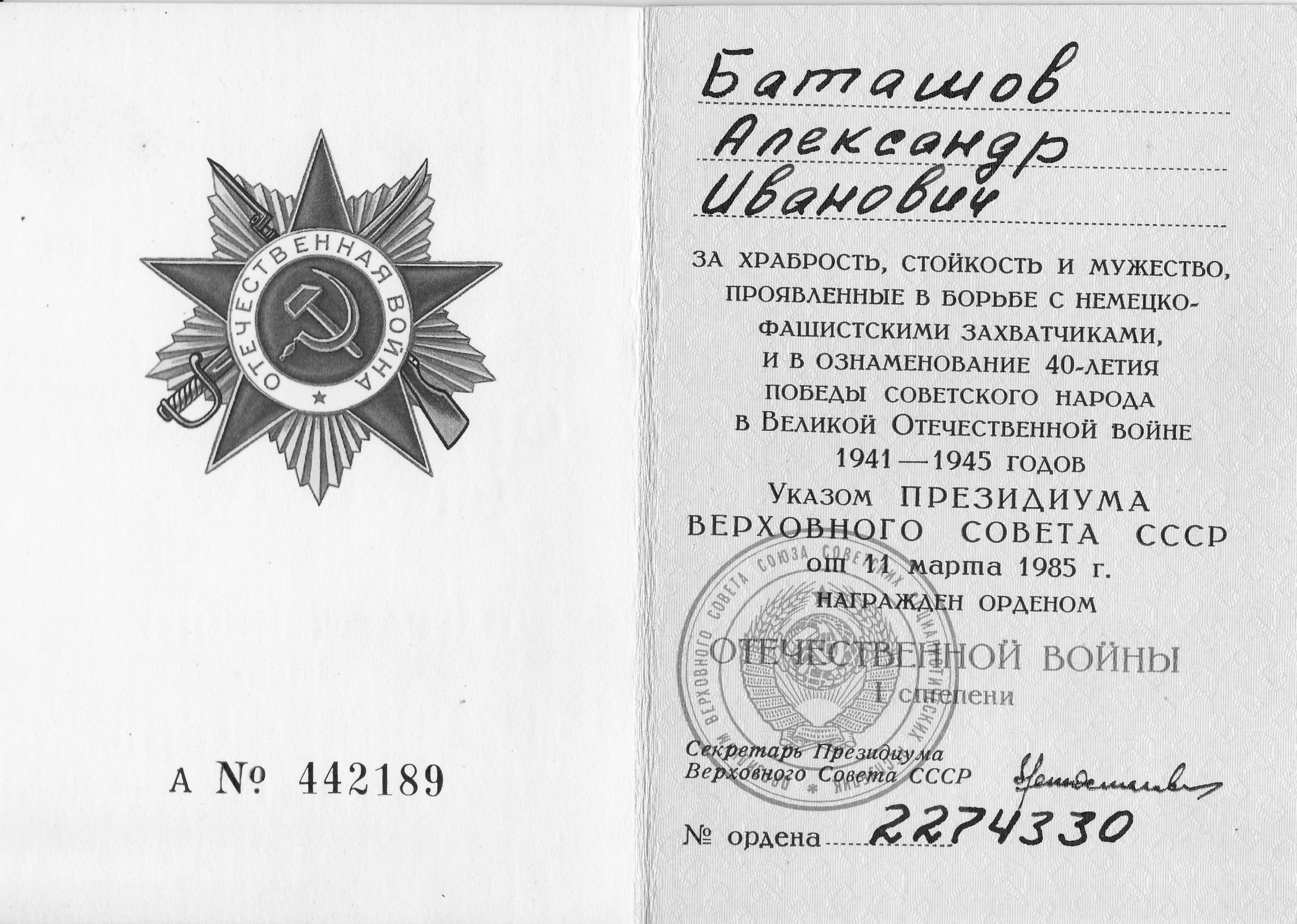 Баташов Александр Иванович родился в 1914 году в г. Вязники в многодетной семье, где воспитывалось 8 человек детей. После начальной школы Александр получил специальность слесарь в профтехучилище. Без отрыва от работы на фабрике им. Карла Либкнехта выучился на вечернем отделении льнотехникума. А с 1938 года уже работал в льнотехникуме инструктором по слесарному делу. В 1941 году был призван на строительство укрепсооружений, а весной 1942 года - в ряды Советской армии, 336 стрелковую дивизию, Калининский фронт. Проходил военную службу в маршевых ротах в лагерях Марийской АССР. Затем - передовая Калининского фронта и бой подо Ржевом, где он был тяжело ранен в голову и в спину. Спасла от гибели вовремя одетая немецкая каска, которую он подобрал, учитывая, что вооружены они были очень плохо, и использовали в бою часто то, что удавалось найти после погибших или отбить. В этом бою погибло больше половины солдат, а Александр Иванович смог сам доползти до медсанбата, а затем санитарным поездом был отправлен в Узбекистан, г. Термез. После излечения снова фронт, с марта 1943 года в составе девизии 1113 . Курская битва, а в 1944-ом в составе Белорусского фронта принимал участие в наступлении под городом-крепостью Чаусы, где 3 раза пришлось ходить в атаку вместе с ранеными, всеми, кто хоть как-то мог держать оружие. Выжить удалось, наверное, чудом. Потом его отправили служить в так называемую "звуковку". Ему задачей было регулярно выезжать на спецмашине с громкоговорителем как можно ближе к линии фронта и передавать приказы и сводки с фронтов, чтобы слышали и немцы и наши. Дошел до Берлина. Встретил Победу в местечке Швенвельд. Домой вернулся в августе 1945 года. Награжден: Орденом "Красная Звезда", орденом "Отечественной войны" 1 степени, медалями "За боевые заслуги" и "За победу над Германией", именными Благодарностями Верховного Главнокомандующего И.В. Сталина за отличие в боевых действиях при освобождении городов Бютова, Данцига, Руммильсбурга, Полянова и Чаусы, а так же рядом юбилейных медалей.