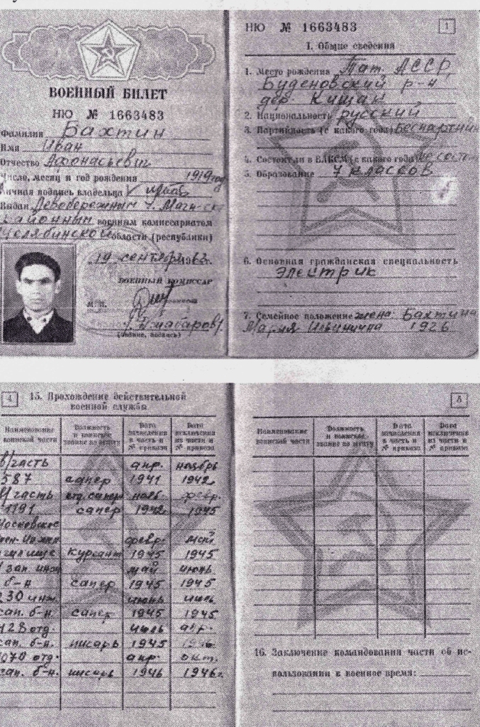 Сапёр Бахтин И.А.Бахтин Иван Афанасьевич родился в 1919 году в деревне Чув-Кищаки Буинского района Татарской республики. Из рассказов моей бабушки, я узнала, что мой прадед был боевым солдатом, прошедшим всю войну. Он участвовал в Параде Победы на Красной Площади. Имея на руках военный билет, можно пройти весь его военный путь. Он был долог: 5 лет войны и год мирного времени.Номер военного билета Ивана Афанасьевича был счастливым. Может быть ангелы, посланные его родителями, охраняли его жизнь. Жизнь сапёра, которая была как на острие иглы ежеминутно. Я наслышана о том, что служба прадеда была связана с сапёрными войсками. Он нёс службу в звании ефрейтора. До мая 1945 года Иван Афанасьевич был курсантом Московского Инженерского Училища. Недавно я узнала, что он строил переправы через Ловать, Буг, Вислу и Нарев. Разведчиком дошёл до Данцига. С орденом Красной звезды и боевыми медалями на груди мой прадед вернулся в г. Магнитогорск, где стал рабочим на «Магнитострое».Где во взрывах и вспышках кольцо горизонта,Два брата Бахтиных бьются на фронте.На западном фронте сквозь снег и туманВ саперной команде шагает Иван…Газету с этим стихотворением его старший брат Александр Афанасьевич послал на фронт. Многие из рода Бахтиных говорят о том, что Иван Афанасьевич пронес эту газету в кармане гимнастерки рядом с постоянными 10 копейками, которыми были раскручены шурупы немецких мин. Он хранил эту газету до конца своей жизни, как талисман.