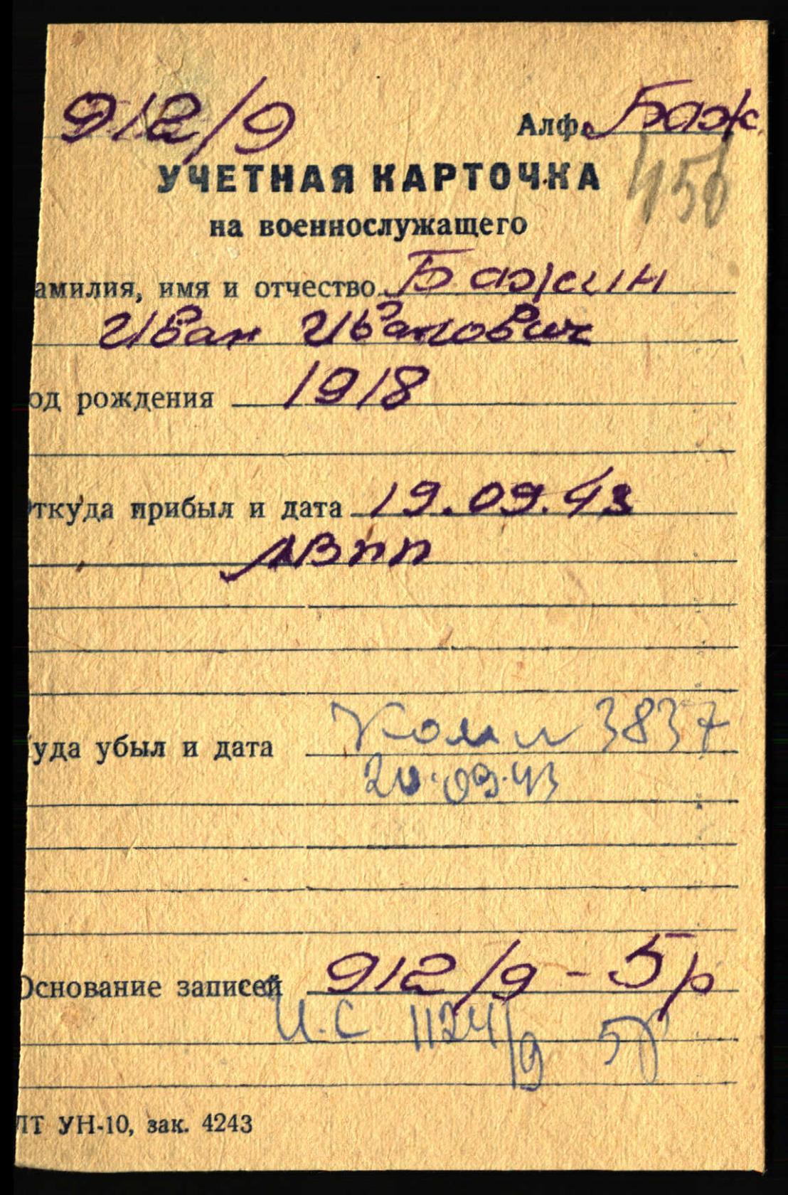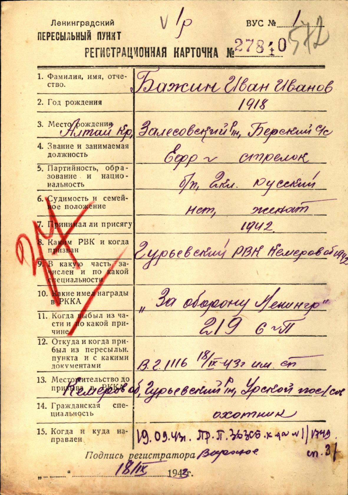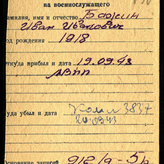 Дата рождения __.__.1918Место рождения Алтайский край, Залесовский р-н, Берский с/сДата и место призыва __.__.1942 Гурьевский РВК, Кемеровская обл., Гурьевский р-н Посмотреть на картеПоследнее место службы 219 спВоенно-пересылочный пункт Ленинградский ВПППрибыл в часть 18.09.1943Воинская часть ВГ 1116Выбытие из воинской части 19.09.1943Куда выбыл ПРП 36 зсбИсточник информации ЦАМОНомер фонда ист. информации Ленинградский ВППНомер описи ист. информации 530167Номер дела ист. информации 42732