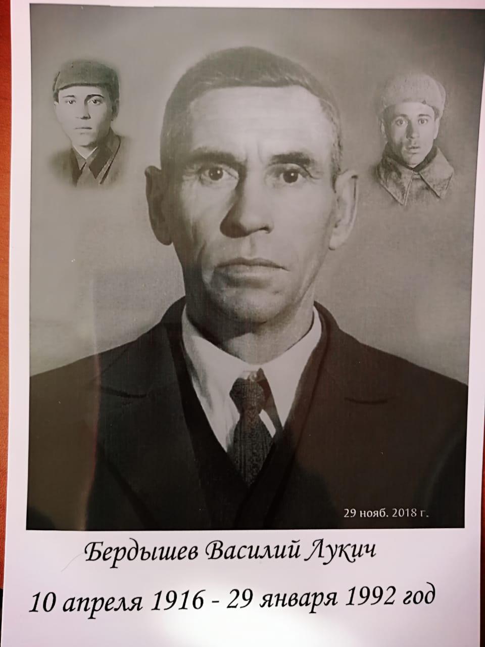 Бердышев Василий Лукич Звание: Старшина, Должность: радиотехник Призван: Каменским РВК Алтайского края на действительную службу. С сентября 1938 года по апрель 1943 года проходил военную службу в 94 стрелковом полку, с апреля 1943 года по 15 декабря 1945 года во 2-м отдельном батальоне связи. В отечественной войне с 23-го сентября 1941 года на Карельском фронте В боях за Социалистическую Родину против немецко-фашистских захватчиков с 23 апреля 1941 года по 15 сентября 1944 года проявил образец мужества выносливости, инициативы и умелого сложной мастерства в освоении и проведении сложной техники связи к боевой готовности. В период наступательных боев части с 13-го по 31 марта1944 года в трудных условиях зимы Бердышев В.Л., как отличный радиомонтер, исправной радиоаппаратурой части дивизии способствовал выполнению боевой задачи командования. 10 сентября 1944 года в период боев 326 стрелкового полка вышла из строя радиостанция обеспечивающая связь командира с командованием. Товарищ Бердышев сам лично под сильным артиллерийско-минометным огнем противника вышел в район боев полка и на месте за 10 минут устранил сложное повреждение и связь с действующим полком была установлена в срок. В период наступательных боев частей дивизии и в период активной обороны благодаря умелой кропотливой работе товарища Бердышева радиоаппаратура всегда находится в отличном состоянии и боеготовности. Весь производимый ремонт аппаратуры производится качественно и быстро. Награжден Орденом Красной Звезды, Орденом Отечественной войны второй степени