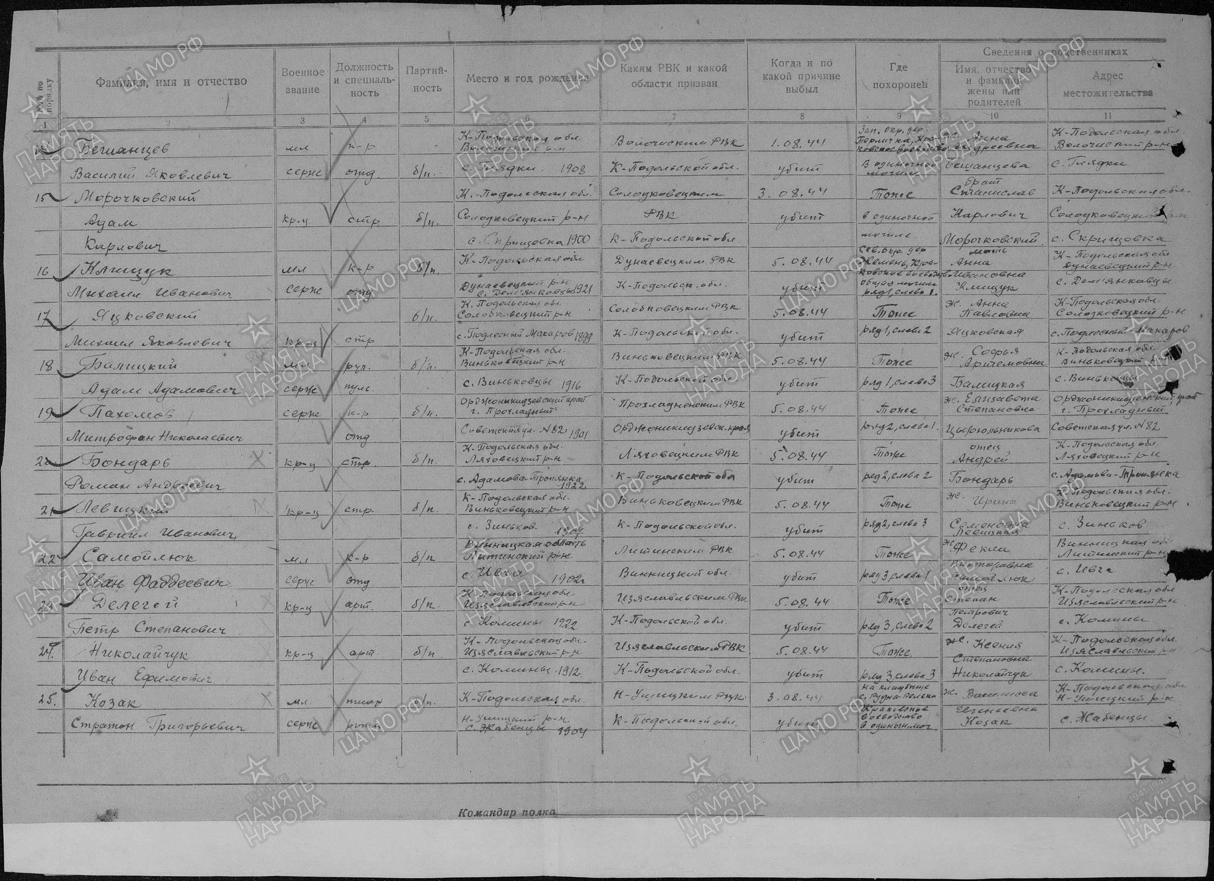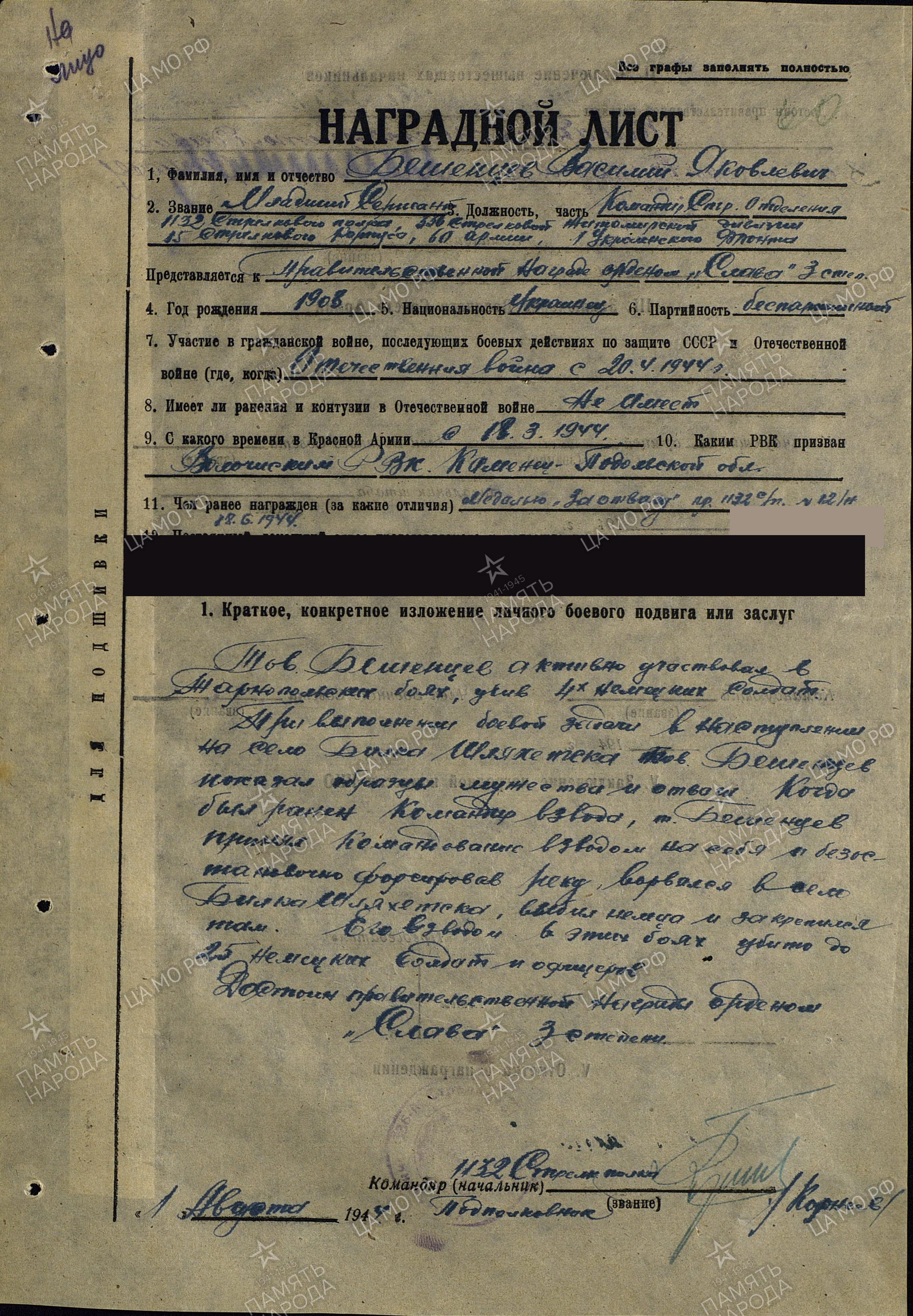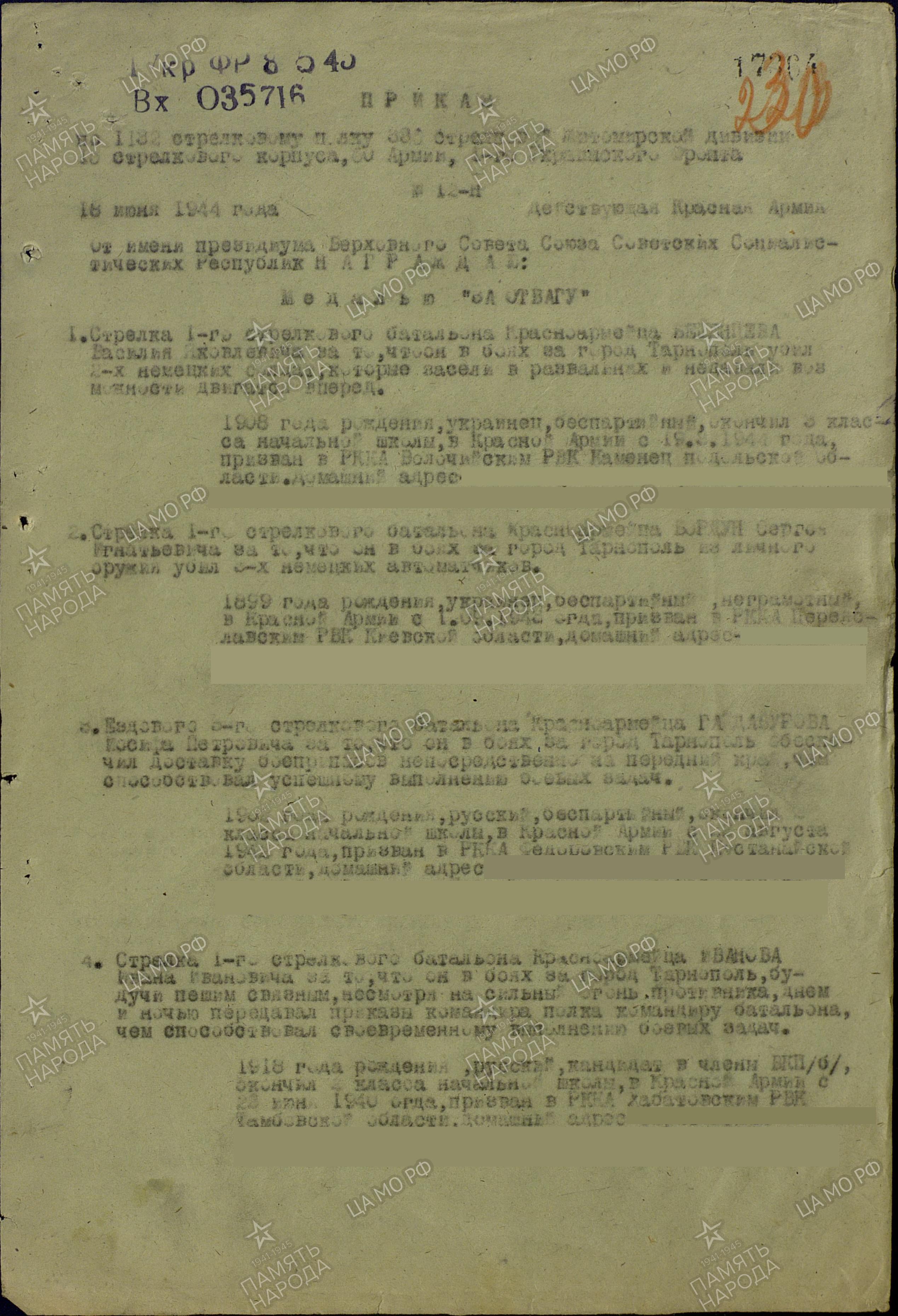 Должность, часть: командир стрелкового отделения 1132 стрелкового полка, 336 стрелковой житомирской дивизии, 15 стрелкового корпуса, 60 армии, 1 Украинского фронта.