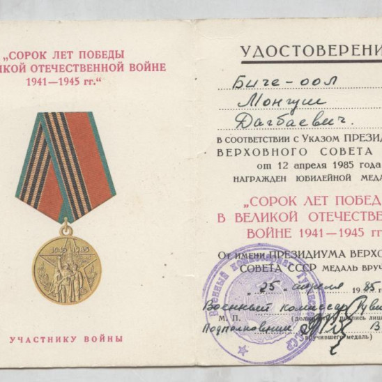 Биче-оол И.Д. принял участие в материальной помощи – отдал 1 лощадь, 4 быков. А 1 сентября 1943г. вместе с тувинскими добровольцами отправился на фронт. Его назначили поваром взвода. Принимал участие в боях за Дубно. В сражения около реки Иква был ранен. После войны в родном совхозе трактористом, чабаном.