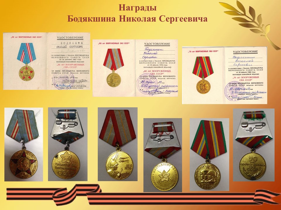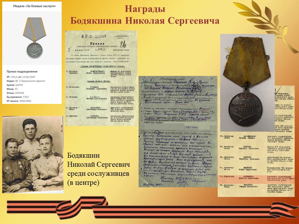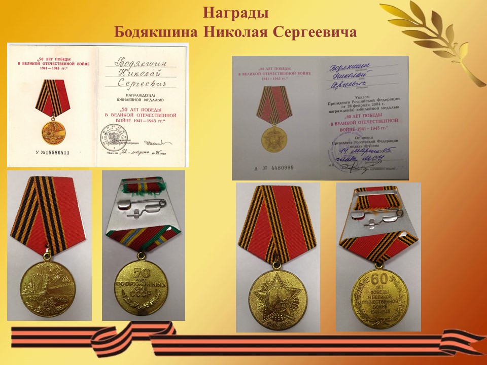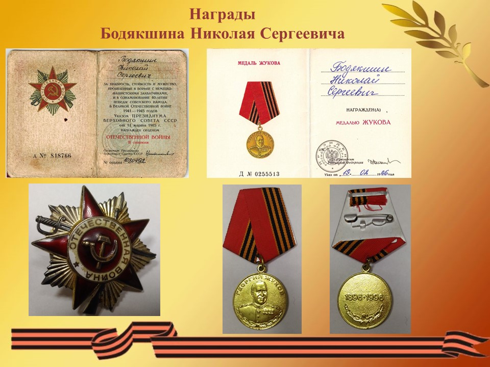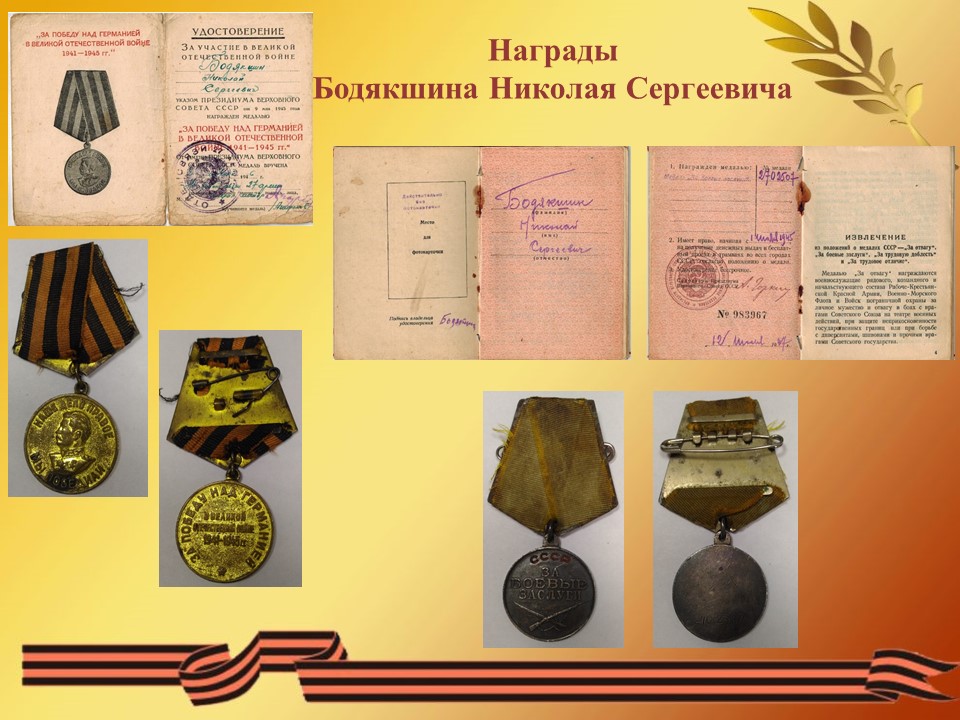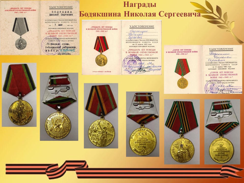 Бодякшин Николай Сергеевич, родился 09 августа 1919 года в селе Пермеёво Большеболдинского района Горьковской области. Окончил 6 классов. С 1930 - 1932 годы работал в лесу, а в 1933 году пас стадо в Безбожнике. С мая 1936 года по 1938 год работал по вербовке в городе Горьком, а в 1939 году в Павлове. (из автобиографии Бодякшина Н. С.) 5 августа 1939 году Тумботинский сельский совет Павловского района Горьковского края зарегистрировал брак между Бодякшиным Николаем Сергеевичем и Надежкиной Марией Васильевной (31.08.1919 года рождения) сохранилось свидетельство о браке от 05.08.1939 г. № 39. Но семейная жизнь оказалась не долгой и уже 4 сентября 1939 года Бодякшина Н. С. призвали в армию. Служил под Москвой в Сокольниках в первом полку связи Московского военного округа. 22 февраля 1941 года за отличные показатели в боевой и политической подготовке, отличное несение службы и примерную дисциплину награжден нагрудным знаком «Отличник РККА» (приказ народного комиссара обороны союза ССР от 22.02.1941 года № 108, за подписью маршала Советского Союза Тимошенко С. К.). «Прошел Украину, Молдавию Румынию, Болгарию, Югославию. Форсировали реки: Дон, Днестр, Днепр, Дунай – 4 раза. В боях в рукопашную не приходилось воевать, только отстреливаться во время отступления. Днепропетровск, Курская дуга тянули связь без перебоя и восстанавливали её во время боя. Победу встретил в Австрии левее Вены, встретили вместе с американскими войсками. С войны вернулся в сентябре 1947 году в воинском звании ефрейтор.» (из автобиографии Бодякшина Н. С.). Демобилизовался Николай Сергеевич в сентябре 1947 года. В 1948 году работал завхозом в школе. С 1949 года по 1954 год работал на Маслозаводе грузчиком и вторым шофером. Работал завхозом в Большеболдинской больнице 2 месяца, затем до апреля 1960 года в Большеболдинской школе. С апреля 1960 года до 15 февраля 1980 года был заведующим фермой Пермеевского колхоза «Власть советов». Был депутатом Пермеевского сельского совета с 1963 года по 1979 год. Ушел на пенсию 9 августа 1979 года. Имеет 7 детей, 12 внуков, 12 правнуков и 2 праправнука. Умер 15 октября 2009 года в возрасте 90 лет. Похоронен на Пермеевском кладбище.