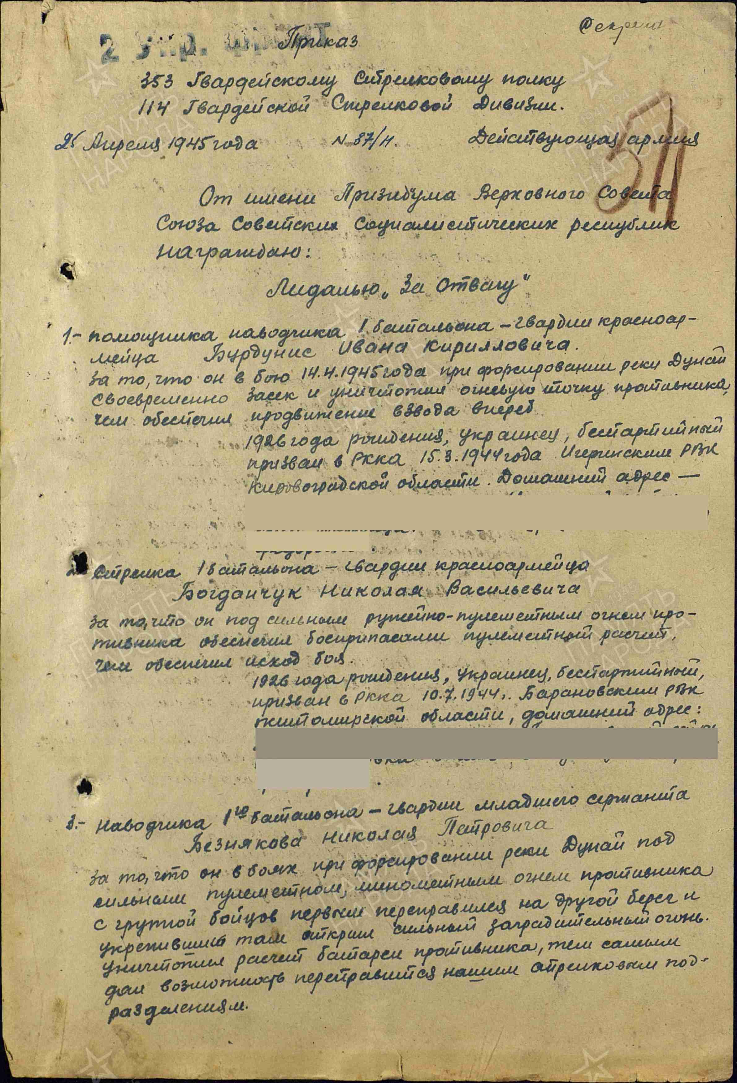 Богданчук Николай Васильевич родился на Украине, в Житомирской области, село Ивановка, откуда уже в апреле 44-го ушел в армию, а в мае исполнилось 18 лет. Был курсантом стрелкового полка, затем довелось воевать снайпером, служить в разведке, затем уже сапером в составе Второго Украинского фронта, прошёл с боями Австрию, Венгрию, получил медаль за отвагу. Закончил службу в 1950 году, его часть была направлена в город на Волге - Рыбинск Ярославской области. Там он создал семью, вырастил четверых детей, долгие годы работал на заводе, где имел почетные звания за отличный труд.