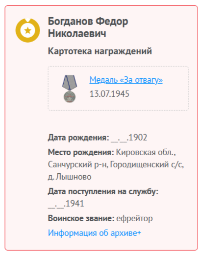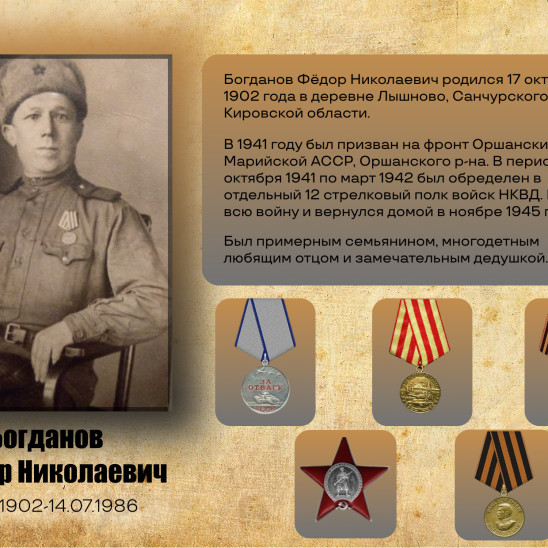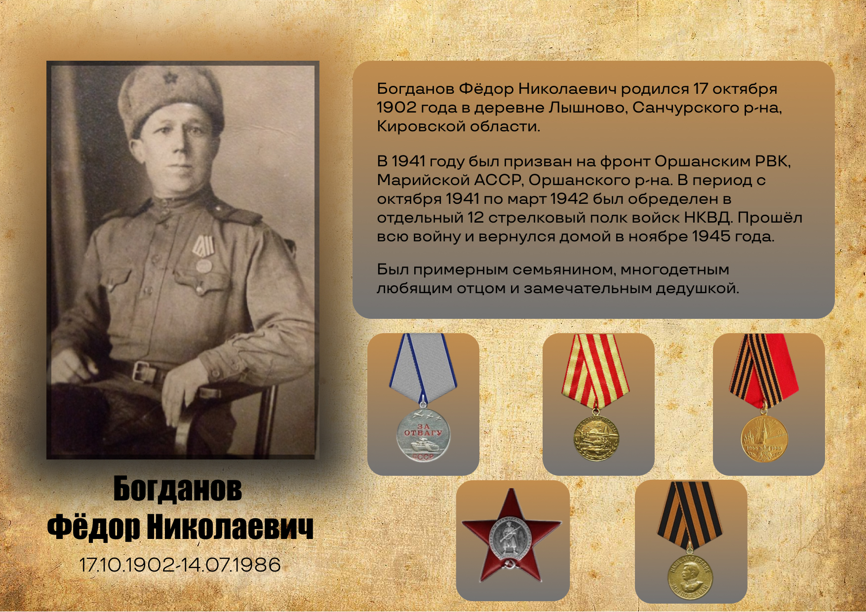 Богданов Фёдор Николаевич родился 17 октября 1902 года в деревне Лышново, Санчурский р-н, Кировская область. С супругой, Соколовой Евдокией Ивановной, проживал в деревне Соловьи, Медведевского района, Марий Эл. В 1941 году был призван на фронт Оршанским РВК, Марийской АССР, Оршанского р-на. В период с октября 1941 по март 1942 был определён в отдельный 112 стрелковый полк войск НКВД. Позже этот полк был присоединён к 6 гв. армии, которая преобразована 16 апреля 1943 г. из 21-й армии (1-го формирования). Первоначально в армию вошли 51-я, 52-я, 67-я, 71-я гвардейские и ряд других стрелковых дивизий, которые были затем сведены в 22-й и 23-й гвардейские стрелковые корпуса. Армия в составе Воронежского фронта участвовала в Курской битве. В октябре 1943 г. вошла в состав Прибалтийского (с 20 октября 1943 г. 2-й Прибалтийский) фронта и заняла оборону северо-западнее г. Невель, где вела оборонительные бои до января 1944 г., а затем участвовала в разгроме невельской группировки противника. Летом 1944 г. в составе 1-го Прибалтийского фронта принимала участие в Витебско-Оршанской, Полоцкой, Шяуляйской, осенью – в Рижской и Мемельской наступательных операциях. В последующем соединения армии вели бои против группировки противника, блокированной на Курляндском полуострове. Войска армии участвовали в освобождении городов: Дисна, Полоцк (4 июля 1944 г.) – в ходе Полоцкой операции 1-го Прибалтийского фронта; Браслав (6 июля 1944 г.), Даугавпилс (27 июля 1944 г.), Грива (28 июля 1944 г.), Зарасай, Илуксте (29 июля 1944 г.), Рокишкис, Субата (ныне Субате) (31 июля 1944 г.) – в ходе Шяуляйской операции 1-го Прибалтийского фронта; Екабпилс (9 августа 1944 г.) – в ходе Белорусской операции 1-го Прибалтийского фронта; Кулдига (9 мая 1945 г.) – при капитуляции курляндской группировки противника войскам Ленинградского фронта. В Действующей армии находилась с 1 мая по 30 сентября 1943 и с 15 октября 1943 по 9 мая 1945 г. Печатный орган – газета «Боевой натиск» . Богданов Фёдор был примерным семьянином, многодетным любящим отцом и замечательным дедушкой. У Фёдора родилось 8 детей, 12 внуков и большое количество правнуков.