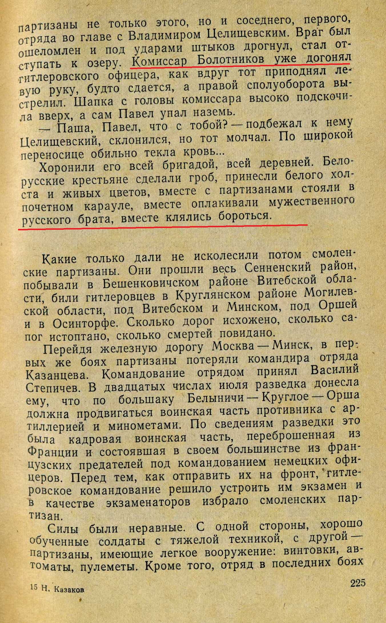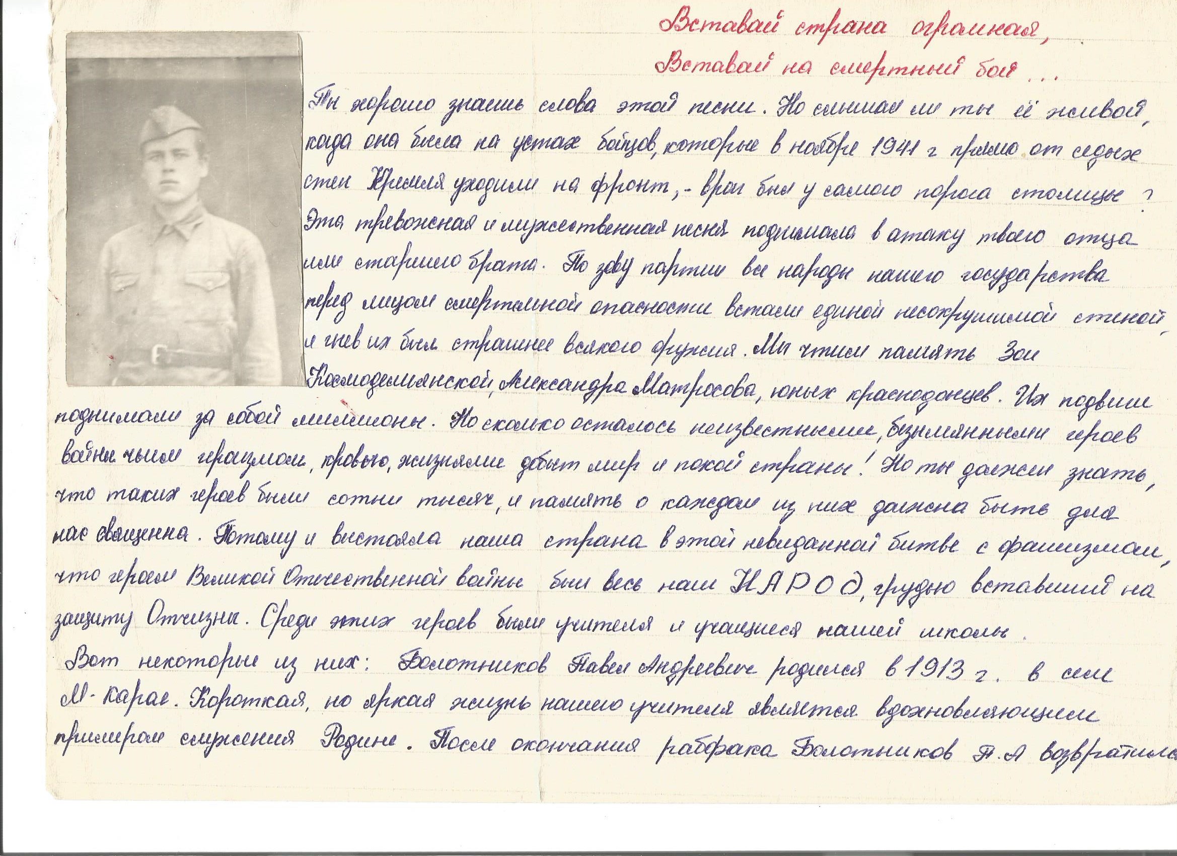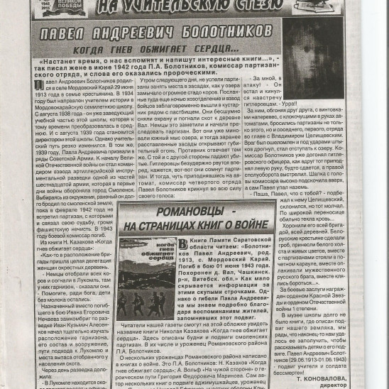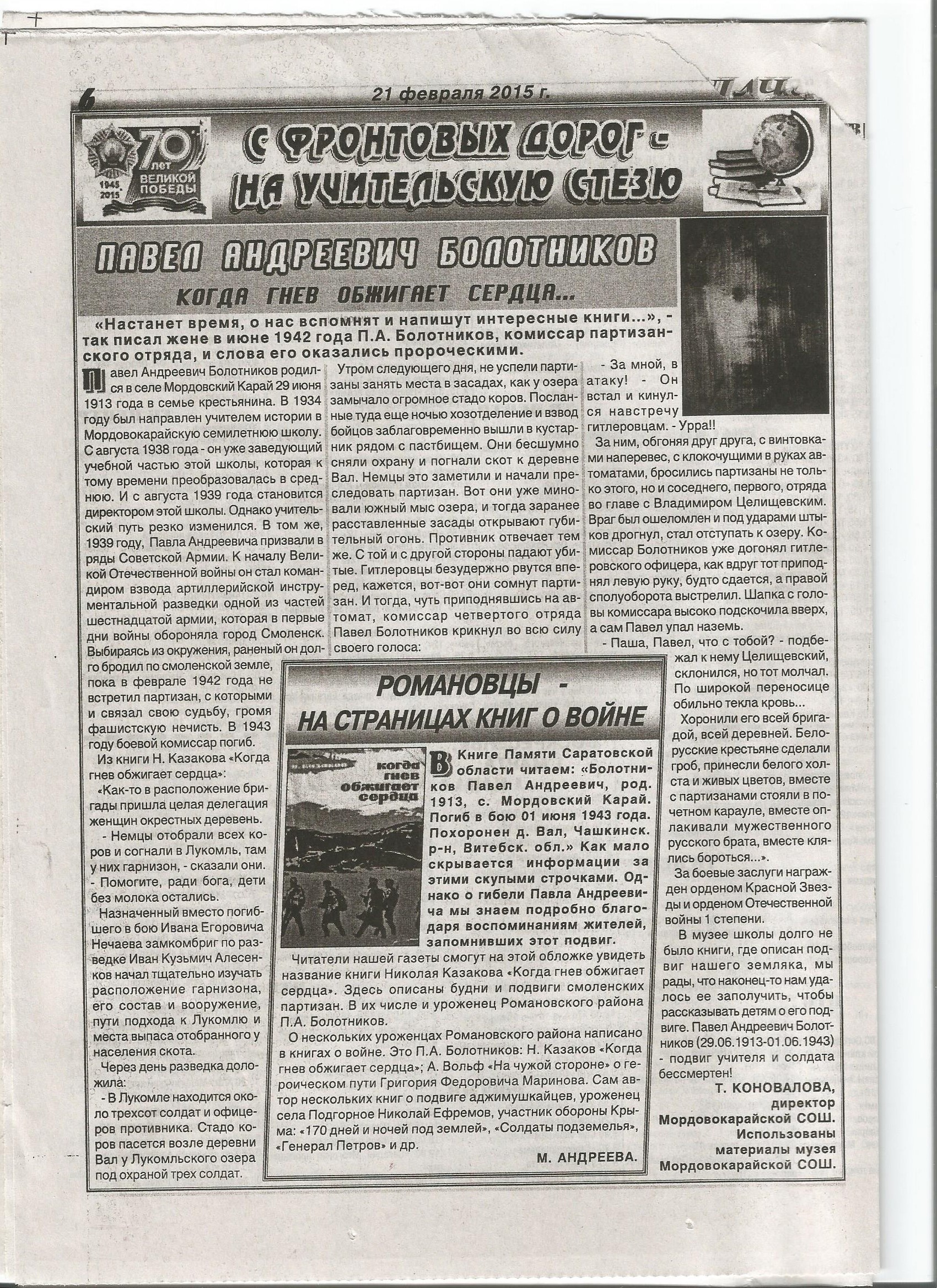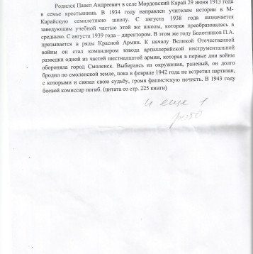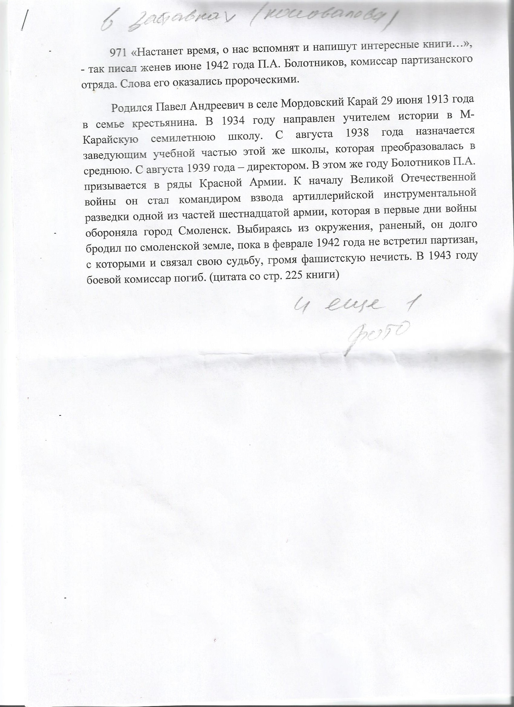 Село Мордовский Карай. Погиб в бою 1941 г Похоронен с. Кукуевка Болховского р-на 01 июня 1943 г. Похоронен д. Вал Чашкинского р-на Витебской обл. «Настанет время, о нас вспомнят и напишут интересные книги…», - так писал жене в июне 1942 года П.А. Болотников, комиссар партизанского отряда. Слова его оказались пророческими. Родился Павел Андреевич в селе Мордовский Карай 29 июня 1913 года в семье крестьянина. В 1934 году направлен учителем истории в М-Карайскую семилетнюю школу. С августа 1938 года назначается заведующим учебной частью этой же школы, которая преобразовалась в среднюю. С августа 1939 года – директором. В этом же году Болотников П.А. призывается в ряды Красной Армии. К началу Великой Отечественной войны он стал командиром взвода артиллерийской инструментальной разведки одной из частей шестнадцатой армии, которая в первые дни войны обороняла город Смоленск. Выбираясь из окружения, раненый, он долго бродил по смоленской земле, пока в феврале 1942 года не встретил партизан, с которыми и связал свою судьбу, громя фашистскую нечисть. В 1943 году боевой комиссар погиб. (цитата со стр. 225 книги)