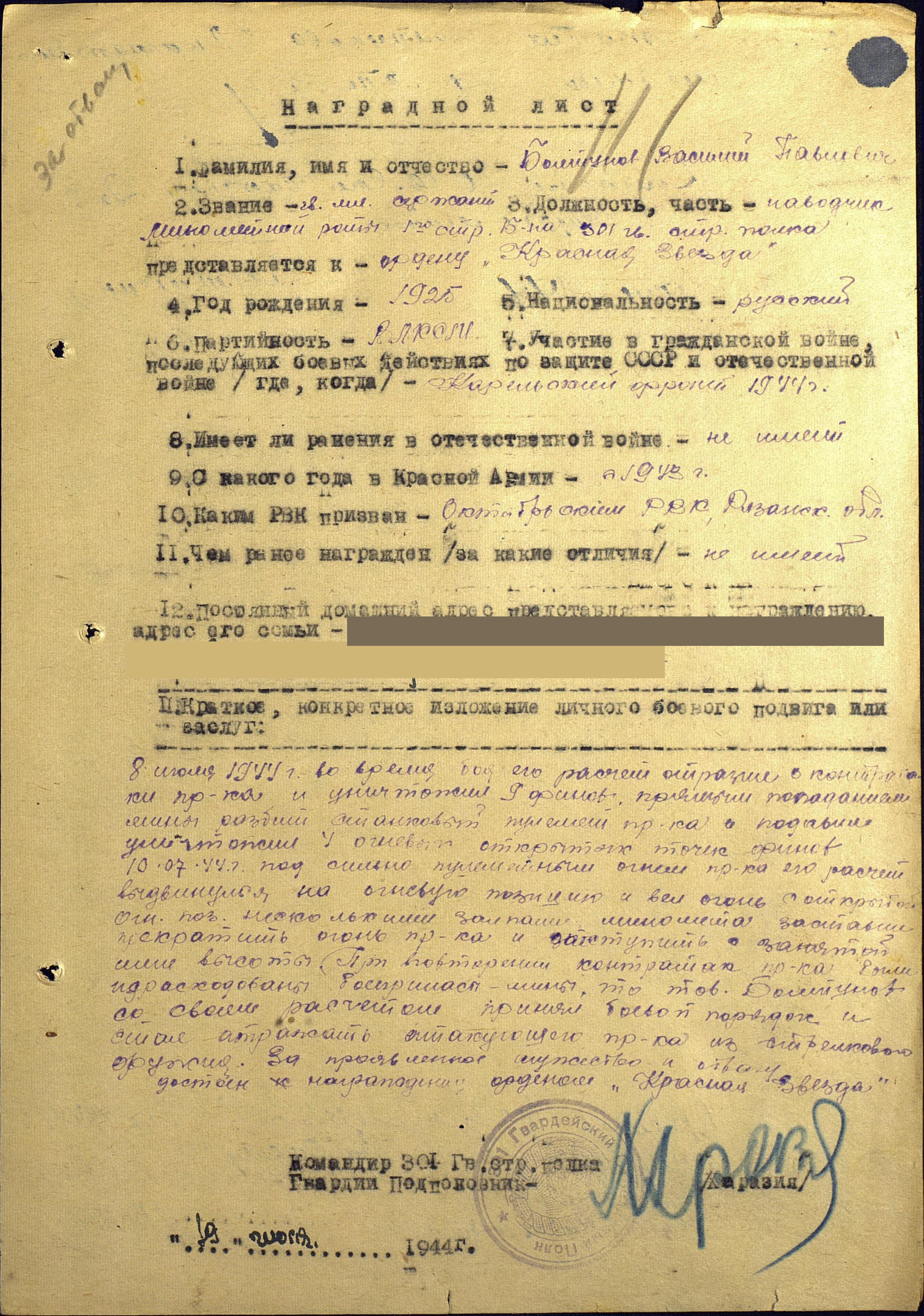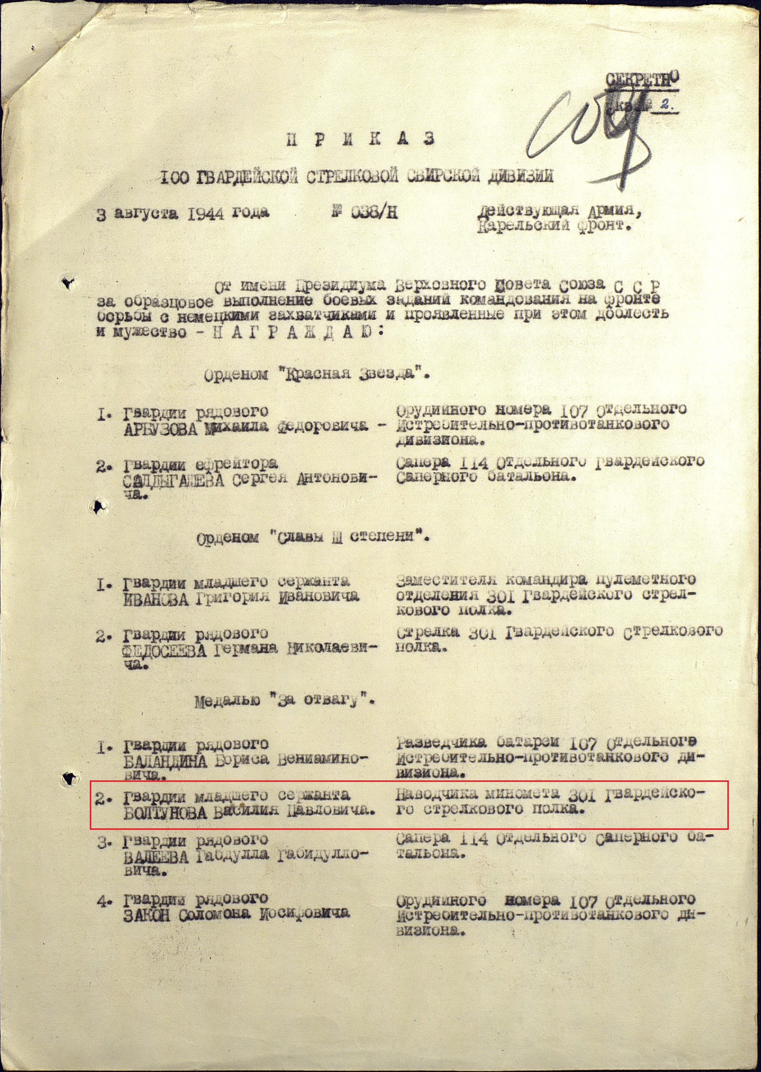 8 июля 1944 года во время боя отразил контратаки противника и уничтожил 9 финов, прямым попаданием мины разбил станковый пулемёт противника. 10 июля вёл огонь с открытой огневой позиции, заставив противника отступать. За проявленное мужество и отвагу награждён орденом «Красной Звезды». Также был награжден медалью «За отвагу», орденом Отечественной войны II степени и орденом