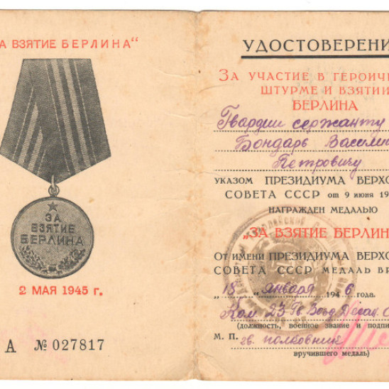Бондарь Василий Петрович призвался в Красную Армию в марте 1944 года. Принимал участие в боевых действиях в Польше, Германии и Чехословакии. На Сандомирском плацдарме (Польша) был контужен. В марте 1945 за форсирование реки Одер был награжден медалью "За Отвагу", далее была Германия - Берлинское направление, за что награжден медалями "За взятие Берлина" и "Освобождение Праги". По окончании войны продолжил службу в Центральной группе войск в г.Жатец (Чехословакия), в г.Дсер (Венгрия), затем служба в Группе Советских войск в Германии - город Ютербог. В декабре 1946 из Германии направлен в Советский Союз на Урал в город Чебаркуль Челябинской области в танковую учебную бригаду. В марте 1947 года по окончании учебы направлен в г. Симферополь служить в должности командира орудия тяжелого танка ИС-3.