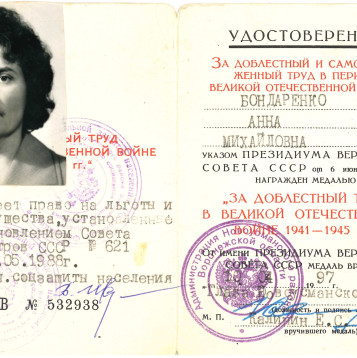 Бондаренко (Селезнёва) Анна Михайловна, родилась в 1929 году, в селе Орлово, Воронежской области в крестьянской многодетной семье. Анна была четвертым ребенком из пяти.