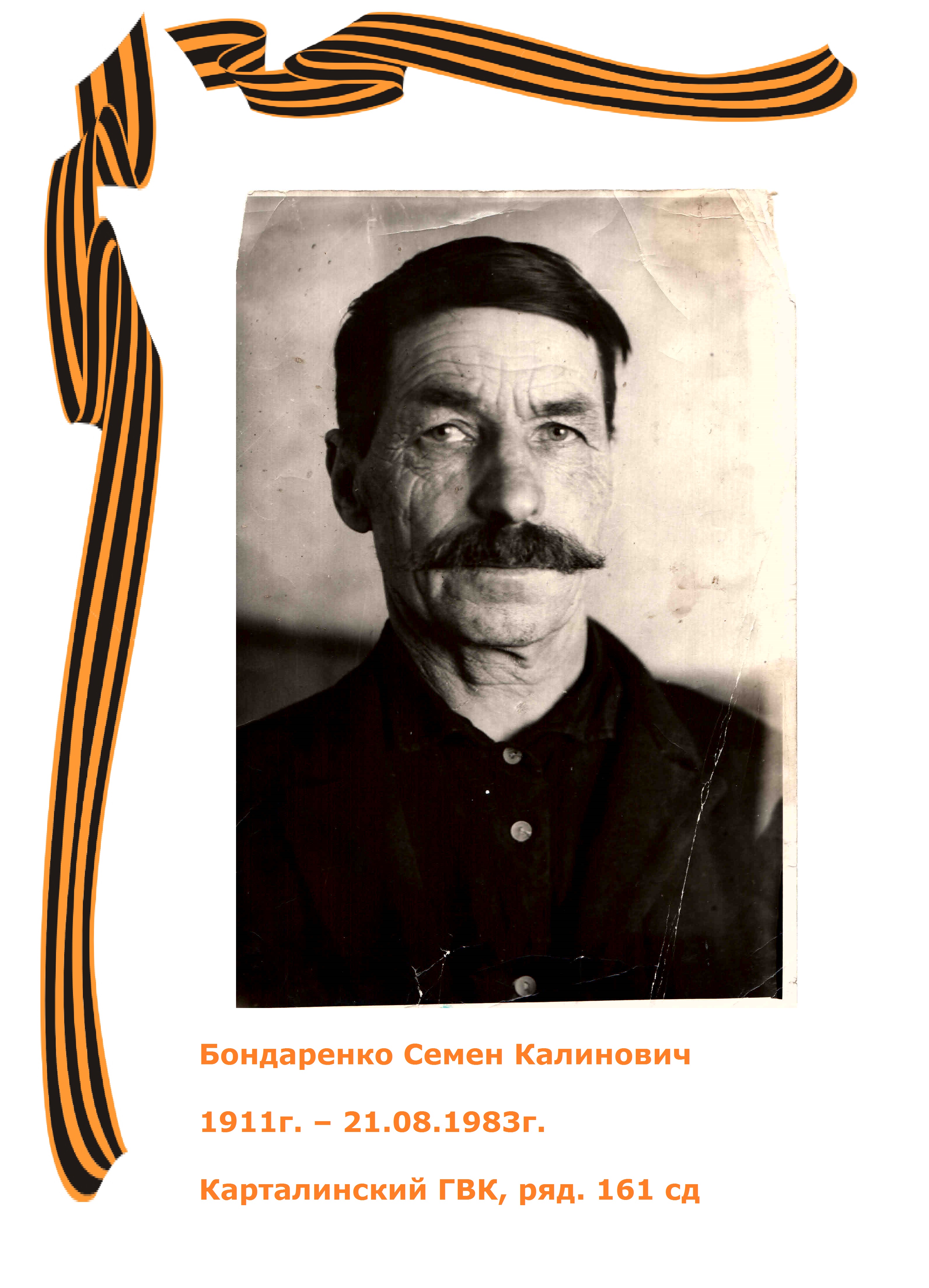 1911 г.р., звание - красноармеец, место призыва:Полтавский РВК, Челябинская обл., Полтавский р-н. Удостоен Медали "За отвагу" за то, что в районе села Липница Мала 03.02.1945 года прямым попаданием снаряда в здание склада с боеприпасами противника уничтожил его, кроме того уничтожил две пулеметные точки противника.Умер 21.08.1983 г. Карталинский район, п. Южно-Степной.