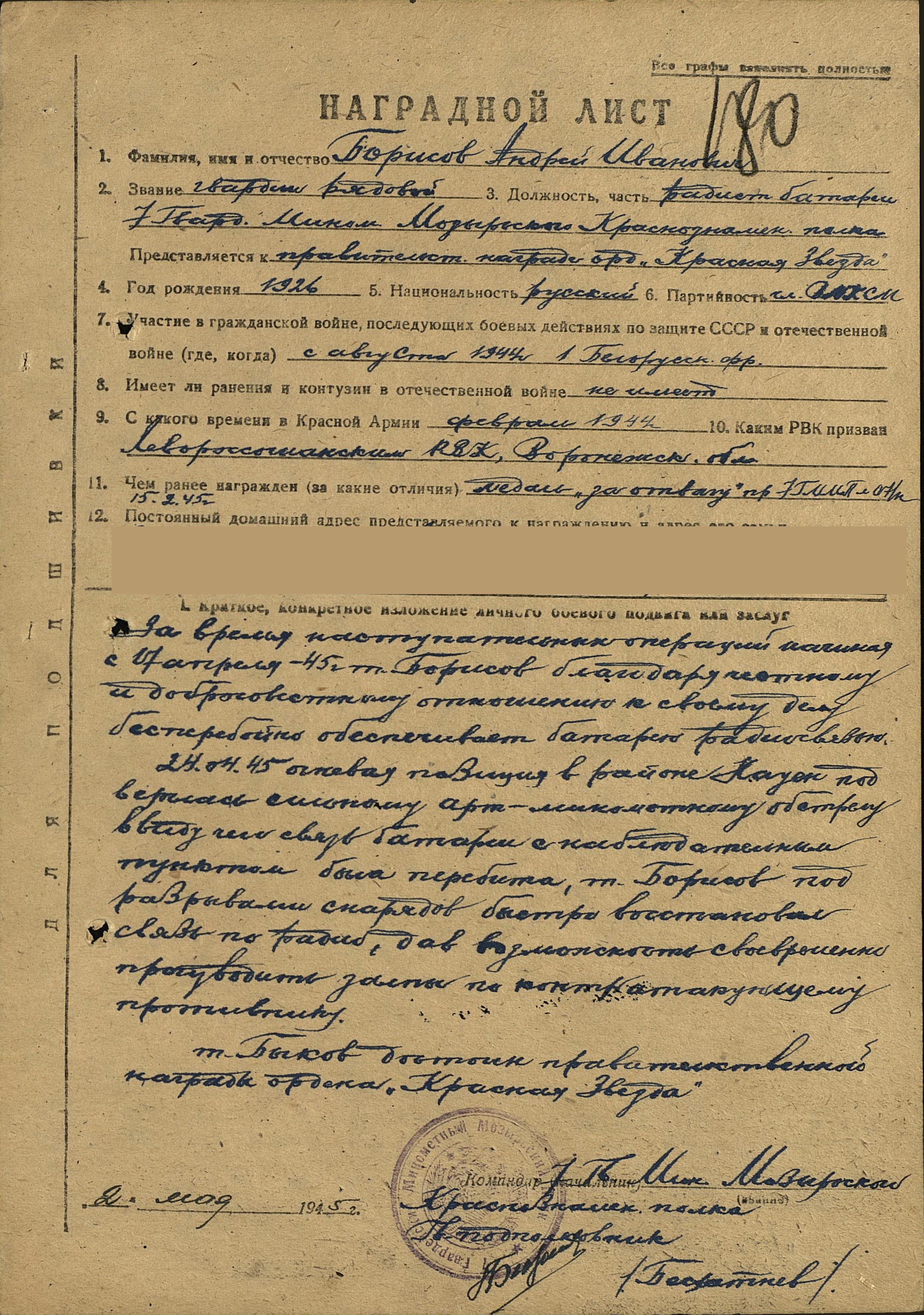 Место рождения: Воронежская область, Каширский район. с. Боево