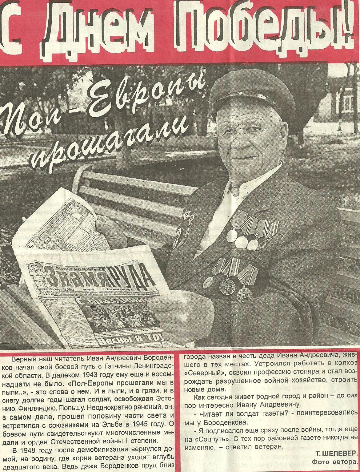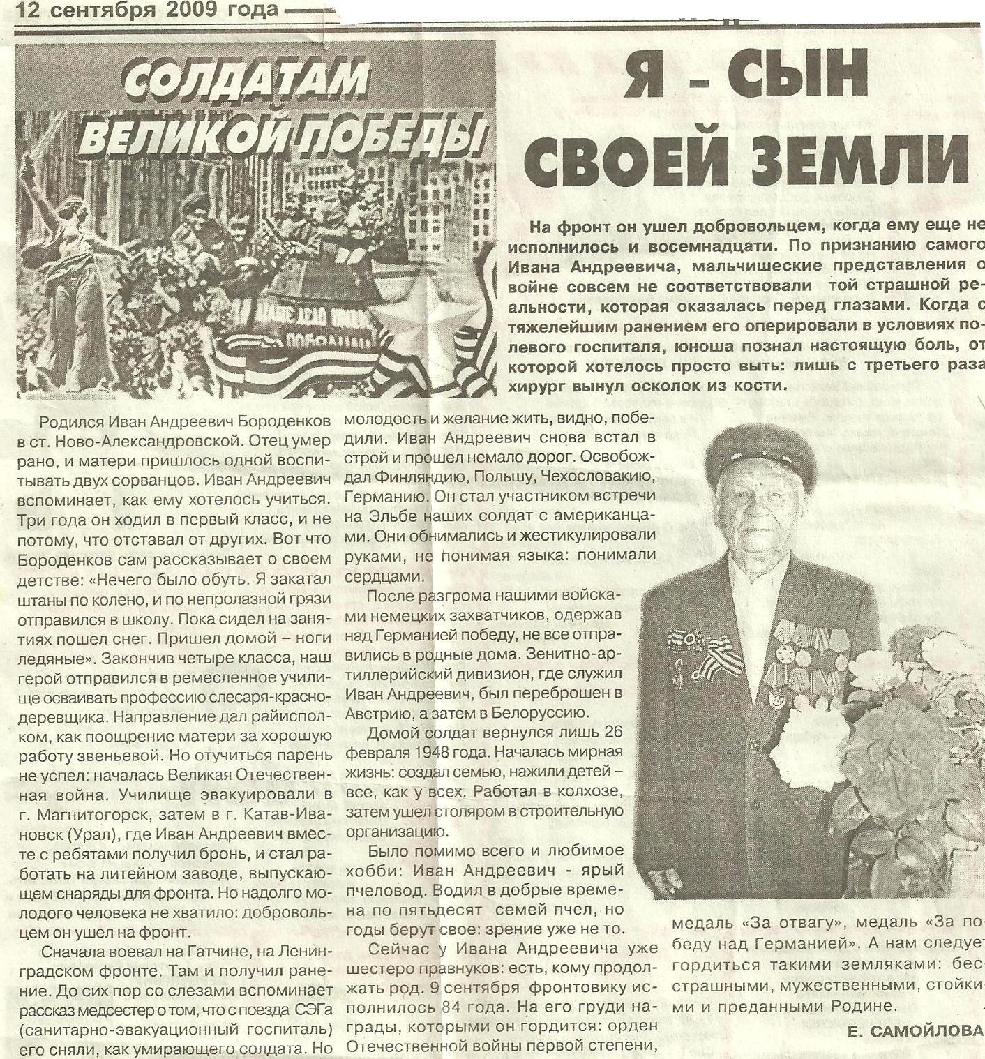 Иван Андреевич Бороденков родился в станице Новоалександровской. Окончив четыре класса, Иван Андреевич отправился в ремесленное училище осваивать профессию слесаря — краснодеревщика. К сожалению, отучиться он не успел: началась Великая Отечественная война. Училище эвакуировали, так Иван Андреевич попал в город Катав-Ивановск на литейный завод, где выпускали снаряды для фронта. Но надолго его не хватило: добровольцем ушел на фронт. Сначала воевал на Гатчине, на Ленинградском фронте, где получил ранение. Со слезами он вспоминает рассказ медсестер о том, что с поезда СЭГа его сняли как умирающего солдата. Но видно желание жить победило, и юный солдат снова встал в строй. Иван Андреевич участвовал в освобождении Финляндии, Польши, Чехословакии, Германии. Он стал участником встречи на Эльбе наших солдат с американцами. Они обнимались и жестикулировали руками, не понимая языка: понимали сердцами. После разгрома нашими войсками немецких захватчиков, одержав над Германией победу, не все отправились в родные места. Зенитно-артиллерийский дивизион, где служил Иван Андреевич, был переброшен в Австрию на два года, а затем в Белоруссию. Домой солдат вернулся лишь 26 февраля 1948 года. Началась мирная жизнь: создал семью. Работал в колхозе, затем ушел столяром в строительную организацию. На его груди награды, которыми он гордится: орден Отечественной войны первой степени, медаль «За отвагу», медаль «За победу над Германией»