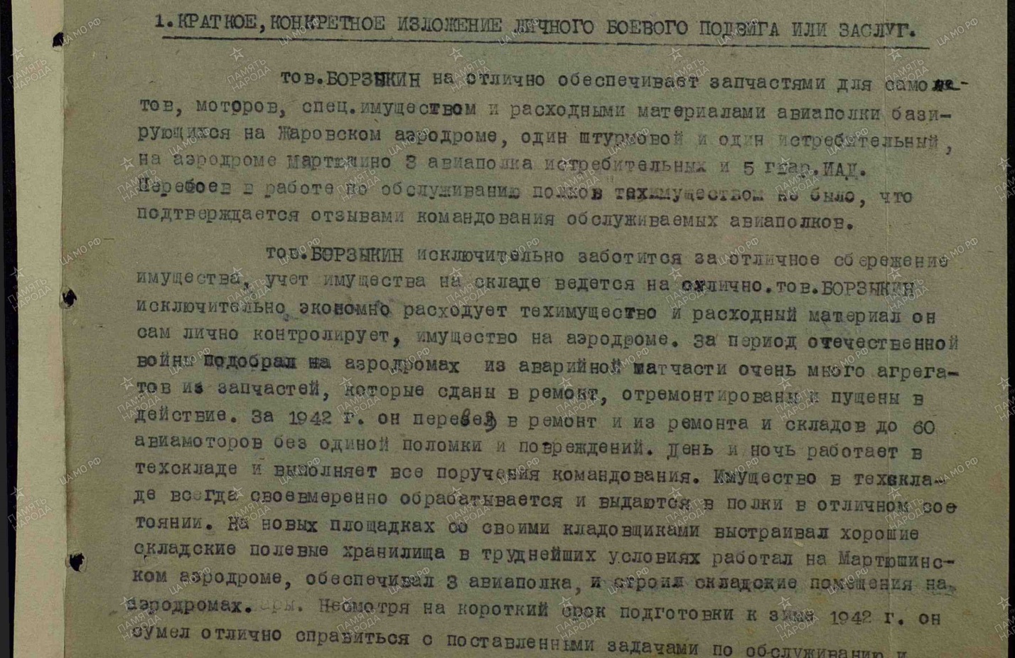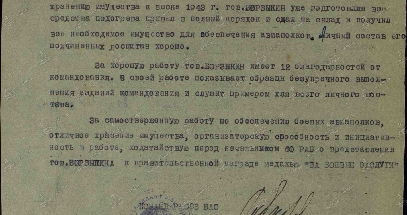 Мой прадед Борзыкин Андрей Васильевич родился 28 августа 1907 года в деревне Печки Навлинского района Брянской области в рабоче-крестьянской семье. Его отец - служащий лесхоза в пос.Навля, мать - крестьянка. Еще в семье были две сестры и брат. По тому времени в его семье все были грамотные. Одна сестра - медицинский работник, вторая - педагог, брат закончил 7 классов. Мой прадед Андрей Васильевич закончил начальную школу в деревне Девичье, находившуюся в нескольких километрах от родной деревни Печки. После призыва в армию закончил вечернюю школу рабочей молодежи и получил образование 7 классов. После того, как был призван в ряды Советской Армии, отслужил, женился и остался в армии сверхсрочно. В 1939 году был демобилизован, вернулся в Брянскую область к семье и до 1941 года служил в органах НКВД. А 22 июня 1941 года началась страшная кровопролитная война. 24 июня 1941 года мой прадед был уже призван в военкомат поселка Навля и отправлен на фронт. Служил в рядах ВВС. Мой прадед Андрей Васильевич Борзыкин на отлично обеспечивал запчастями самолеты, моторы, спец. имуществом и расходными материалами аваиаполки. Прошел всю войну с фашистской Германией. Награжден грамотами и медалями (документы прилагаю). Освобождал Белоруссию, Польшу. Участвовал в штурме при взятии Берлина, расписался на стенах Рейхстага. 7 мая 1945 года, когда все возращались домой, моего прадеда отправили в Японию, где он сражался до середины ноября 1945 года. Домой вернулся в конце ноября. Уходя на фронт, оставил дома берменную жену, мою прабабушку Борзыкину Наталью Степановну, и двух дочерей Зою (старшая дочь) и Азу (вторая дочь). А когда вернулся, у него были третья дочь Светлана в возрасте 4-х лет. Она родилась в 1941 году. Аза была в детском доме. Андрей Васильевич забрал дочь и сразу приступил восстанавливать разрушенное хозяйство в стране. Поступил на работу в Навлинский шпалопропиточный завод. Был мастером пропитки, начальником цеха. Заканчивал курсы по теории и практике в Рязанском шпалопропиточном заводе с оценками "хорошо"и "отлично". Работал до пенсии. После смерти жены (моей прабабушки) Борзыкиной Натальи Степановны уехал к своим сестрам в город Кондрово Калужской области и там продолжал работать. Будучи на заслуженном отдыхе, его неоднократно начальство просило придти поработать, так он всегда был честен, справедлив, прямолинеен. Мой прадед никогда не жаловался, не повышал голос, всегда выслушает человека. У него был девиз: "Бороться и идти! Идти и не сдаваться! Пусть на моем пути хоть тысячи препятствий!"Сколько лет прошло с тех пор,но все же Прошлого нельзя нам позабыть,Быть хочу на прадеда похожей, Родину Любить! Правнучка Виктория.