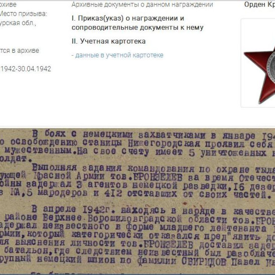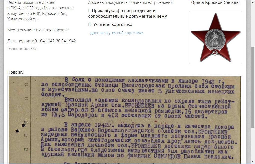 В апреле 1942г. Находясь в наряде в качестве дозора в районе Верхнее Ворошиловградской области тов. Бронзелев задержал неизвестного в форме младшего лейтенанта Красной Армии, который категорически отказался пред”явить документы. Для выяснения личности тов. Бронзелев доставил задержанного в батальон, где следствием неизвестный был разоблачен как крупный немецкий шпион по фамилии Свиридов Павел Иванович.”