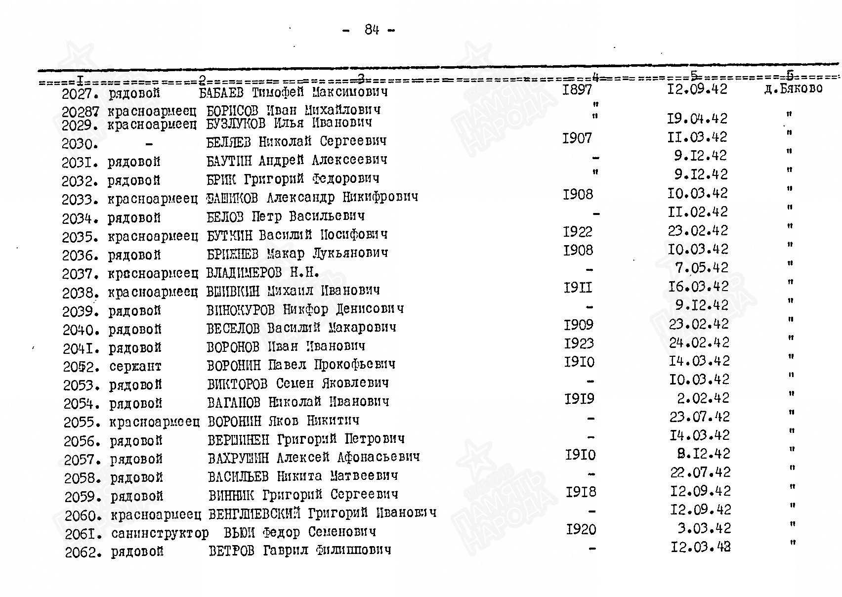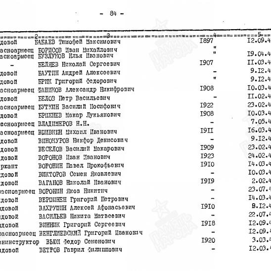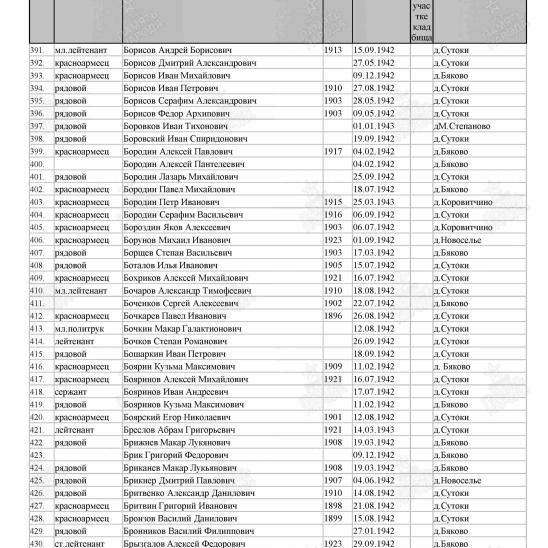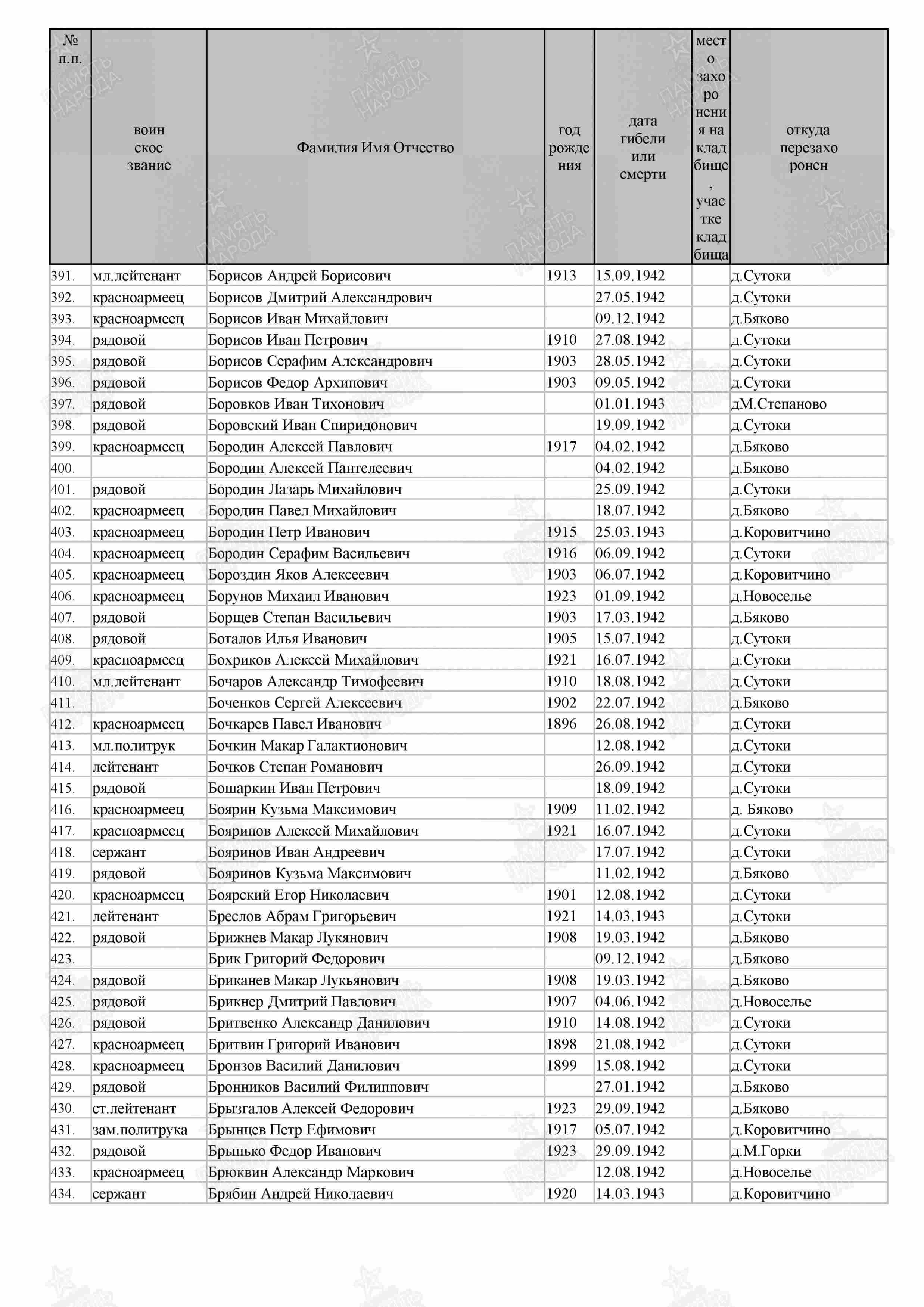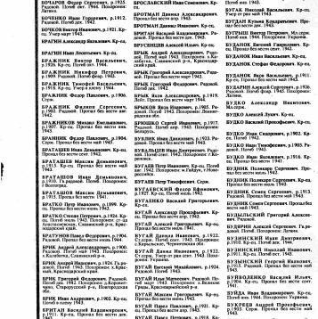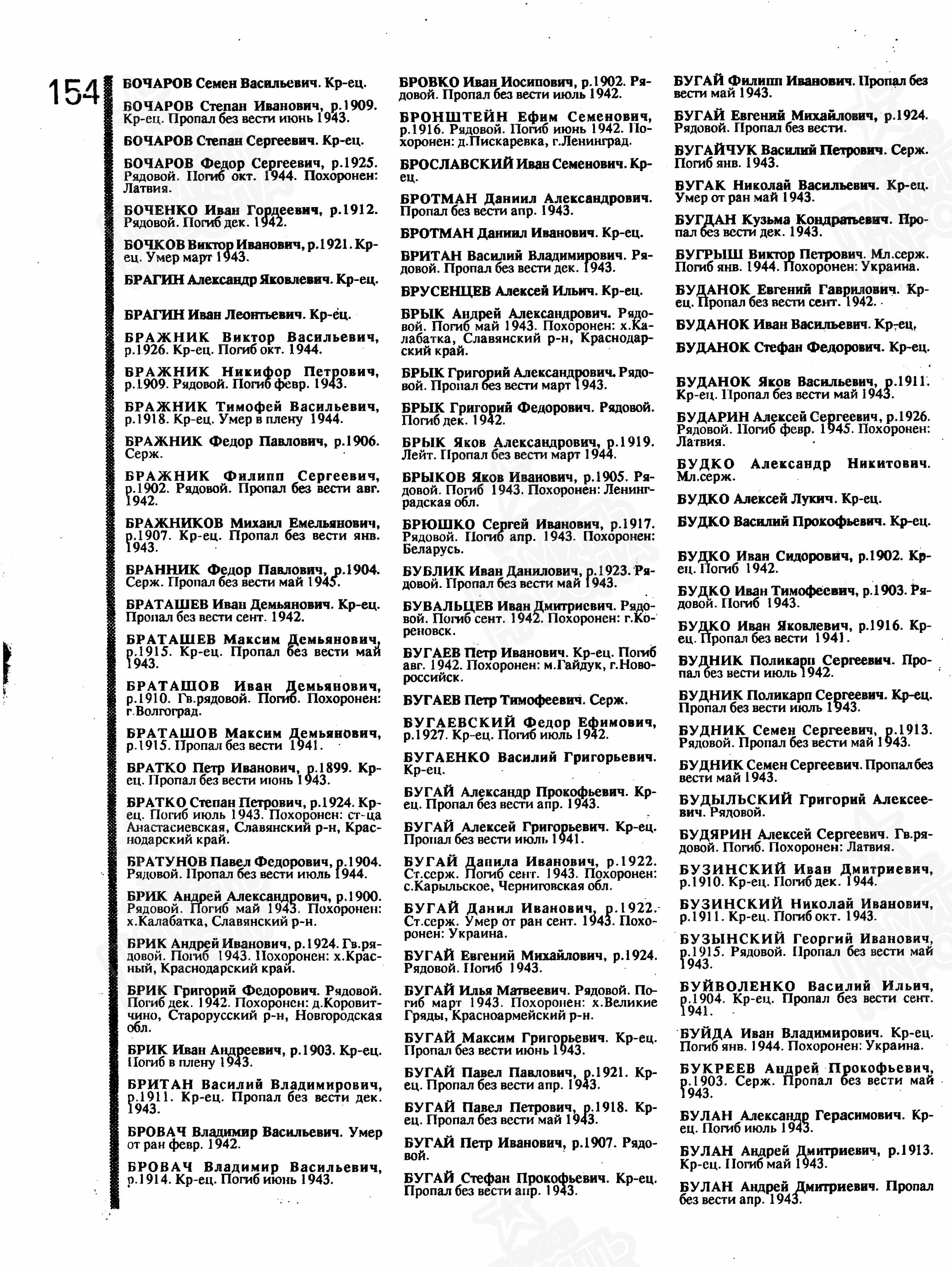 Биография Брык Григорий Фёдорович родился в 1921 году в х. Матюшевском, Кореновского р-н, Краснодарского края, РСФСР, СССР, ныне хутора не существует. Мать — Брык Софья Трофимовна, проживала на х. Братковском, Кореновского р-н, Краснодарского края, РСФСР, СССР, ныне с. Братковское, Кореновского р-н, Краснодарского края, РФ. С началом Великой Отечественной войны был призван Кореновским РВК, Краснодарского края, РСФСР, СССР, ныне Кореновский РВК, Краснодарского края, РФ, в ряды Рабоче-Крестьянской Красной Армии. Служил красноармейцем, стрелком в составе 15-й отдельной стрелковой бригады. По партийности — беспартийный. Из журнала боевых действий части: «20 стрелковая бригада с 16:00 на марше в районе сосредоточения, последняя пришла в расположение 11 армии. 11 гвардейский авиационный полк произвёл огневой налёт по артиллерийской батарее противника в районе северо-восточнее Рамушево. Потери войск армии за сутки: убито 31, ранено 184 человека, выведено из строя одно 45-миллиметровое орудие. За 9 декабря 1942 года уничтожено до 135 фашистов, из них снайперами — 105. Погода: До 12:00 сплошная облачность на высоте 600-1000 м., после 12:00 значительное прояснение. Видимость 4-10 км. Ветер северный, слабый. Температура -10 С°. Дороги: В районе действия войск местами труднопроходимы для автомобильного транспорта. Связь с войсками, штабом Северо-Западного фронта и соседями прежними средствами работала бесперебойно. Выводы: По частной наступательной операции на левом фланге армии, проведенной в период с 28 ноября до 9 декабря 1942 года. Задача, поставленная боевым приказом № 024, оказалась невыполненной, несмотря на то, что сил и средств для её выполнения было достаточно. Основными недостатками, послужившими причиной неуспеха, были следующие: 1. Времени на подготовку вновь прибывающим соединениям и частям, а также частям, производившим переподготовку, было недостаточно. 661 стрелковый полк 200 стрелковой дивизии, после смены его, сосредоточился на исходном положении для наступления накануне боя. 15 стрелковая бригада после марша сосредоточилась полностью лишь только 30 ноября 1942 года, составляя третий эшелон армии, а утром 2 декабря 1942 года выступила в бой двумя батальонами почти без всякой подготовки. Это отражалось на качество рекогносцировки, разведки обороны противника, на вопросы управления, связи и организацию взаимодействия, а в конечном счёте на ход и исход самой операции. 2. Работа штабов оказалась не на высоте своего положения. Если документальное оформление предстоящей операции можно признать удовлетворительным, то в ходе самих действий качество их работы было низкое. Штаб 15 стрелковой бригады в течение двух суток не мог организовать проволочной связи с батальонами, таблицу радиосигналов бригада-батальон составлял в день боя, и то с помощью командиров штаба армии. Несвоевременно осуществлялся контроль за действиями войск. Информация по линии штабной службы проходила несвоевременно. Штаб той же 15 стрелковой бригады в течение дня 2 декабря не знал, что делают части и какое их положение. 3. Части в достаточной степени вопросами разведки не занимались, передний край обороны противника и его огневая система до начала боя разведаны не были, действующие части истинного начертания переднего края не знали. Это также отразилось и на работе артиллерии. Работу разведыватель