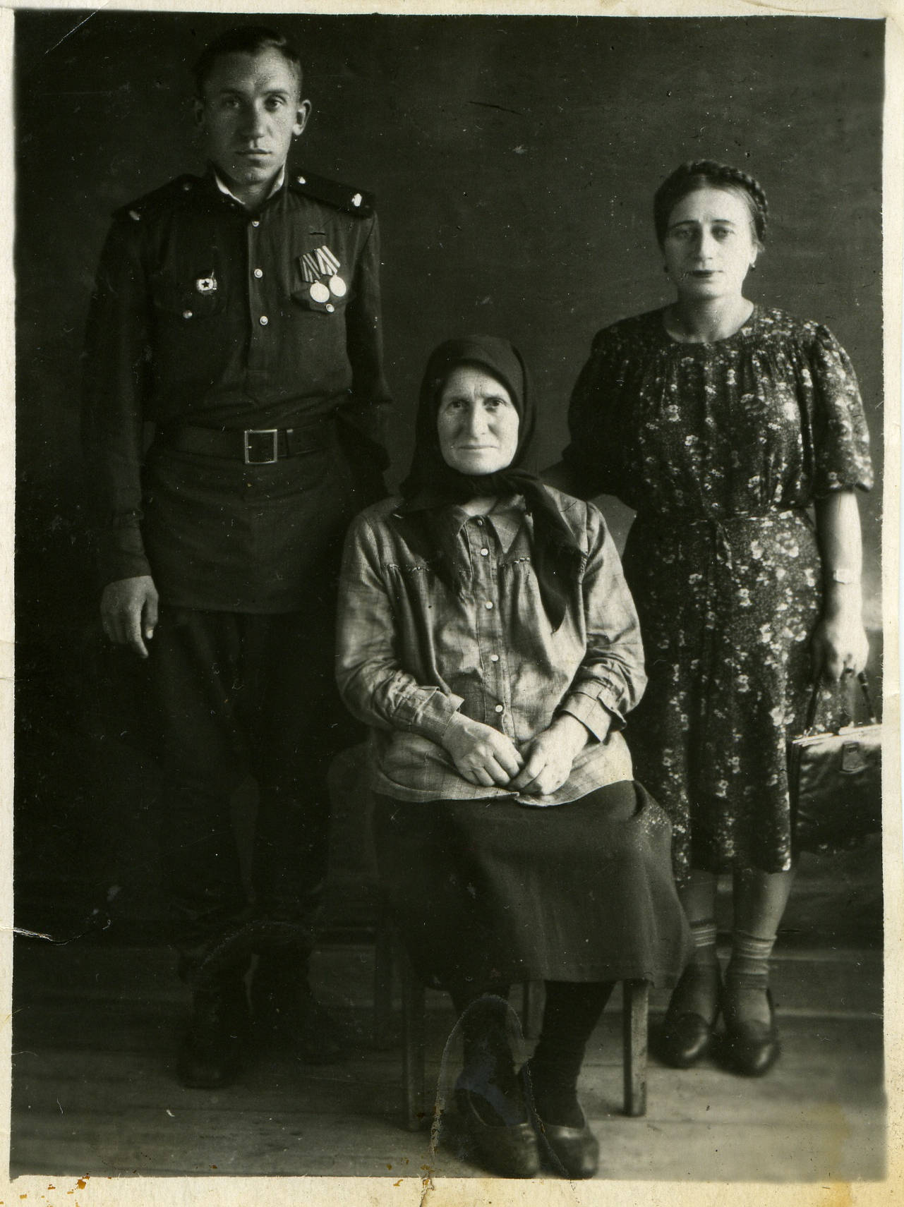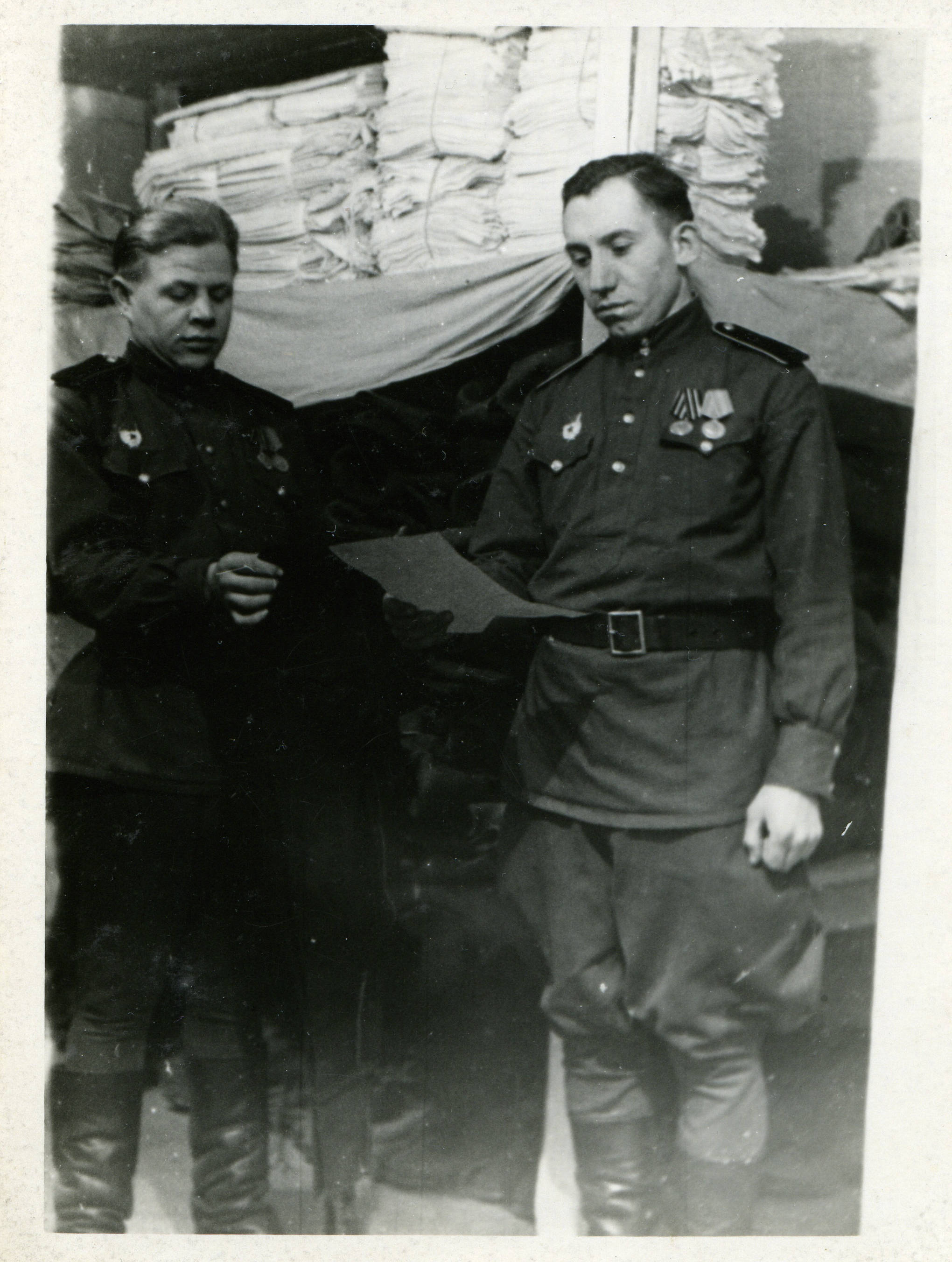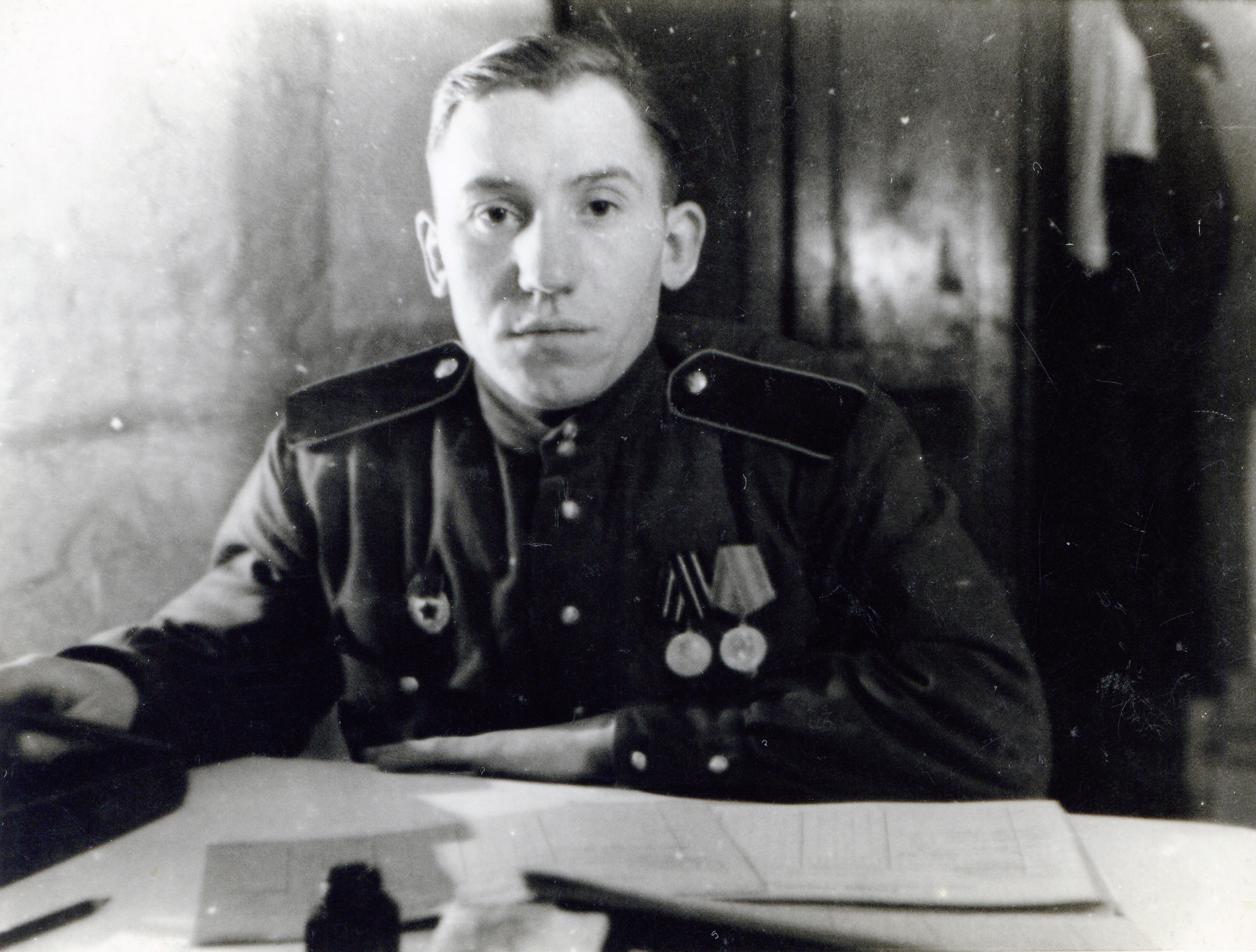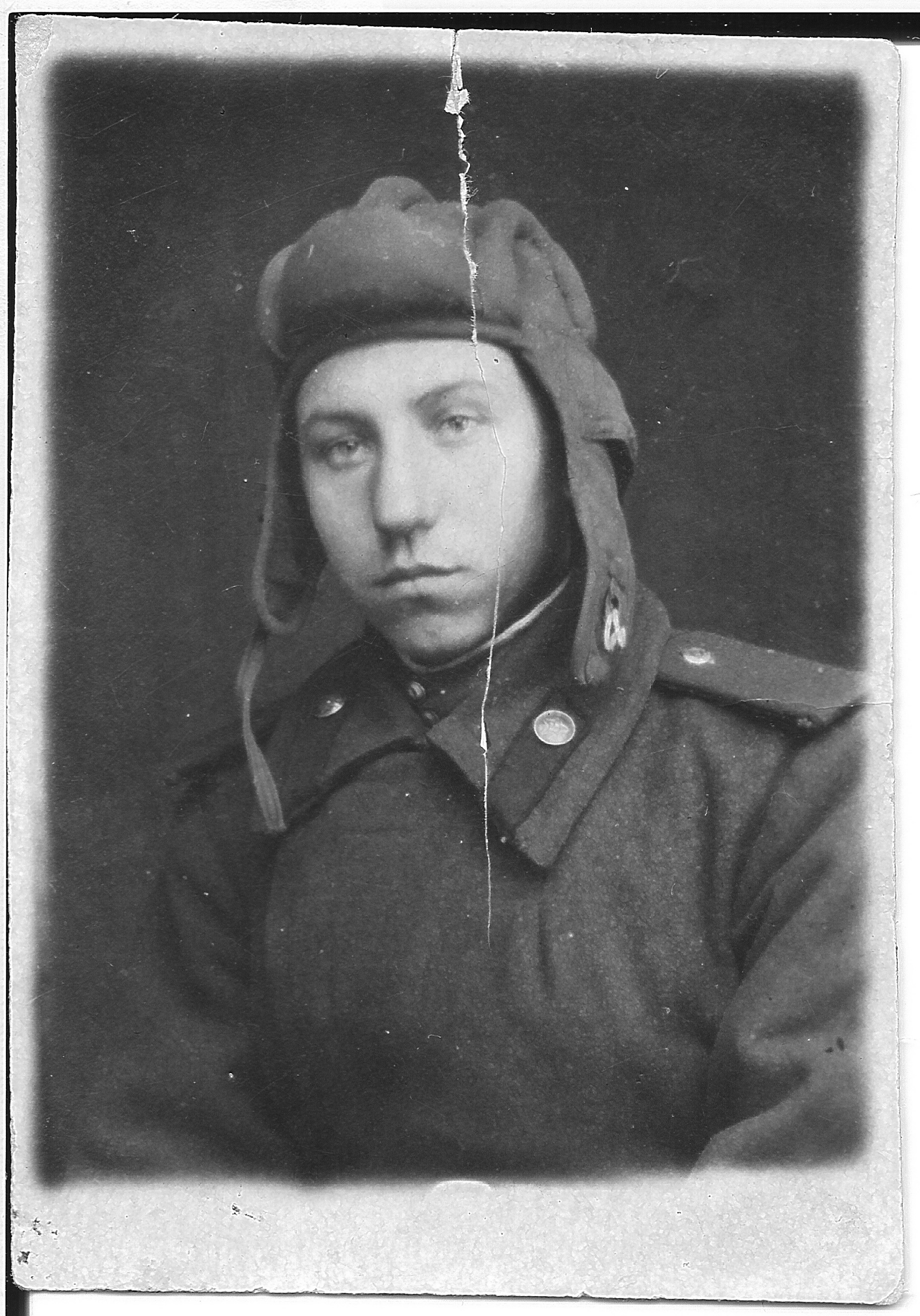 В декабре 1943 года в возрасте 18 лет забрали его в армию в 289 запасной стрелковый полк (этот полк входил в 43 запасную стрелковую бригаду) с дислокацией в г. Боготоле , готовили его снайпером. В июле 1944 г. отправили на фронт под город Тульчин Винницкой области Украинской ССР автоматчиком в/ч 31695 8 гвардейской танковой бригады ( в составе 20 танкового корпуса ). С ноября 1944 г. по декабрь 1946 г. отец был писарем при штабе (у него был удивительно красивый почерк). В марте 1945 года 20-й танковый корпус, находившийся в резерве войск Ставки ВГК, передислоцировался и сосредоточился в районе Раудтен -Дорнбруш (Германия). В апреле-мае 1945г. Войсками корпуса выполнялась боевая задача по уничтожению войск противника в районе города Глогау (Германия, ныне - Глогув, Польша) и ликвидации прорыва немецких войск к городу Бреслау (Германия, ныне - Вроцлав, Польша). В июне 1945г. войска 20-го танкового корпуса вошли в состав гарнизона города Бреслау, где отец еще 5 лет прослужил в этой же части (кладовщиком и зав. складом ОВС).