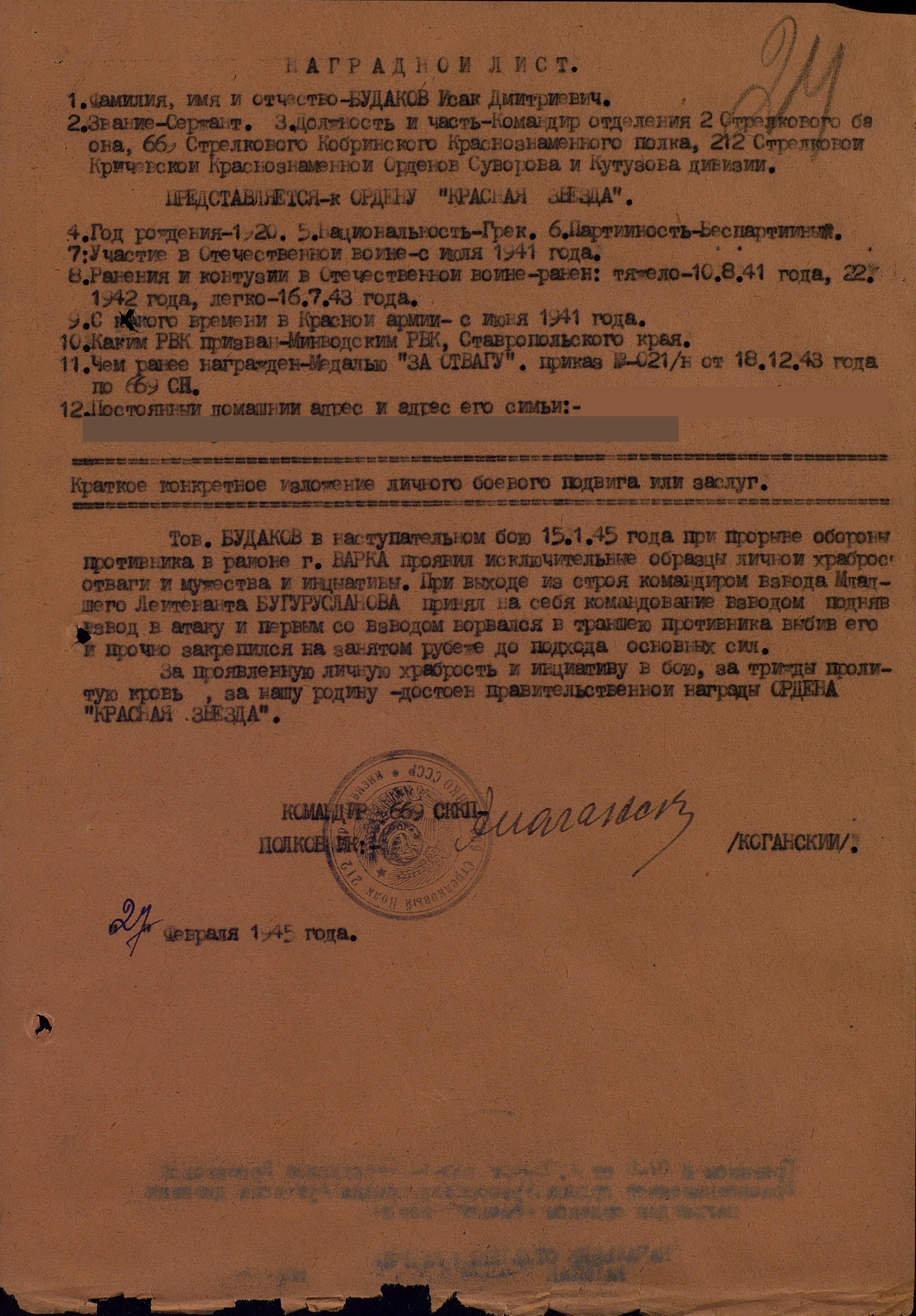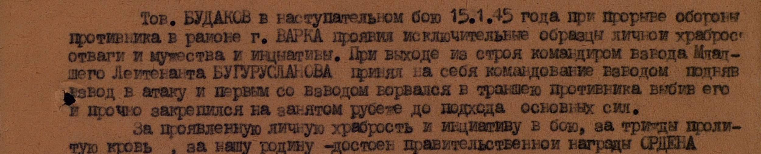 Будагов Исаак Дмитриевич. Родился 1 мая 1920 г.р. в с. Сафар-Хараба Цалкского района Грузинской СССР. Призван Минводском РВК. 1941.Зачислен в 692 кавалерийский батальон (СВ)-кавалерист август 1941г . 49 стрелковая дивизия 15 стрелковый полк(СВ)-стрелкок октябрь 1943г .212 стр. дивизия 669 стр. полк Командир станкового расчета (СВ) октябрь 1944г. 356 стр. дивизия 1183 стр. полк (СВ) ком. опер. сектор март 1945. Участник ВОВ с 1941-1945 г. в составе 1-го Белорусского фронта. Награжден Орденом "Красной Звезды"и медалью "За Отвагу".