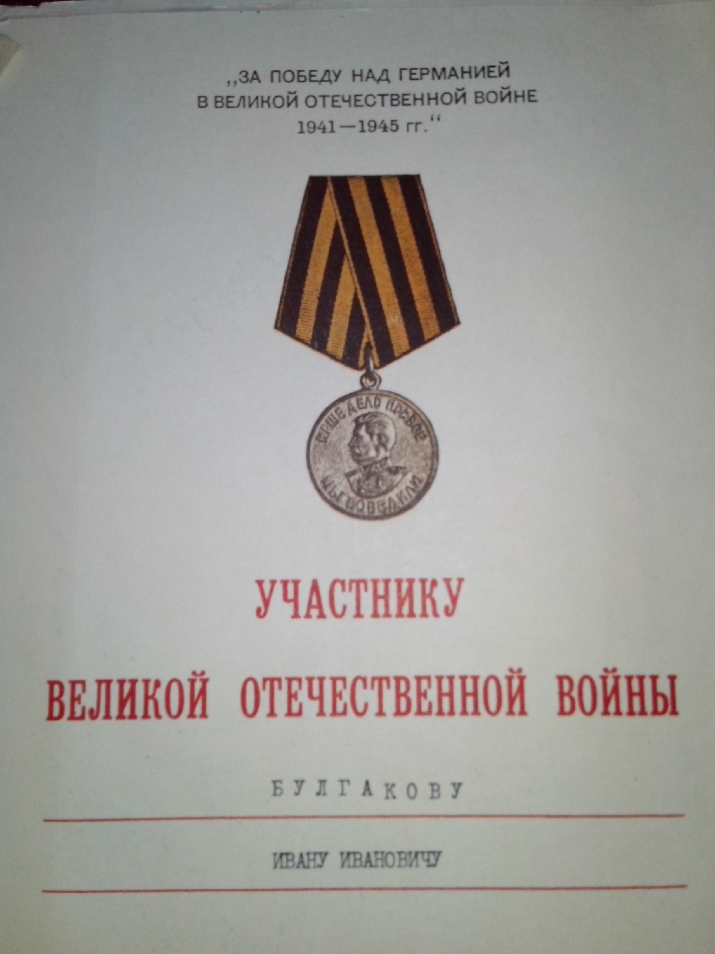 Мой прадедушка, Булгаков Иван Иванович (18.10.1926-27.12.2007г.г.) ушёл воевать, когда ему было 16 лет. Сражался с фашистами под командованием маршала Советского Союза Рокоссовского К.К. Служил связистом. Долгим и нелегким был его путь к Берлину. Первый бой, или как говорят, боевое крещение принял под Воронежем. Все три года он провел в окопах, на переднем крае. Голод, холод пришлось испытать, когда трое суток находился один в поле, чтобы восстановить связь. Участвовал в Висло-Одерской и Берлинской операциях. В числе других на самодельном плотике форсировалреку Одер.