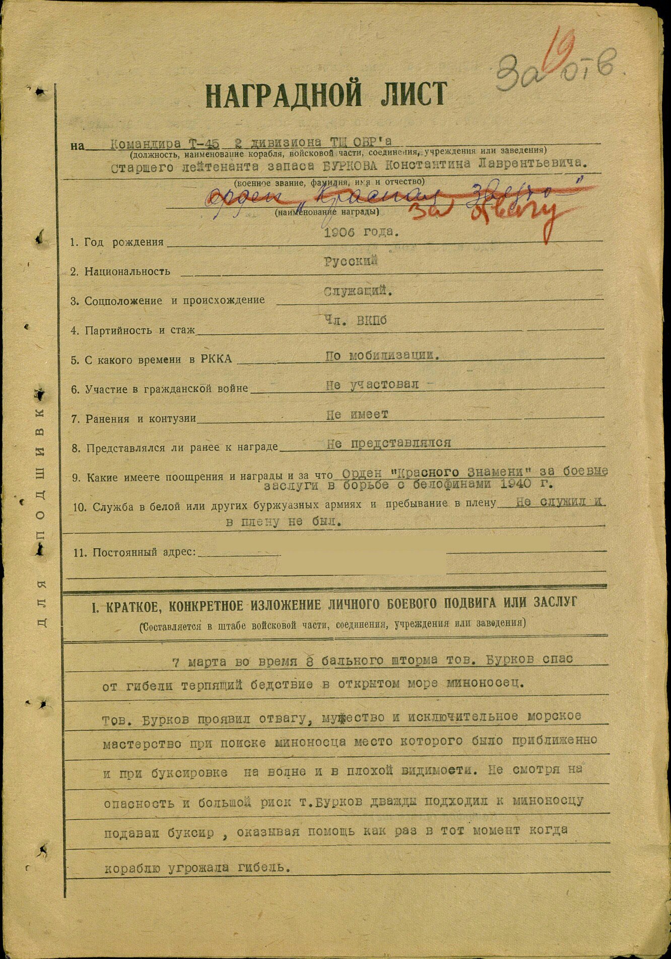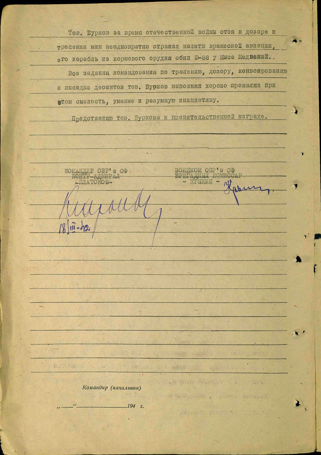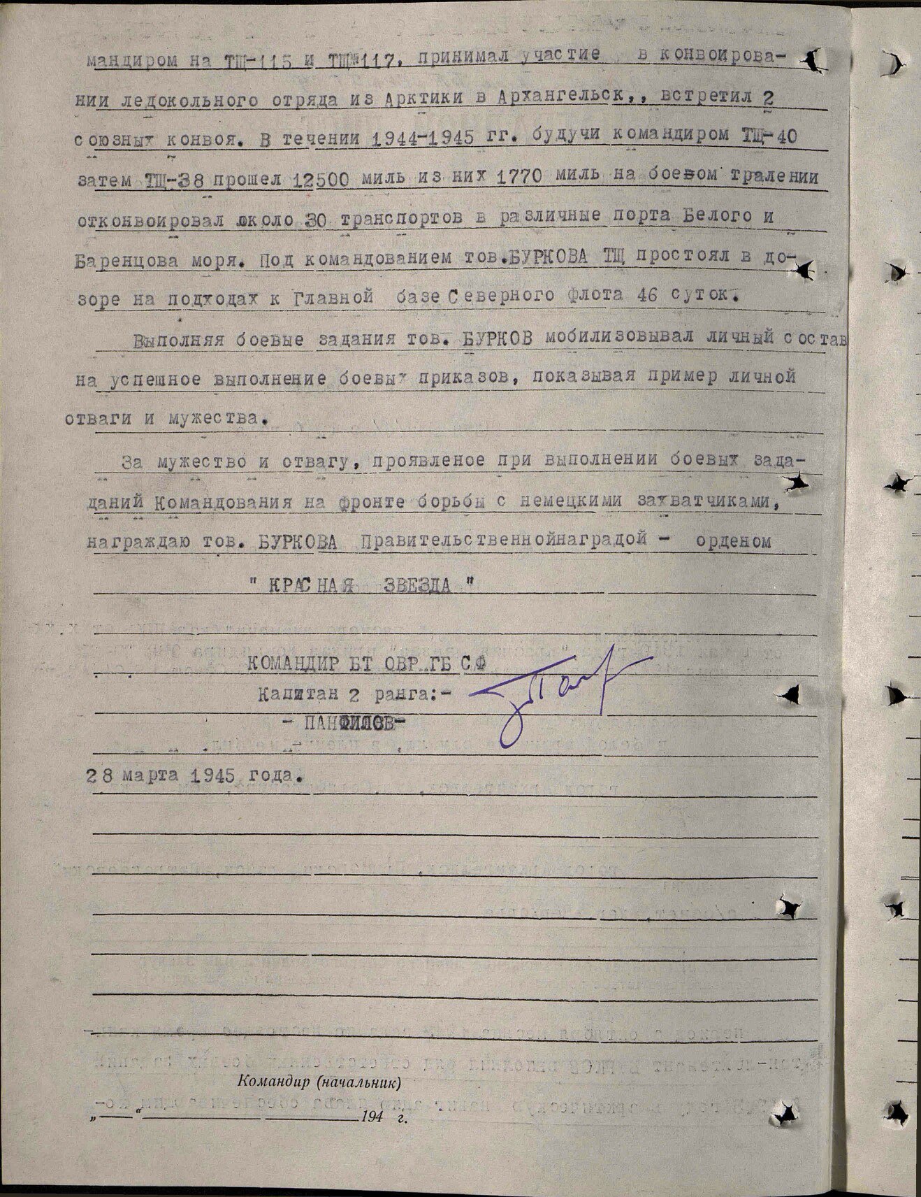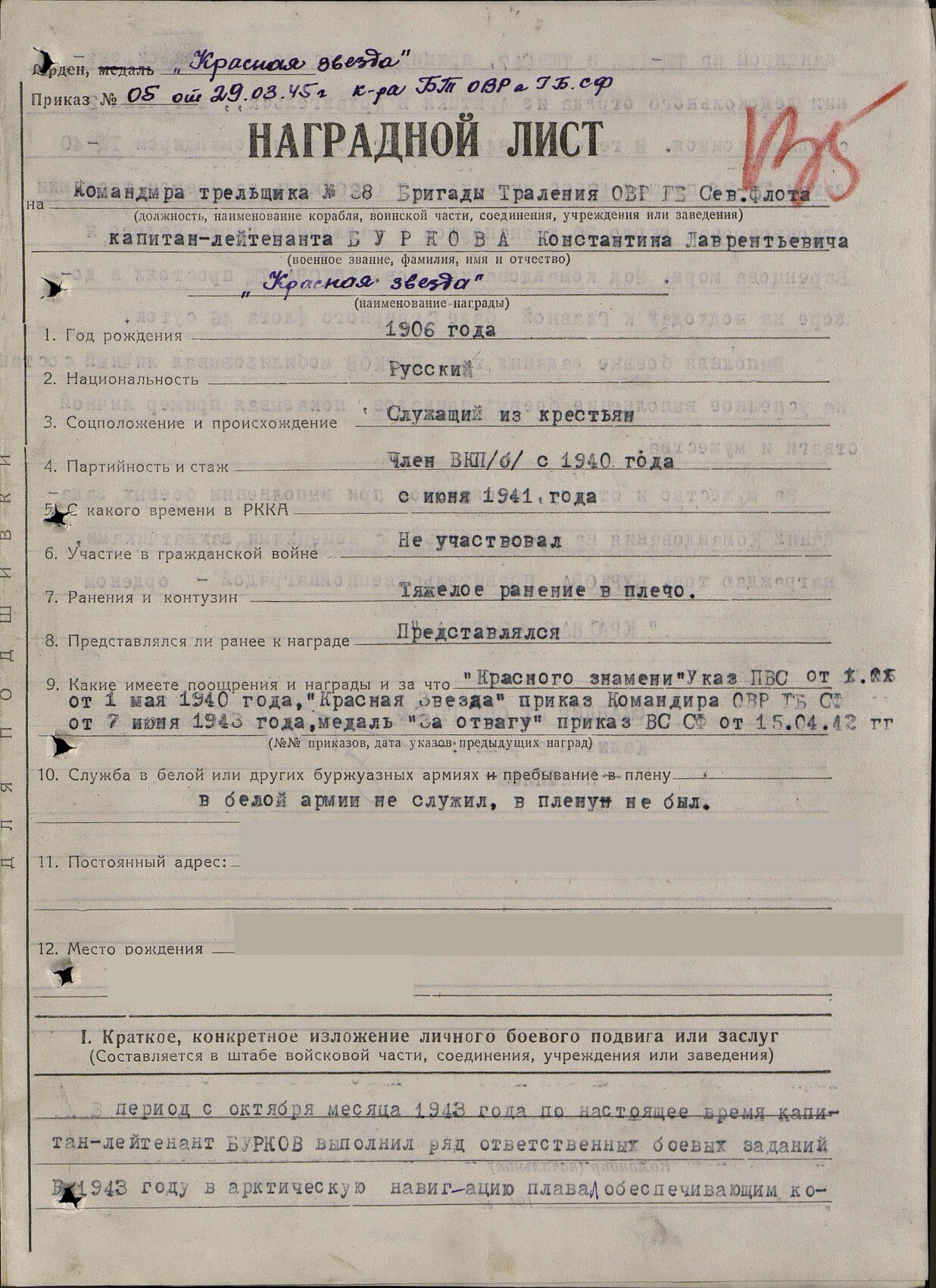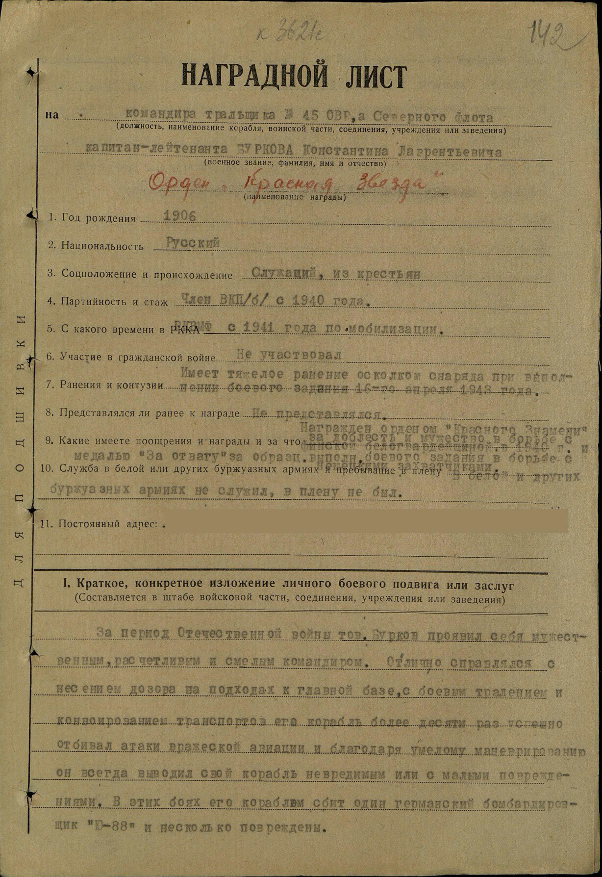 В начале Великой Отечественной войны, как и многие рыбаки, они были призваны на Северный флот вместе с судном. К.Л. Бурков с 3 августа 1941 года – командир корабля ТЩ-45, бортовой №899 (РТ-412 «Колгуевец») в звании старшего лейтенанта, а старпом Леонтий Шалегин - командир отделения рулевых, старшина 1-й статьи. Так они вместе и воевали. В 1943 году командир Бурков был тяжело ранен, его сменил на ТЩ-45 командир Кокотов. Константину Лаврентьевичу после излечения присвоено звание капитан-лейтенанта, командира корабля Северного военно-морского флота. Он снова в строю. 3 декабря 1943 года К. Бурков сменяет командира ТЩ-40, бортовой №894 (РТ-83 «Северный»), А.И. Сапогова. Александр Иванович Сапогов, тоже бывший капитан Архтралфлота. Приняв ТЩ-40, командир корабля К. Бурков участвует в боевых действиях на этом корабле. С 12 мая 1944 года Константин Лаврентьевич командир ТЩ-38, бортовой №884 (бывший РТ-29 «Киров» Мурманского флота), на котором продолжает воевать до дня Победы 9 мая 1945 года.