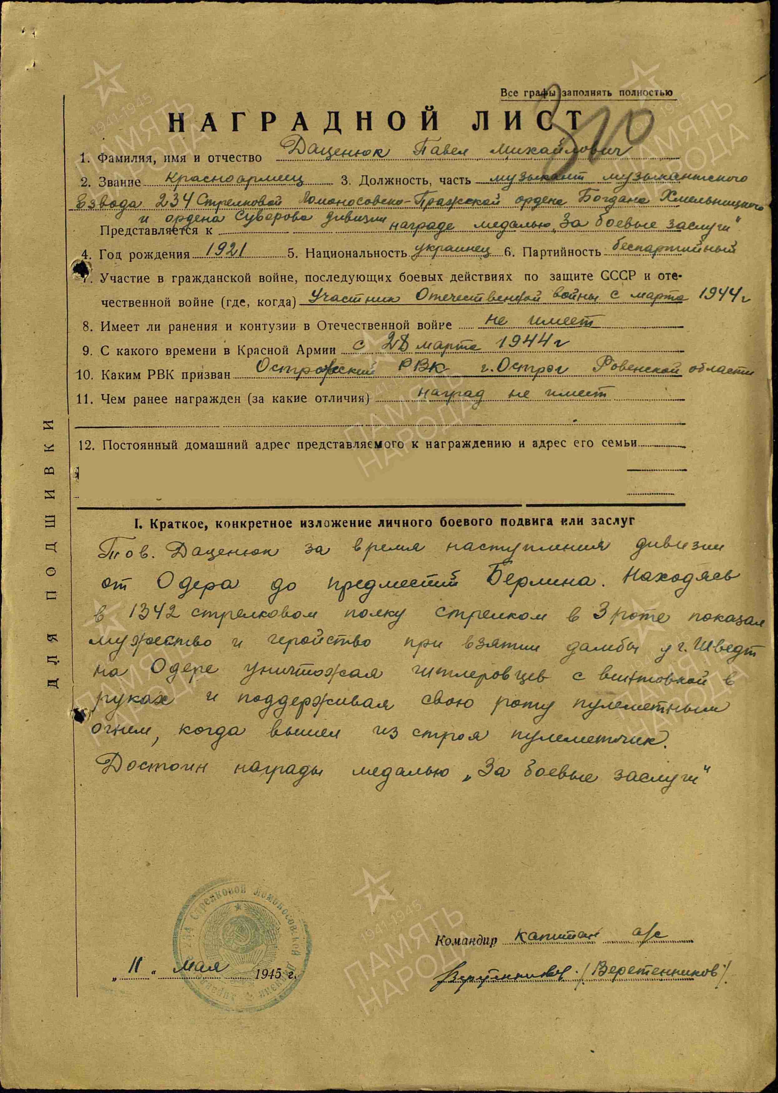 Получил следующие награды: За боевые заслуги За победу над Германией в Великой Отечественной войне 19411945 гг. Орден Отечественной Войны II степени За взятие Берлина