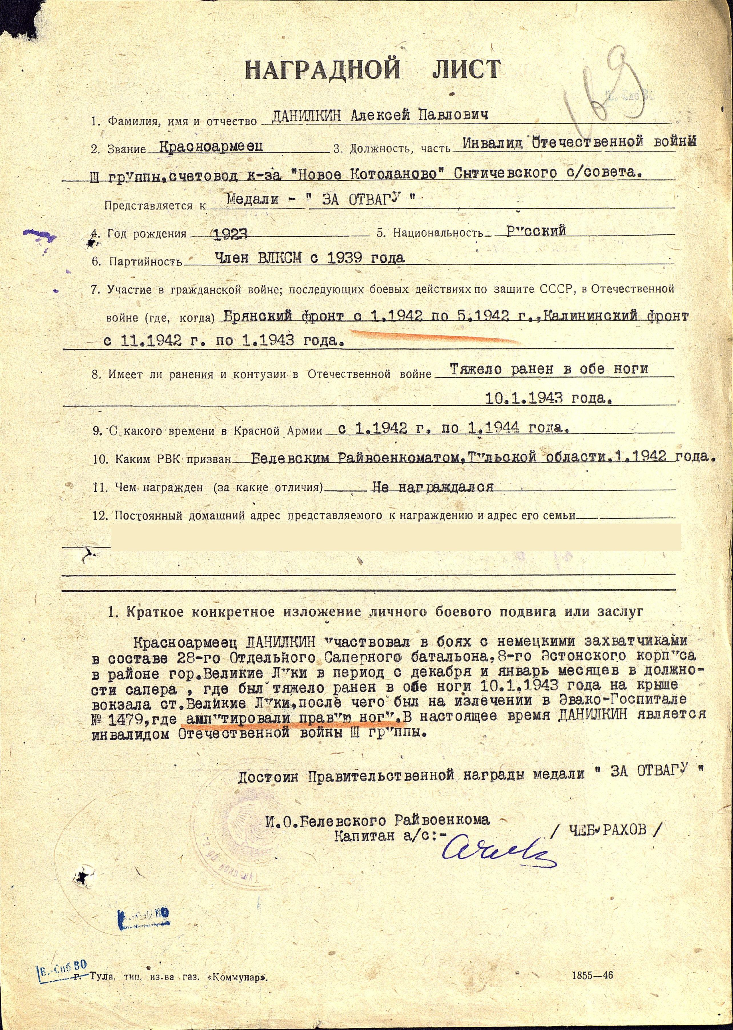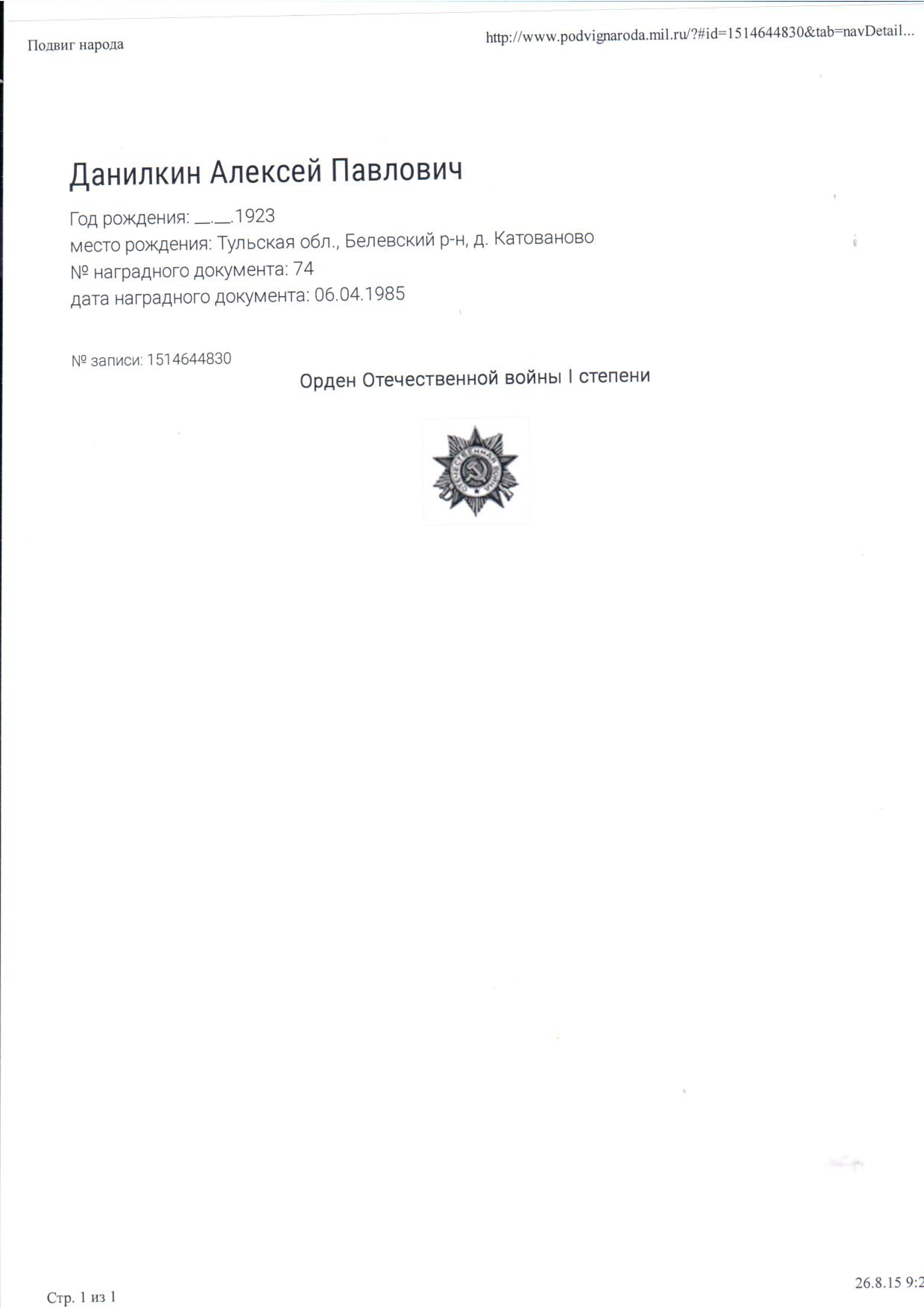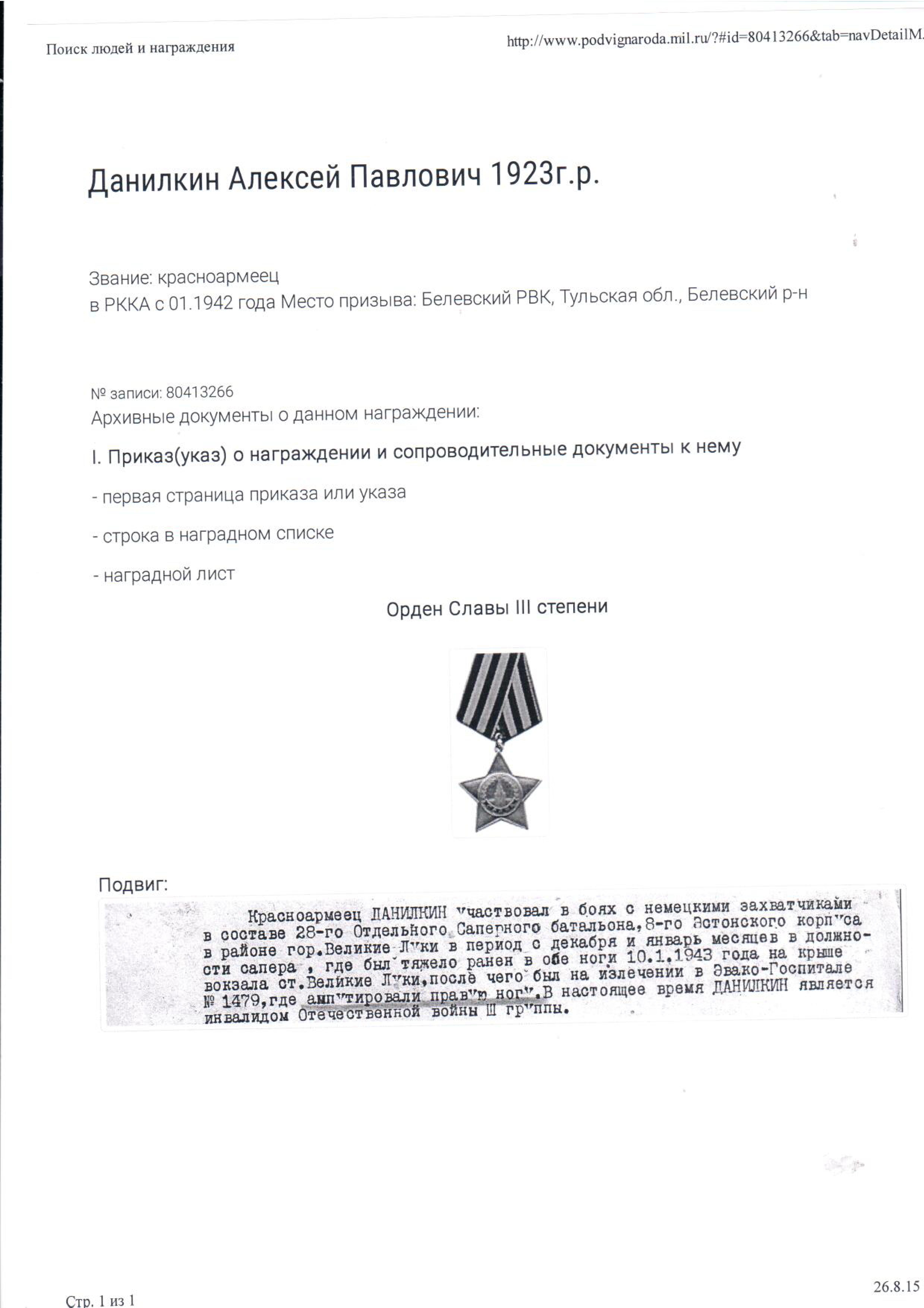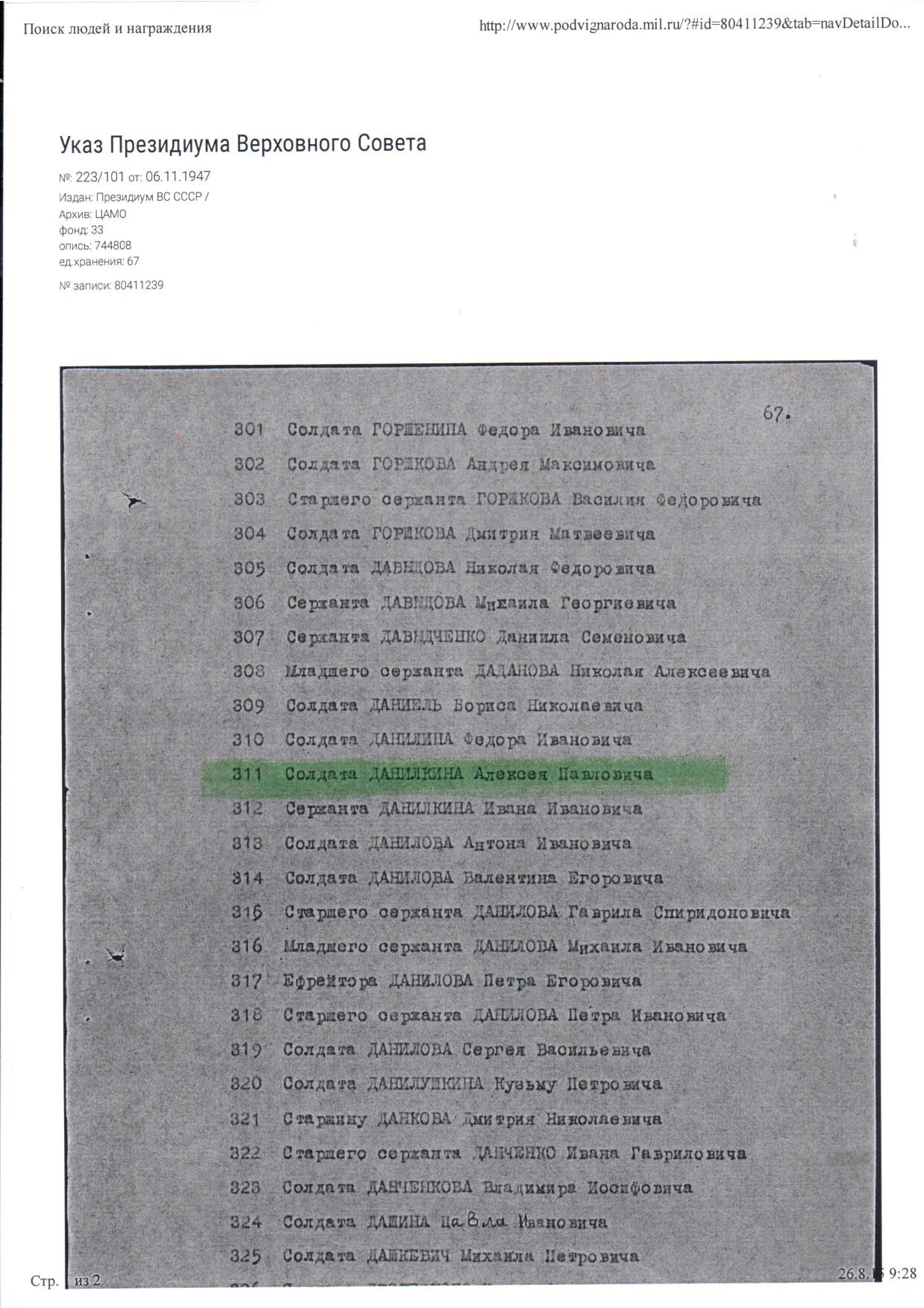 моего папы ДАНИЛКИНА АЛЕКСЕЯ ПАВЛОВИЧА.Родился 21марта 1923 года в