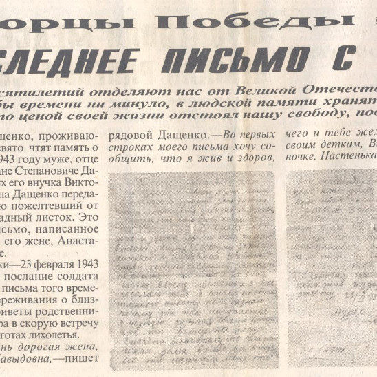 погибшем в 1943 году муже, отце и дедушке Иване Степановиче Дащенко. Внучка Виктория Викторовна Дащенко ХРАНИТ пожелтевший от